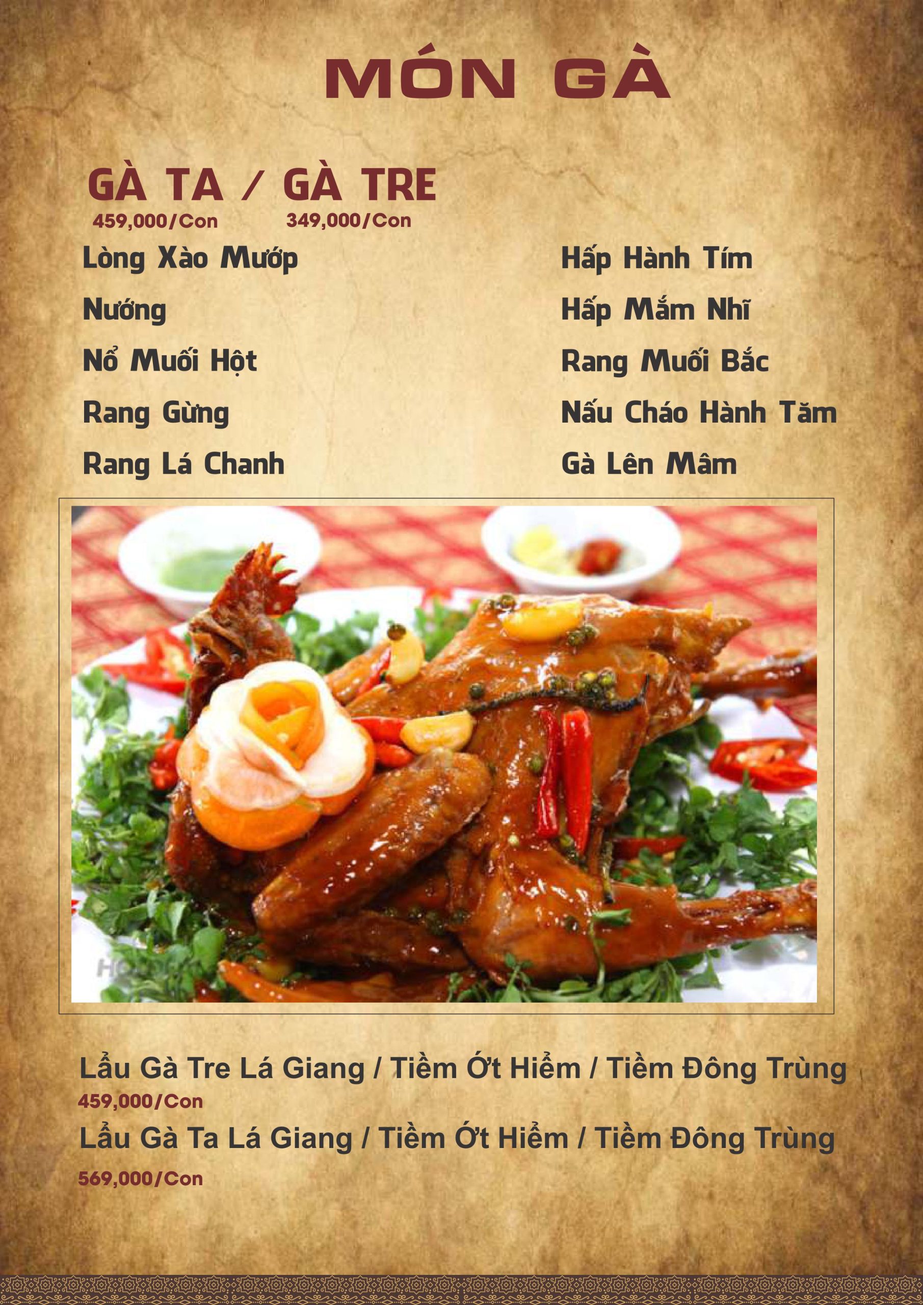 Các món từ gà, heo, cháo và miến là lựa chọn hợp lý cho gia đình. Những món này phù hợp với thực khách chuộng hương vị nhẹ nhàng, dễ ăn. Cháo gà, miến gà xé, gà hấp hành và heo quay giòn là những món được gọi nhiều. Nhiều khách đánh giá cao sự hài hòa trong gia vị và cách chế biến tinh tế của quán.