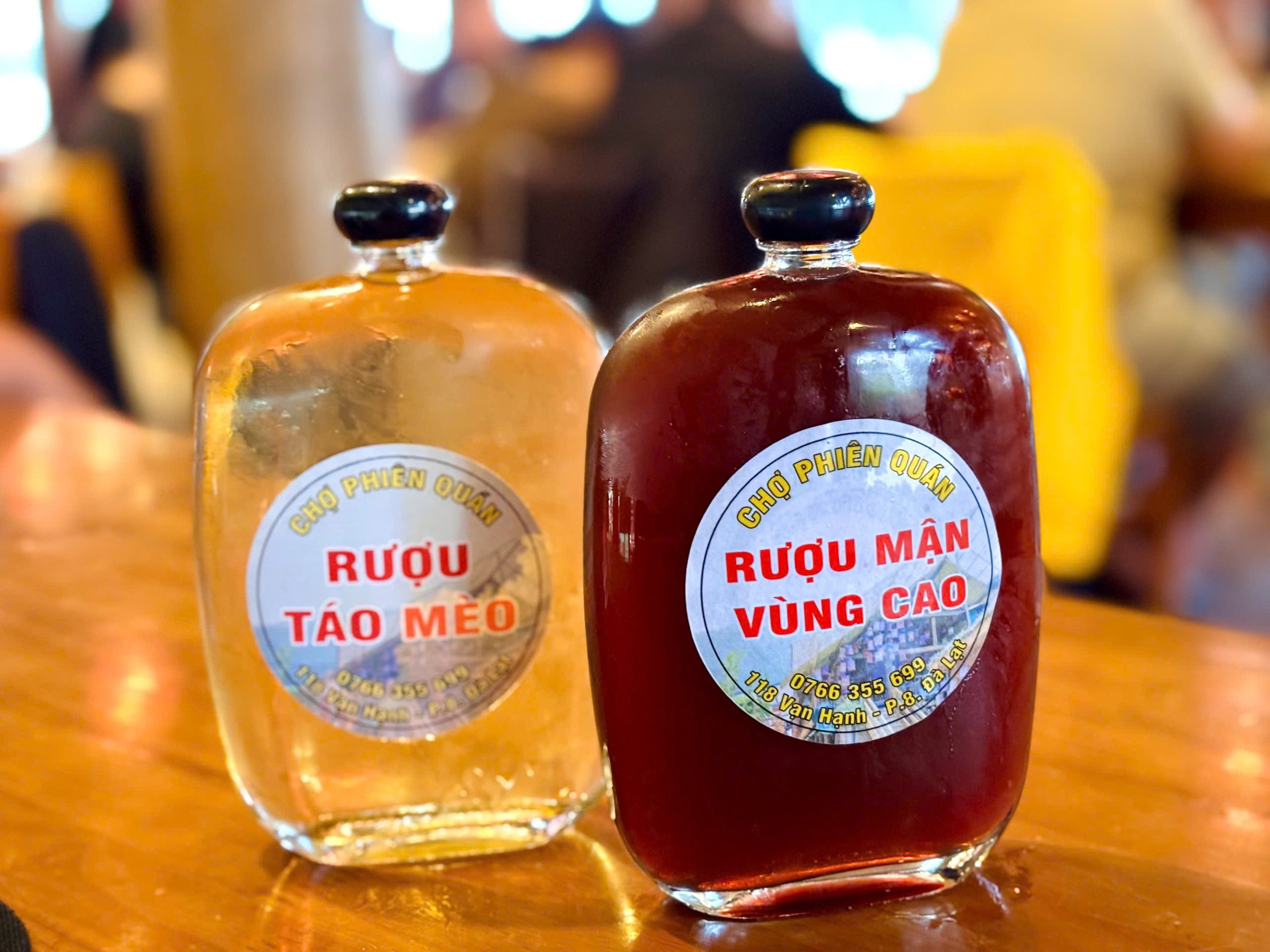 Bên cạnh món ăn, đồ uống tại đây cũng mang màu sắc vùng cao. Rượu táo mèo và rượu mơ là hai lựa chọn được nhiều khách thử khi đến quán.