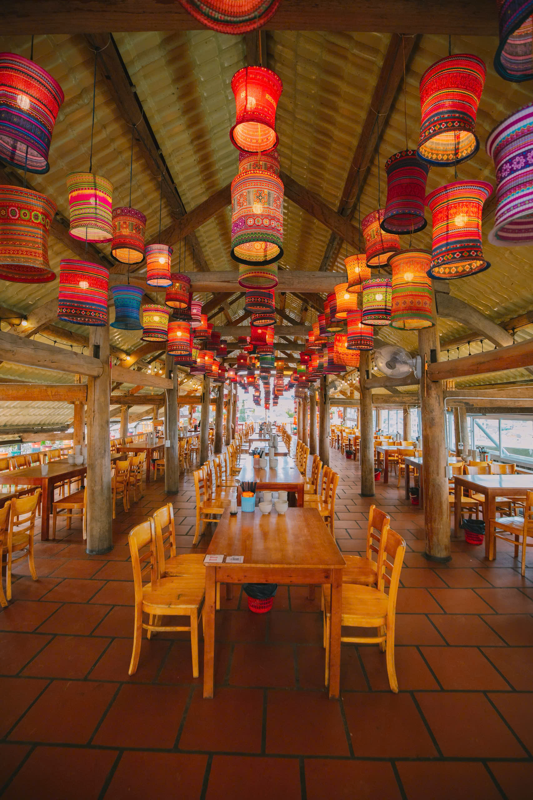 Không gian tại Chợ Phiên Quán là yếu tố khiến nhiều người nhớ nhất. Nhà hàng được xây dựng theo kiểu nhà sàn gỗ, kết hợp cùng các chi tiết trang trí thổ cẩm, đèn lồng và vật liệu tự nhiên.