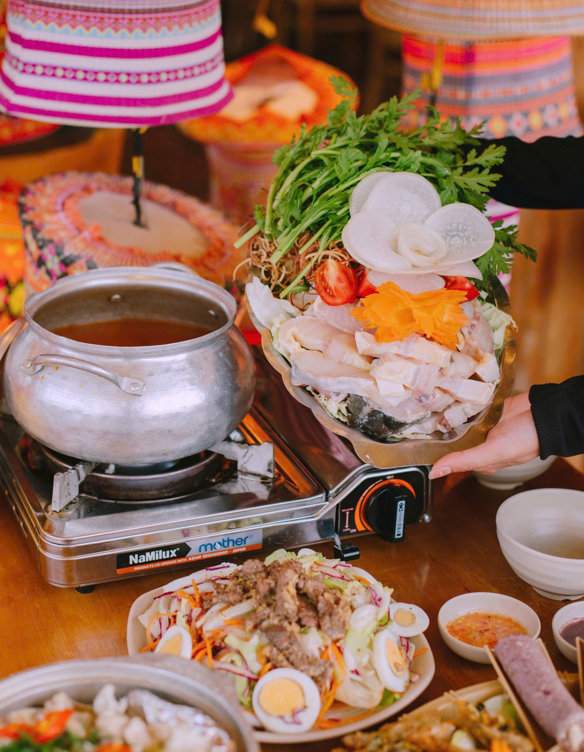 Lẩu cá tầm là lựa chọn phổ biến khi đi nhóm. Nước lẩu thanh, không quá nặng gia vị, phù hợp với thời tiết lạnh của Đà Lạt. Đây là món dễ ăn và phù hợp với nhiều người.