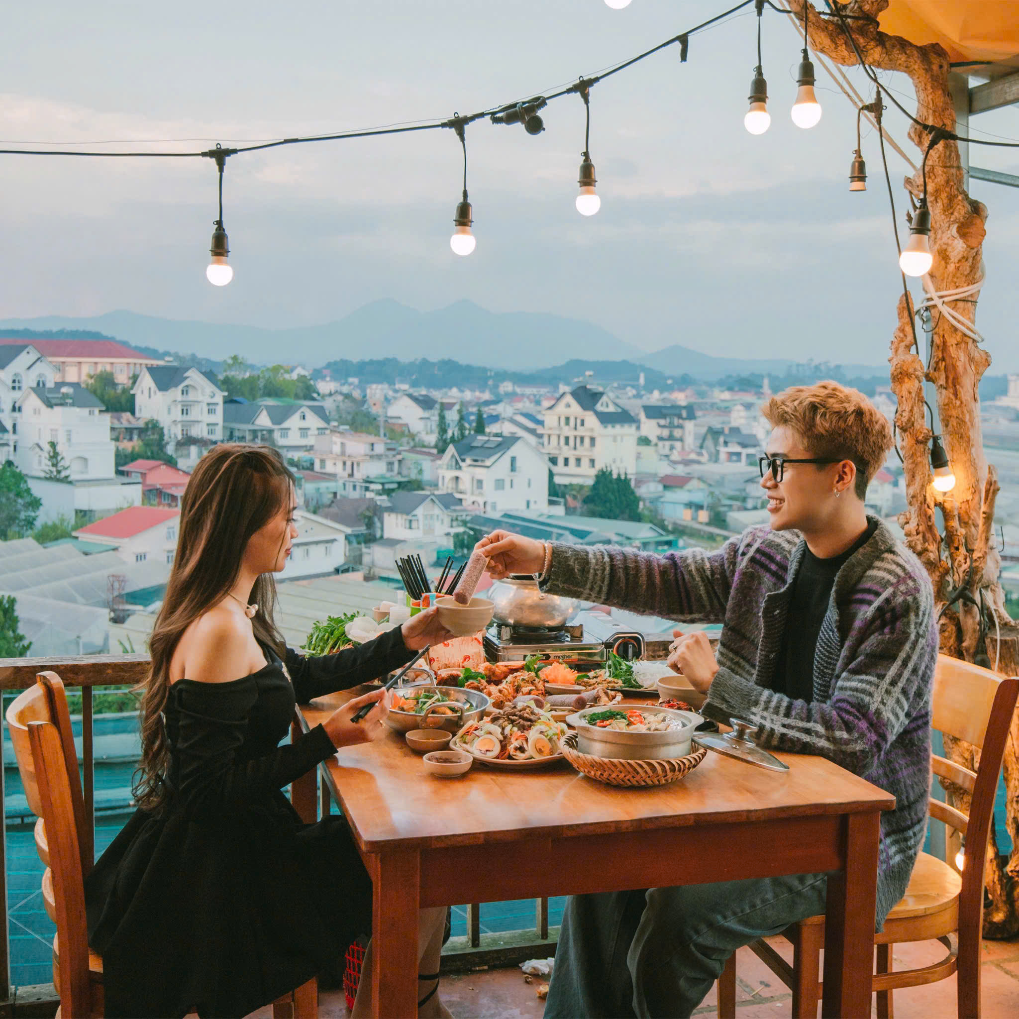 Một điểm cộng lớn là view nhìn ra thung lũng. Khi trời tối, ánh đèn và không gian xung quanh tạo nên một cảm giác rất “Đà Lạt”. Đây là kiểu không gian mà bạn có thể ngồi lâu, ăn chậm và tận hưởng.