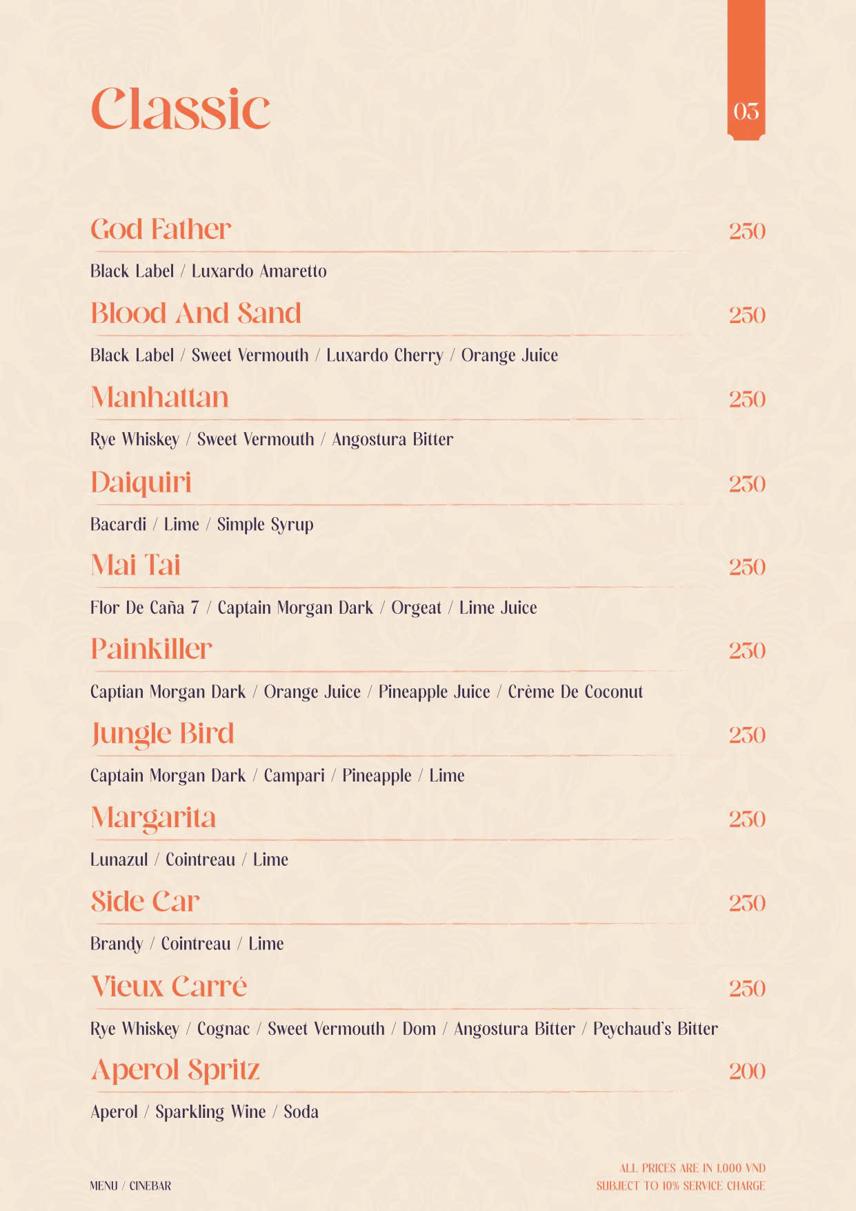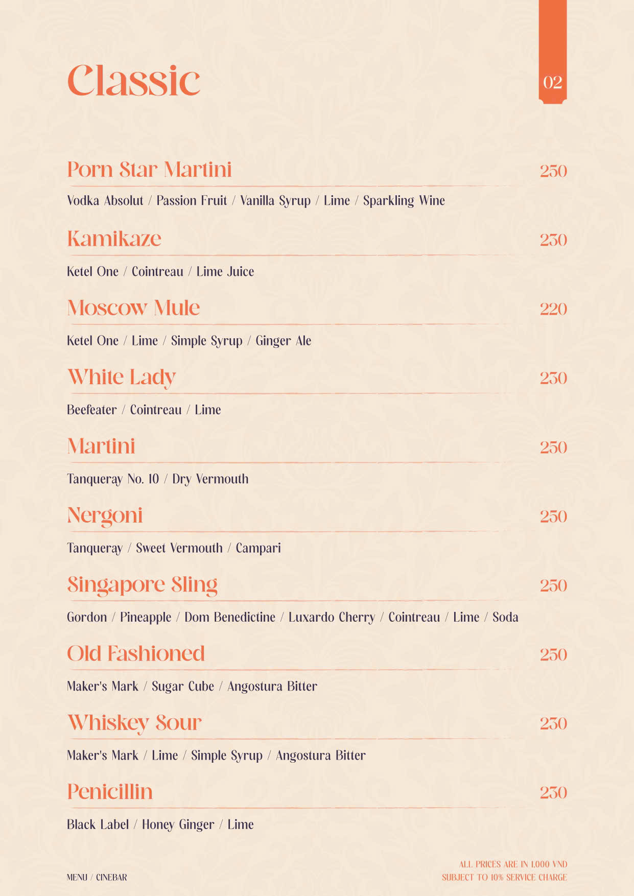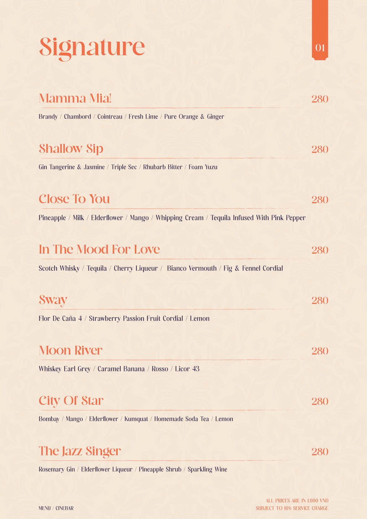 Menu tại Cinebar Cocktail & Wine được xây dựng như một kịch bản cảm xúc, nơi mỗi lựa chọn đều mang câu chuyện riêng. Tên gọi lấy cảm hứng từ điện ảnh và âm nhạc, khẽ gợi mở bầu không khí trước khi thưởng thức.