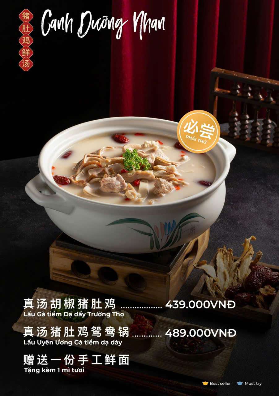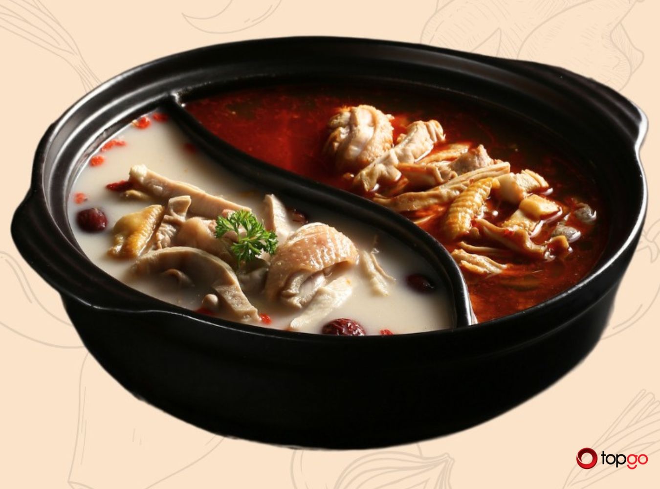 Nước lẩu được ninh chậm từ xương cùng thảo mộc, cho vị ngọt nhẹ, trong và dễ thưởng thức. Thịt gà mềm, dạ dày heo giòn sần sật tạo nên sự đối lập thú vị về kết cấu khi dùng cùng nước lẩu.