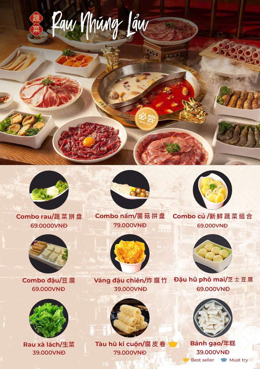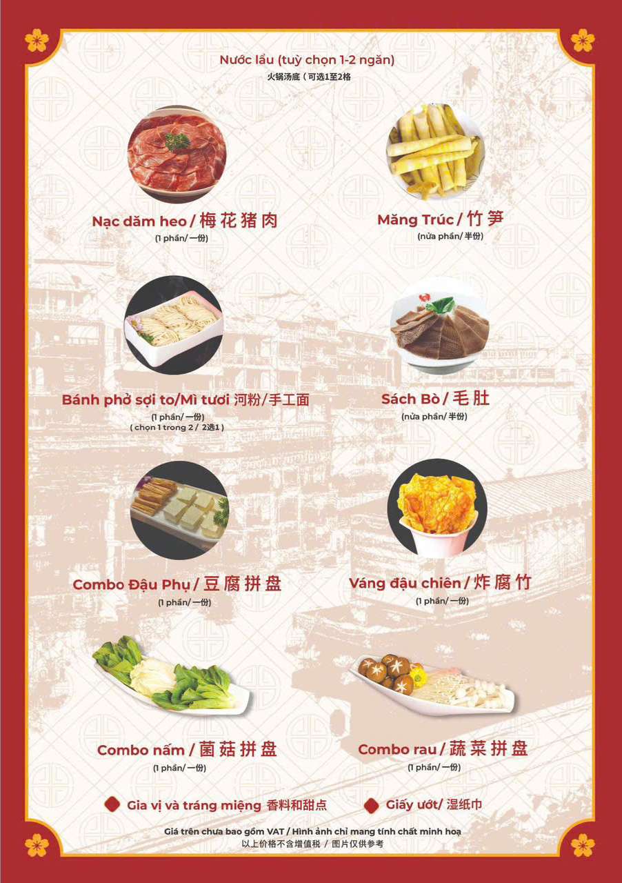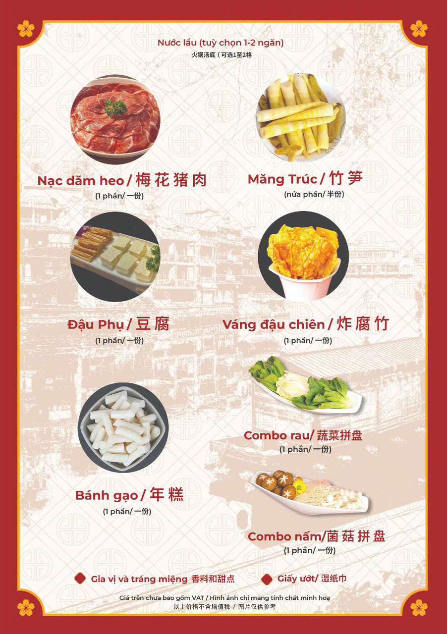 Nhóm rau, củ và nấm đa dạng, giúp nước lẩu thêm thanh và dễ thưởng thức trong thời gian dài. Các món nhúng đặc trưng như tàu hũ ki cuộn, bánh gạo và miến khoai lang mang đến kết cấu mềm, dai, tạo điểm nhấn khi dùng cùng nước lẩu đậm vị.