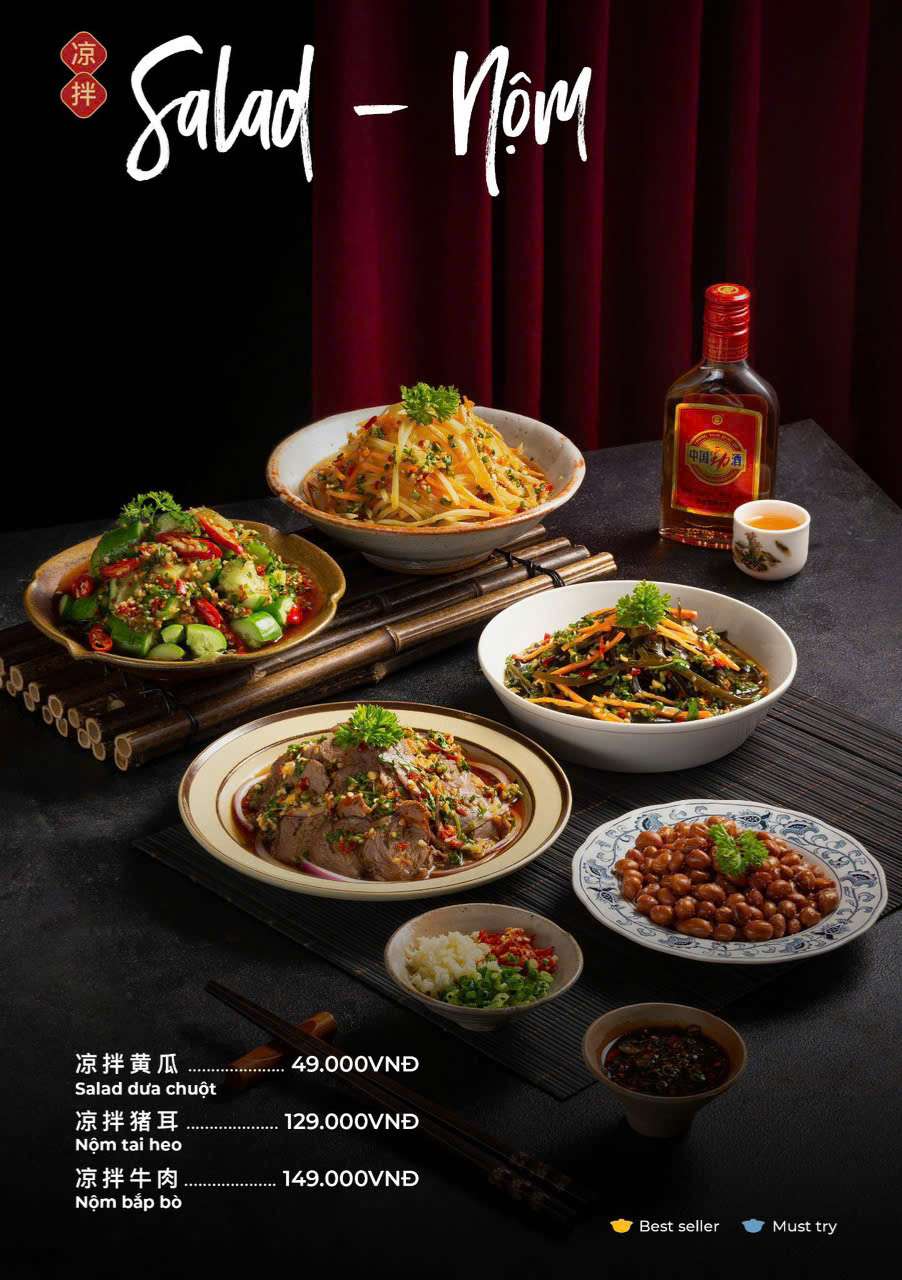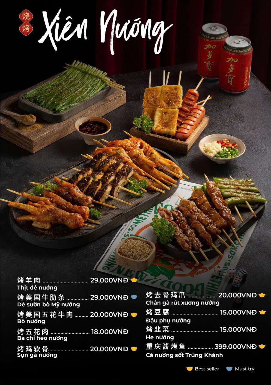 Thực đơn xiên đa dạng, từ thịt dê nướng, bò nướng đến ba chỉ heo nướng và sụn gà nướng. Bên cạnh đó còn có chân gà rút xương nướng, đậu phụ nướng, hẹ nướng và cá nướng sốt Trùng Khánh.