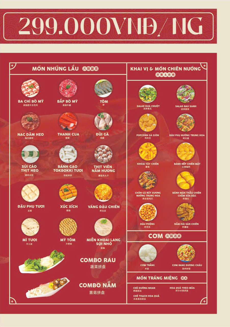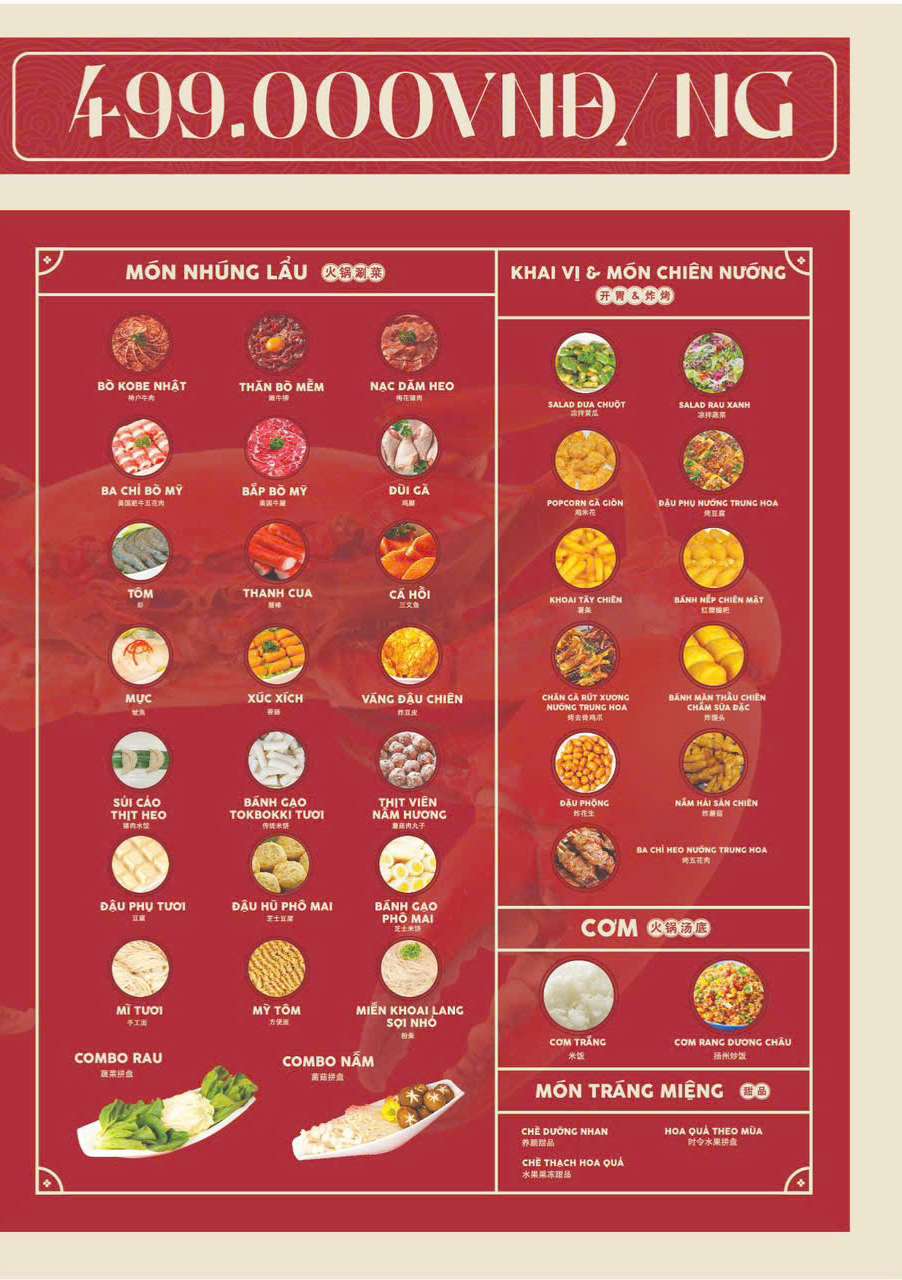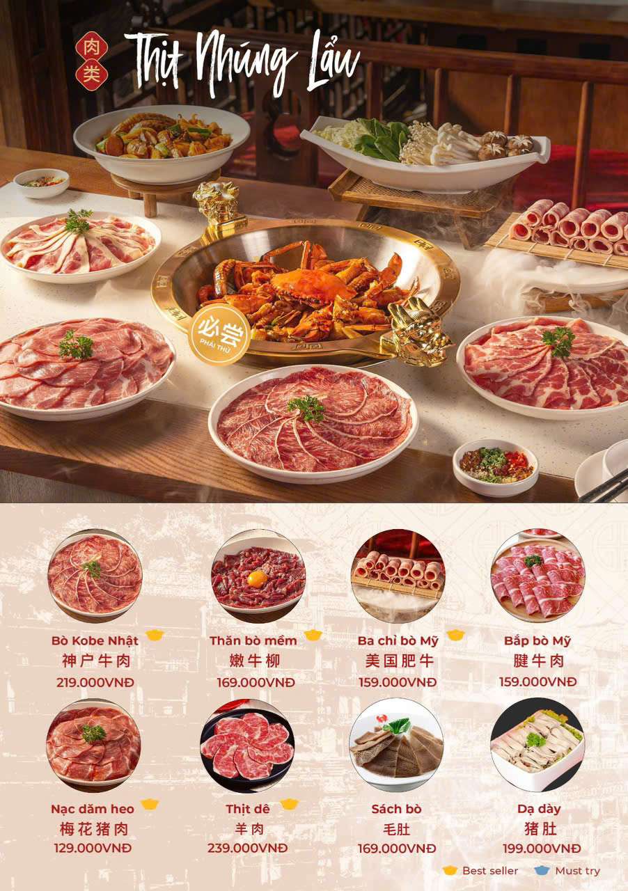 Phần thịt nhúng được chọn lọc kỹ, từ bò Kobe Nhật, thăn bò mềm đến nạc dăm heo và ba chỉ bò Mỹ. Bên cạnh đó còn có đùi gà, tôm, thanh cua, cá hồi và sủi cảo heo. Sự phong phú này giúp mỗi lần nhúng đều mang lại một cảm nhận khác biệt.