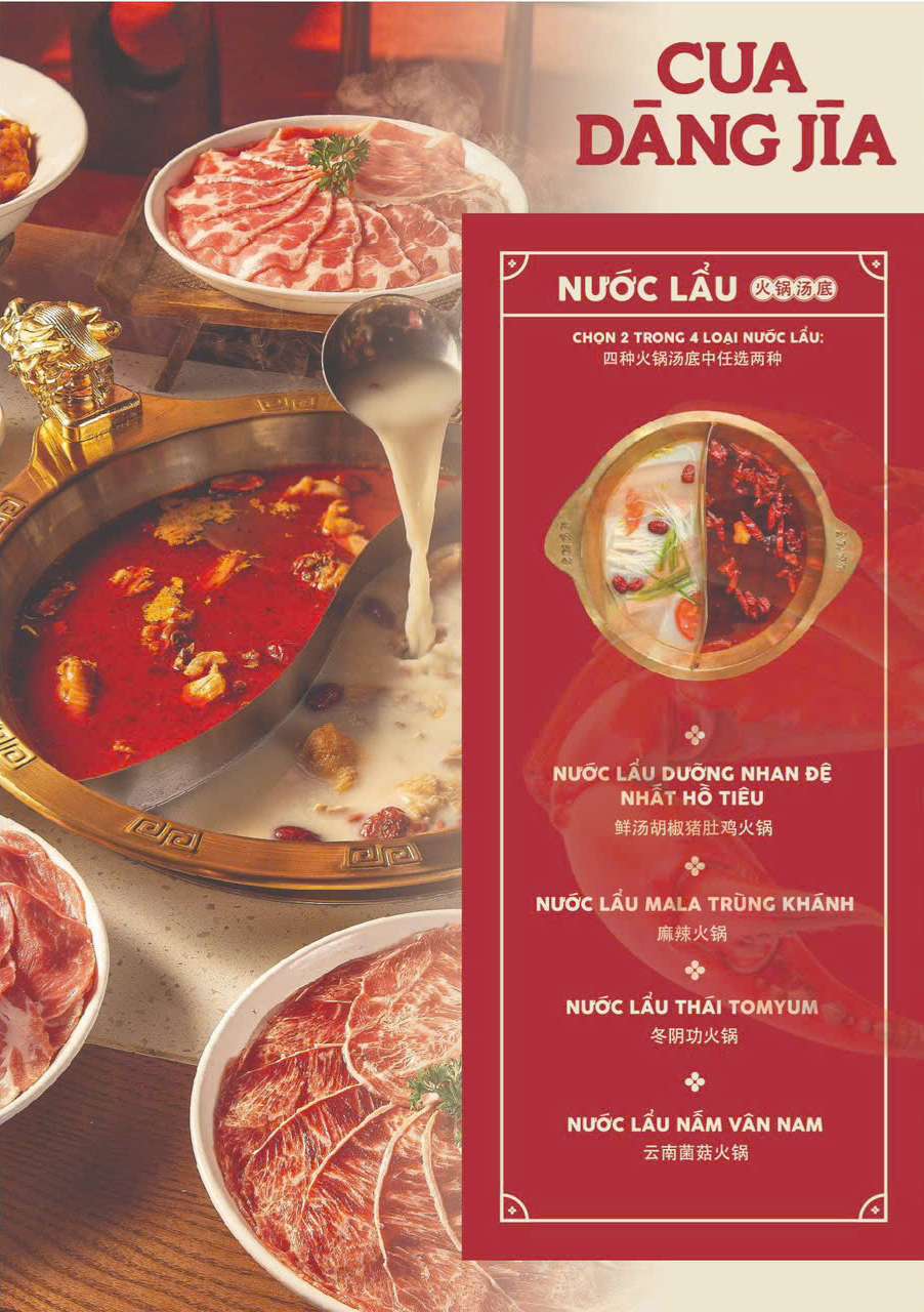 Đồ nhúng lẩu tại Cua Dang Jia Hoàng Ngân được xây dựng theo tinh thần cân bằng. Mỗi nhóm nguyên liệu đều có vai trò riêng trong tổng thể hương vị.