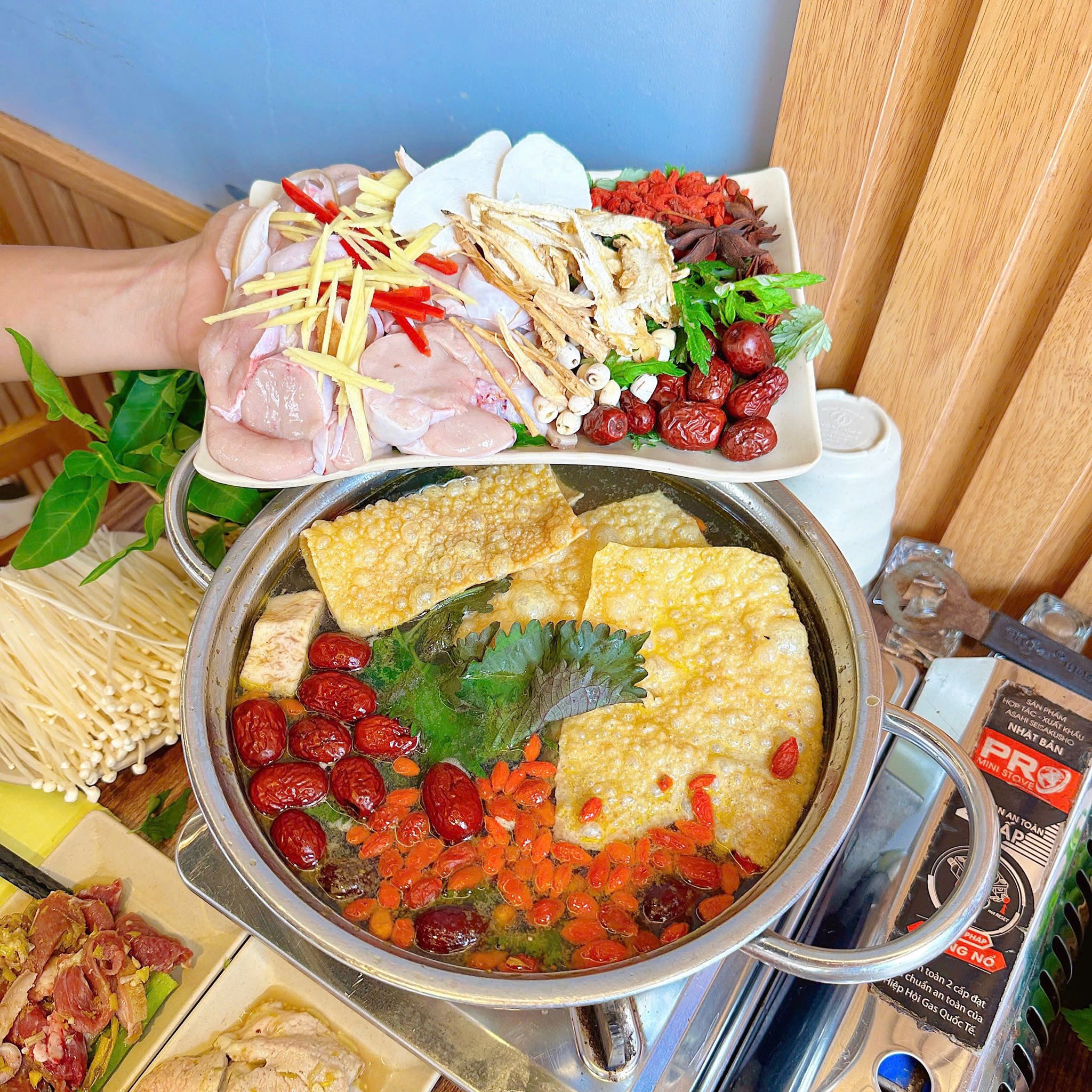- Nước nóng đậm đà, hầm từ xương dê trong nhiều giờ, thanh ngọt tự nhiên.