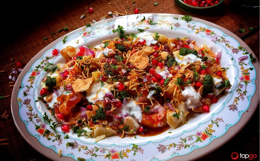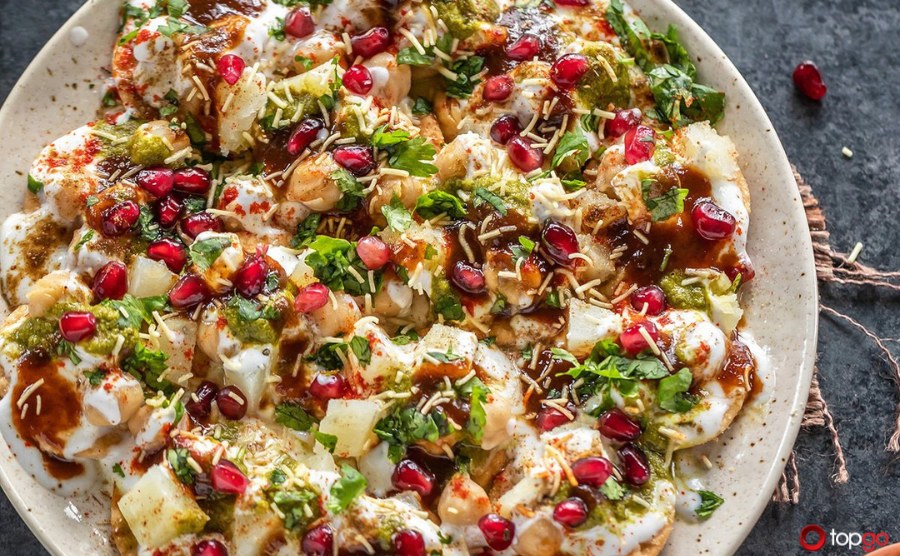 Bánh giòn kết hợp khoai tây, đậu gà, sữa chua và nước sốt me chua ngọt. Sự hòa quyện của các tầng vị cay, chua và béo tạo nên cảm giác mới lạ, hoàn hảo để kết thúc một bữa ăn phong phú.