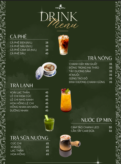 Đồ uống tại Ming Zhu được xây dựng theo định hướng dưỡng sinh rõ rệt. Thức uống đóng vai trò cân bằng tổng thể trải nghiệm ẩm thực. Trà lê hoa cúc mang vị thanh mát và dễ chịu. Thức uống phù hợp dùng trong nhiều thời điểm trong ngày. Cà phê cam sả tạo cảm giác tỉnh táo nhẹ nhàng. Hương vị vừa phải và không gây mệt. Trà sữa nướng Vân Nam mang hương vị đặc trưng riêng. Trà xí muội thích hợp dùng sau bữa ăn dược thiện. Đồ uống giúp thực khách thư giãn và thoải mái hơn.