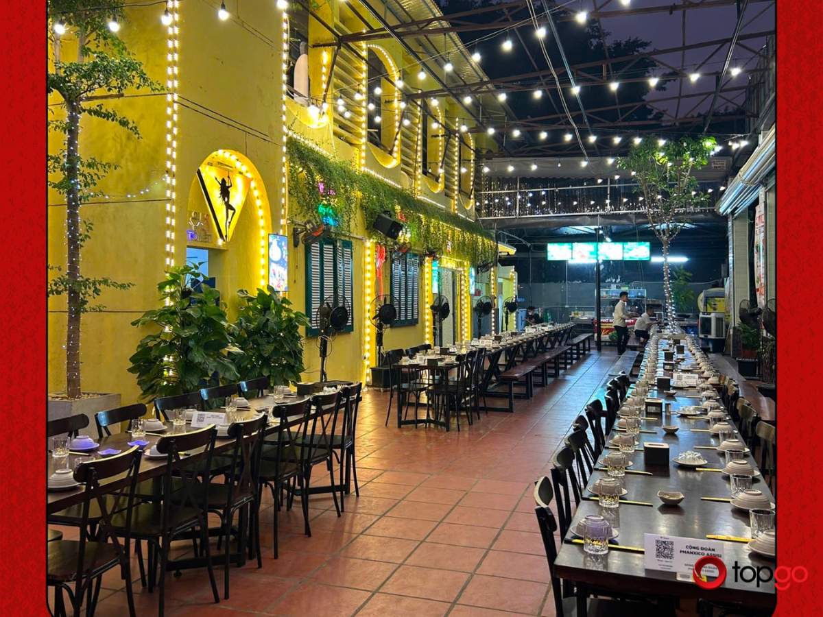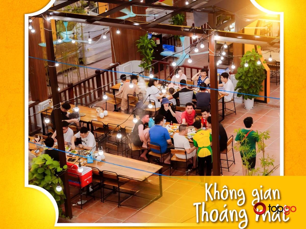 Không gian bên trong được chia theo từng khu, trong đó có khu vực riêng cho nhóm đông, phù hợp cho các buổi sinh nhật, họp lớp hay liên hoan công ty. Bàn ghế được sắp xếp linh hoạt tùy theo số lượng người, giúp buổi tụ tập diễn ra trọn vẹn và dễ chịu.