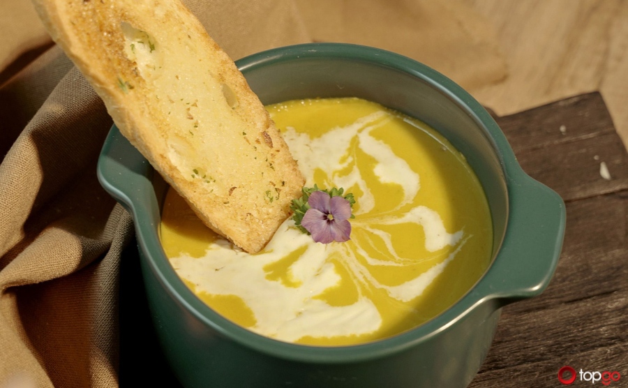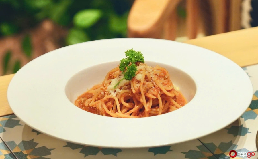 Một set tiêu biểu gồm súp bí đỏ hạnh nhân thơm ngậy, mì ý sốt bò bằm đậm vị, và salad Caesar tươi mát.