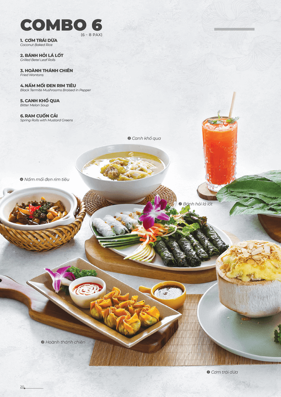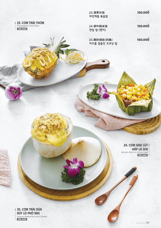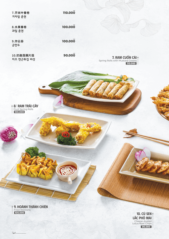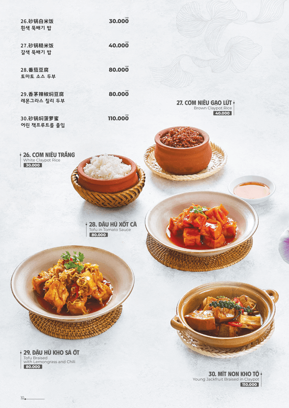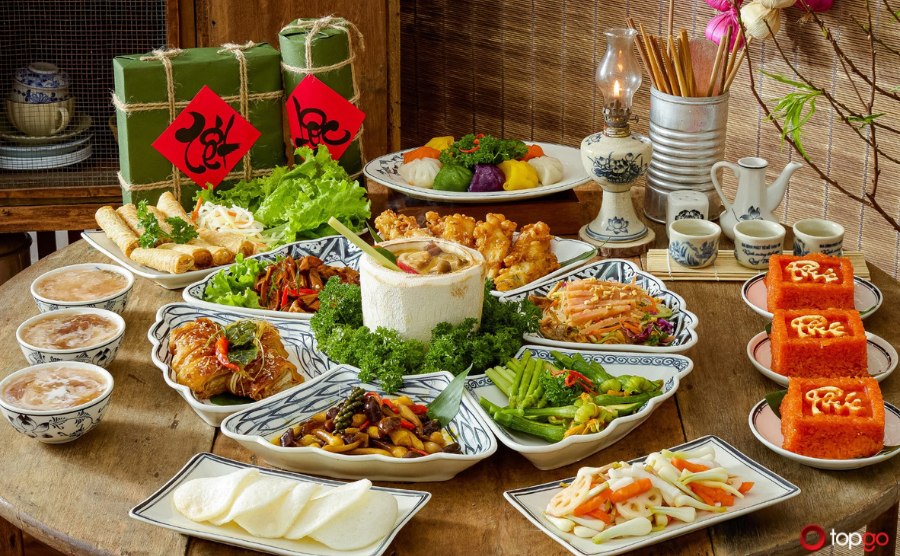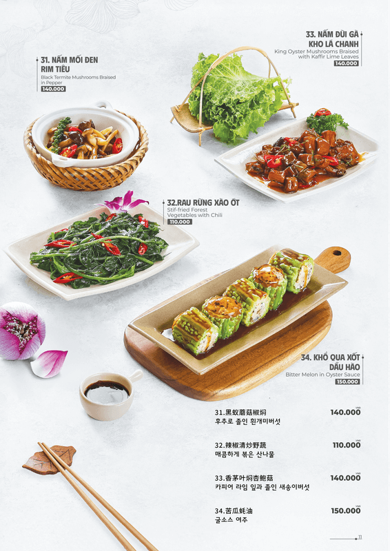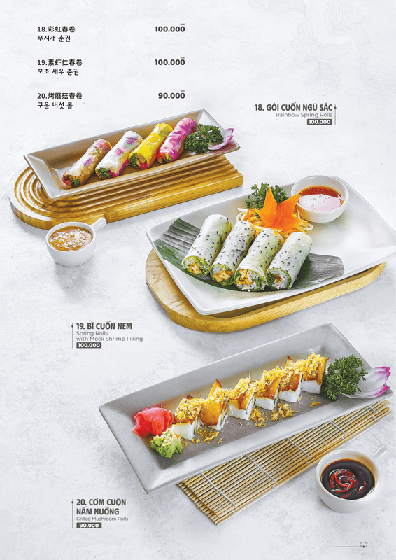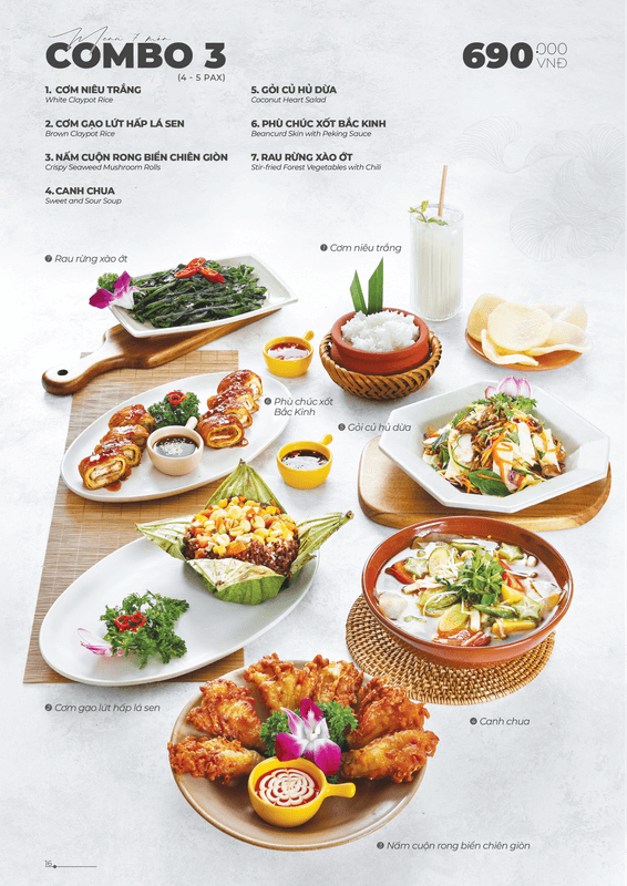 - Món ăn đặc trưng: gỏi cuốn ngũ sắc chay, hoành thánh chiên giòn cay, gỏi củ hũ dừa chay, há cảo chay ngũ sắc, cơm gạo lứt hấp lá sen, mít non kho tộ, lẩu chao khoai môn,….