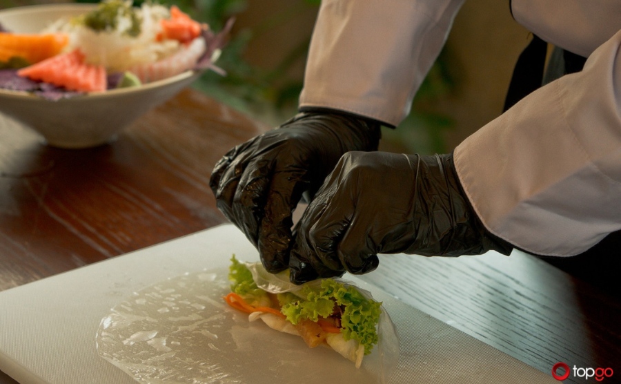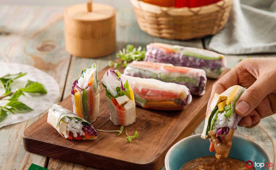Gỏi cuốn ngũ sắc chay là món khai vị nhẹ nhàng nhưng giàu dinh dưỡng. Rau củ tươi xanh nhiều màu sắc được cuộn khéo léo trong lớp bánh tráng mềm, chấm cùng nước sốt chua ngọt đặc trưng.