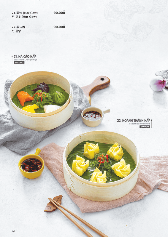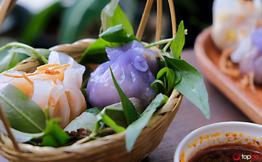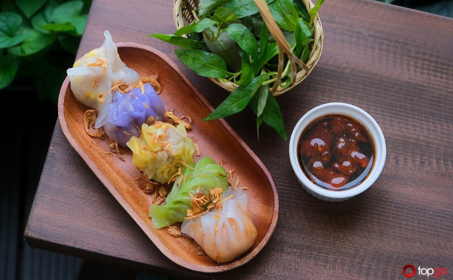 Há cảo chay ngũ sắc là một trong những món ăn thể hiện rõ sự tinh tế trong chế biến. Lớp vỏ mỏng mềm ôm lấy phần nhân rau củ nhiều màu sắc, tạo nên sự hài hòa từ hình thức đến hương vị.