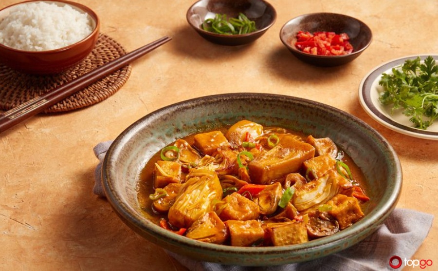 Nước xốt Bắc Kinh đậm đà hòa quyện cùng vị béo nhẹ của phù chúc tạo nên hương vị hài hòa, lạ miệng. Đây là một điểm nhấn đặc sắc trong thực đơn của Chay Ngọc Chi Bà Nà Hills, khiến thực khách cảm thấy vừa quen vừa mới khi thưởng thức.