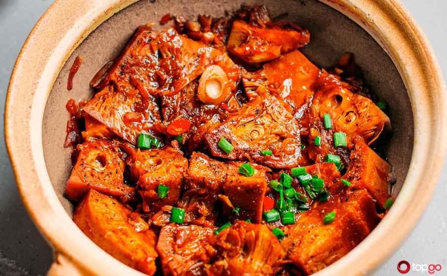 Mít non kho tộ là món ăn gợi nhớ bữa cơm gia đình ấm cúng. Mít non khi được kho cùng gia vị trở nên mềm và thấm đẫm hương vị.