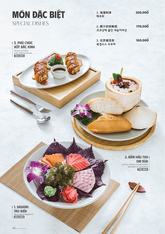 Thực đơn tại Chay Ngọc Chi Bà Nà Hills được xây dựng dựa trên sự kết hợp tinh tế giữa nguyên liệu tươi sạch và phong cách chế biến sáng tạo. Mỗi món ăn đều mang đến sự mới lạ nhưng vẫn giữ được hương vị thanh tao đặc trưng của ẩm thực chay.