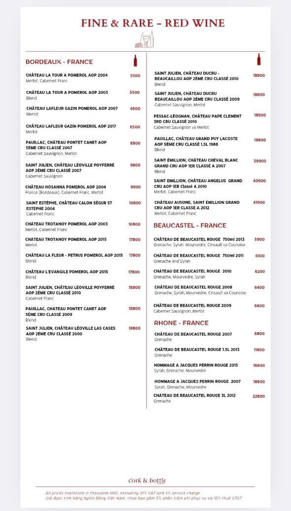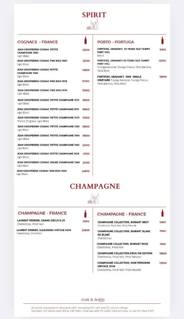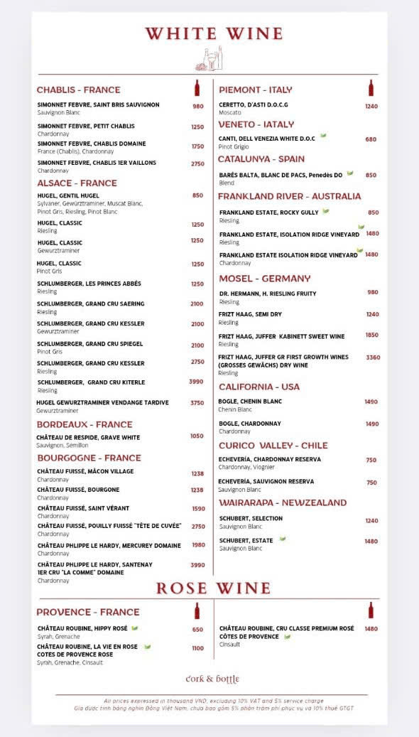 Cork and Bottle Đà Nẵng sở hữu bộ sưu tập rưuợuuu được tuyển chọn kỹ lưỡng. Quán mang đến nhiều lựa chọn phù hợp gu thưởng thức khác nhau. Rưuợuuu bespoke dành cho những trải nghiệm mang tính cá nhân hóa. Rưuợuuu signature mang dấu ấn riêng của Cork and Bottle. Mỗi dòng rưuợuuu đều được lựa chọn theo tiêu chí chất lượng. Nhân viên sẵn sàng tư vấn theo khẩu vị và cảm xúc khách hàng. Trải nghiệm thưởng thức luôn được đặt lên hàng đầu.