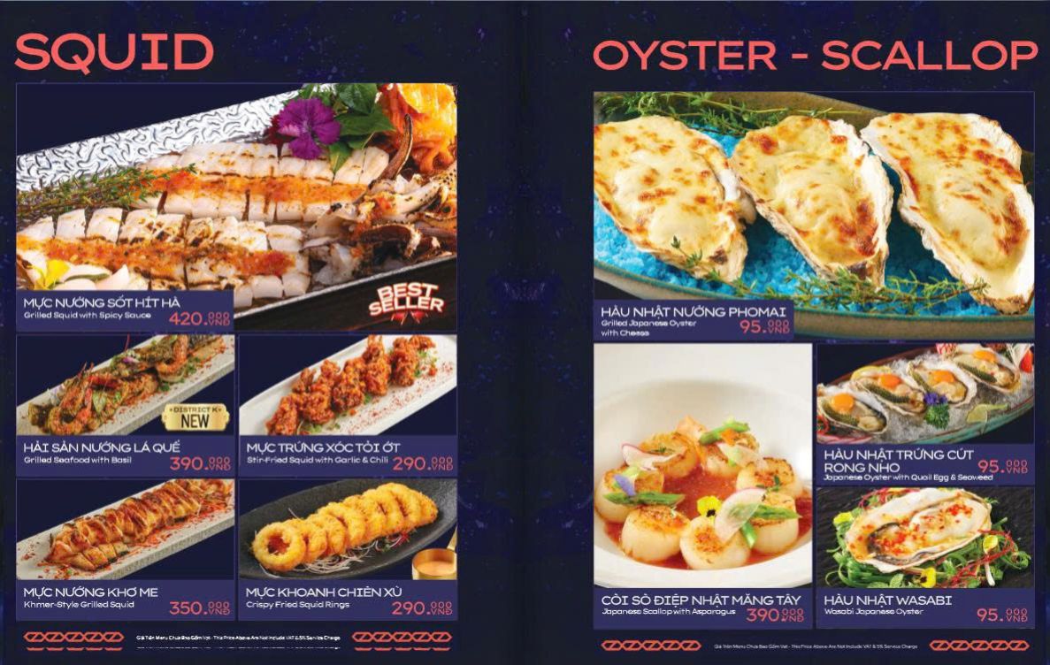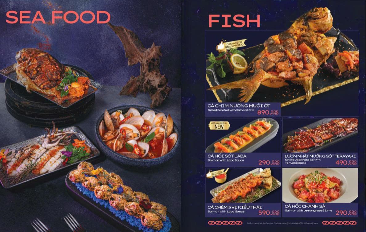 Hải sản cũng là thế mạnh của District K. Các món hải sản được chế biến đa dạng. Từ nướng, hấp đến các món sốt đặc trưng. Hương vị tươi ngon được giữ trọn trong từng món ăn.