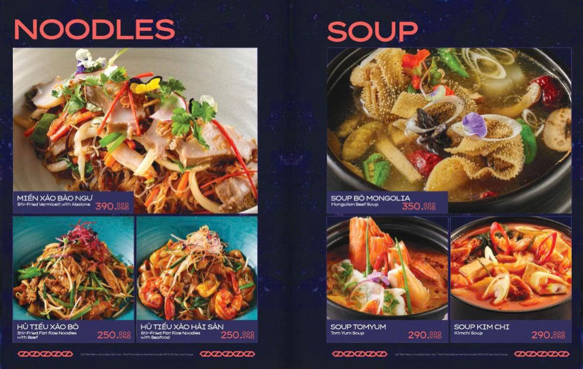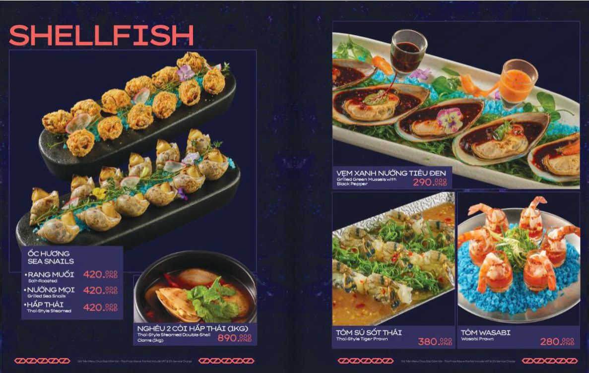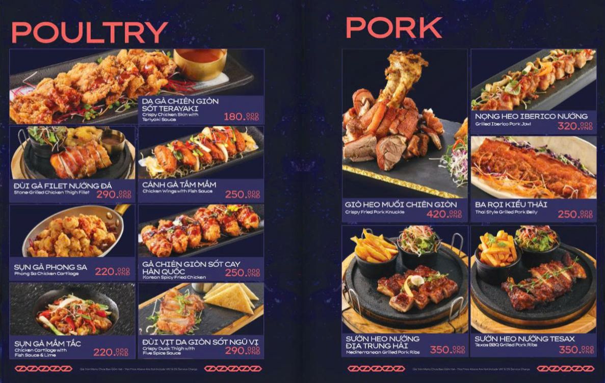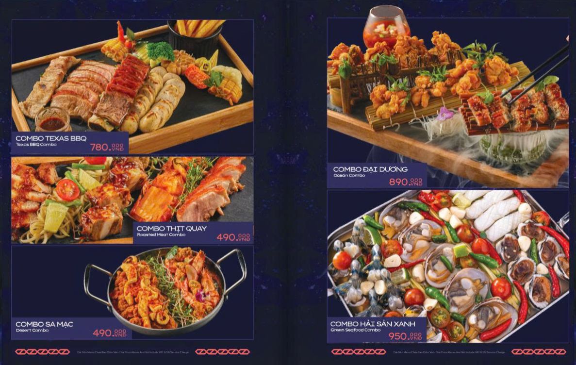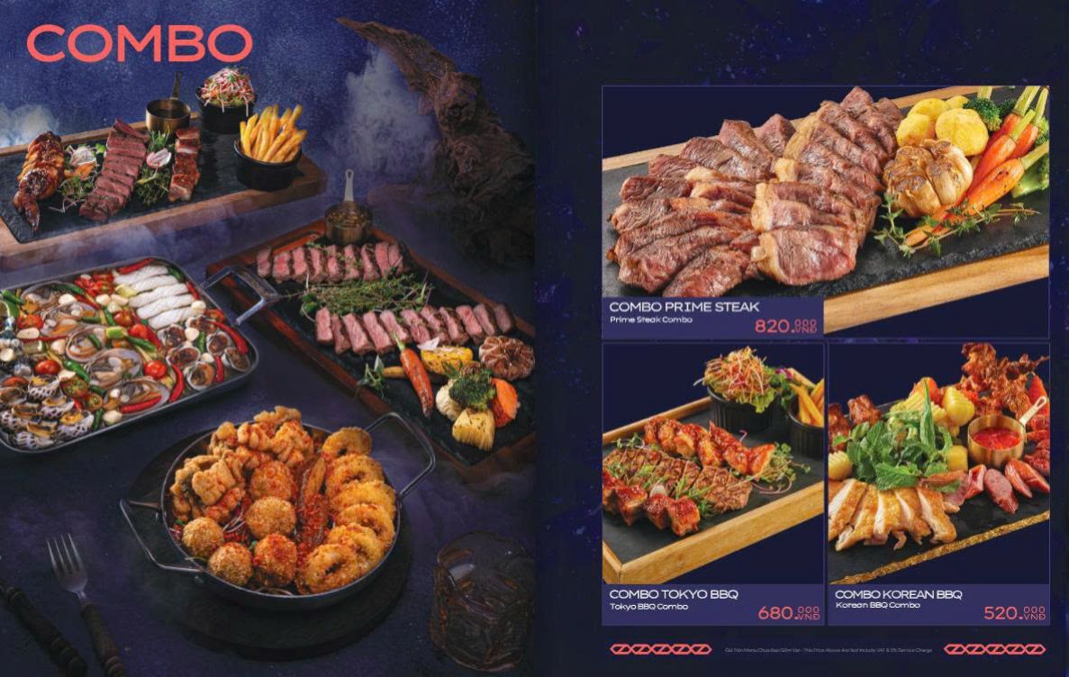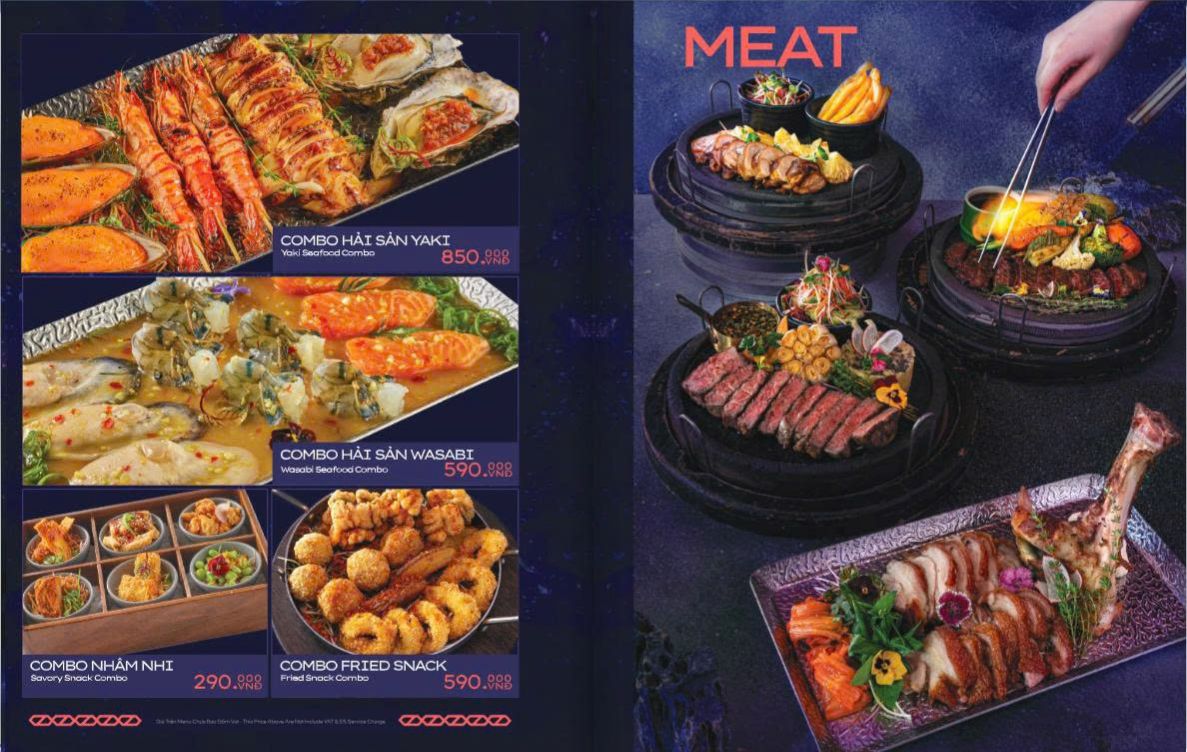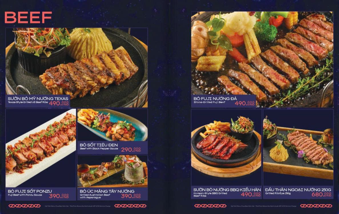 Thực đơn Á – Âu phong phú, gồm cả đồ nhậu, hải sản và món Âu. Các “món nhất định phải thử” gồm sườn bò nướng kiểu Texas sốt BBQ đậm đà, nem cua biển, mực nướng sốt hít hà, combo sashimi 9 món, steak các loại….