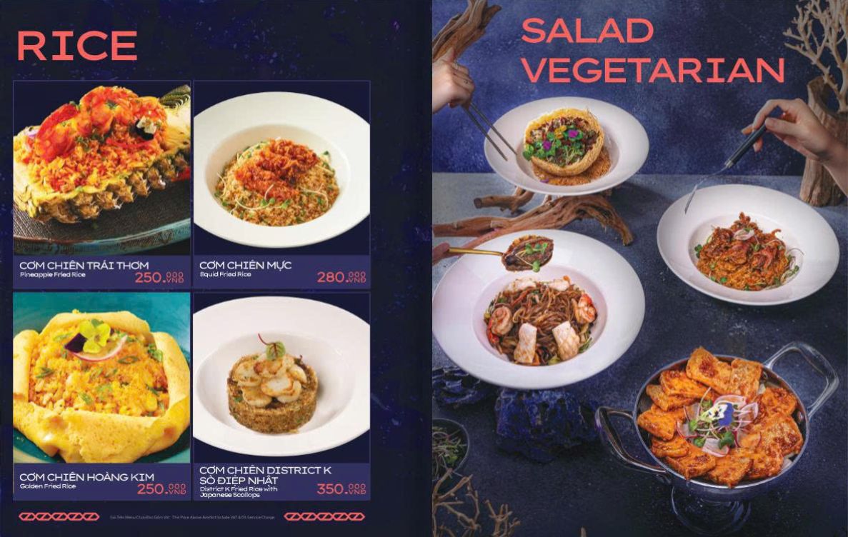 District K mang đến thực đơn đa dạng và phong phú. Nhà hàng phục vụ các món Á – Âu, từ những món quen thuộc đến những lựa chọn sáng tạo. Mỗi món ăn đều được chăm chút từ nguyên liệu đến cách trình bày.