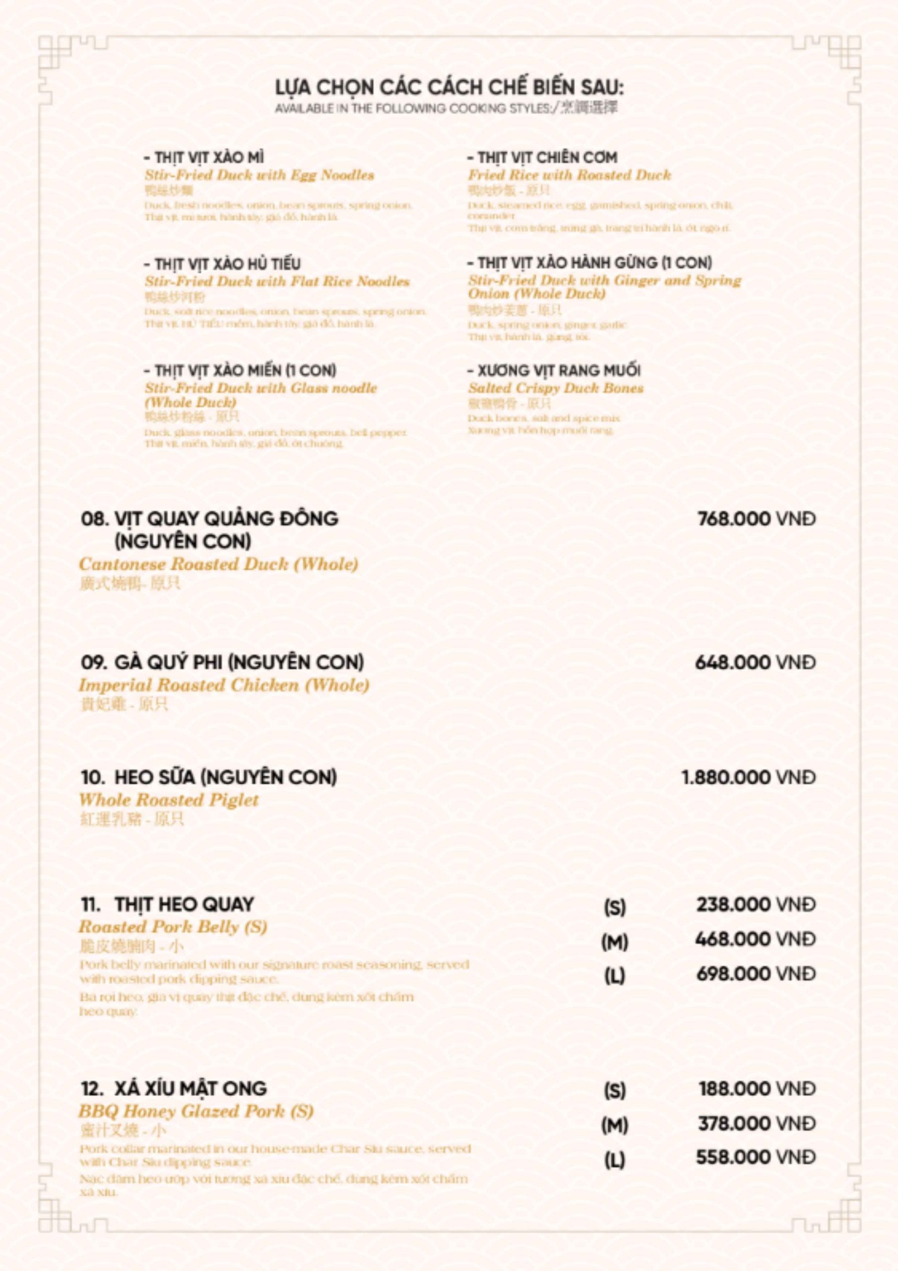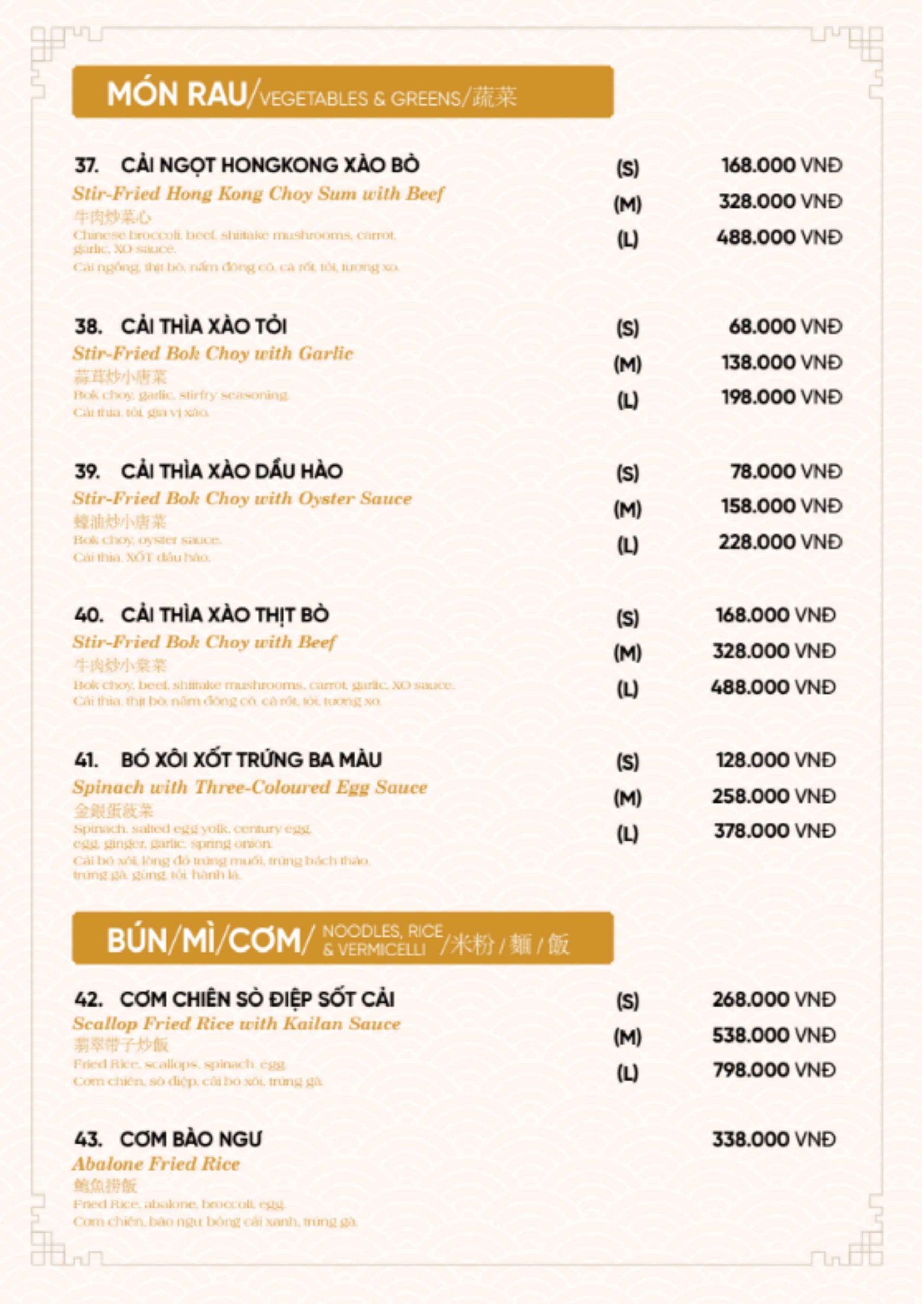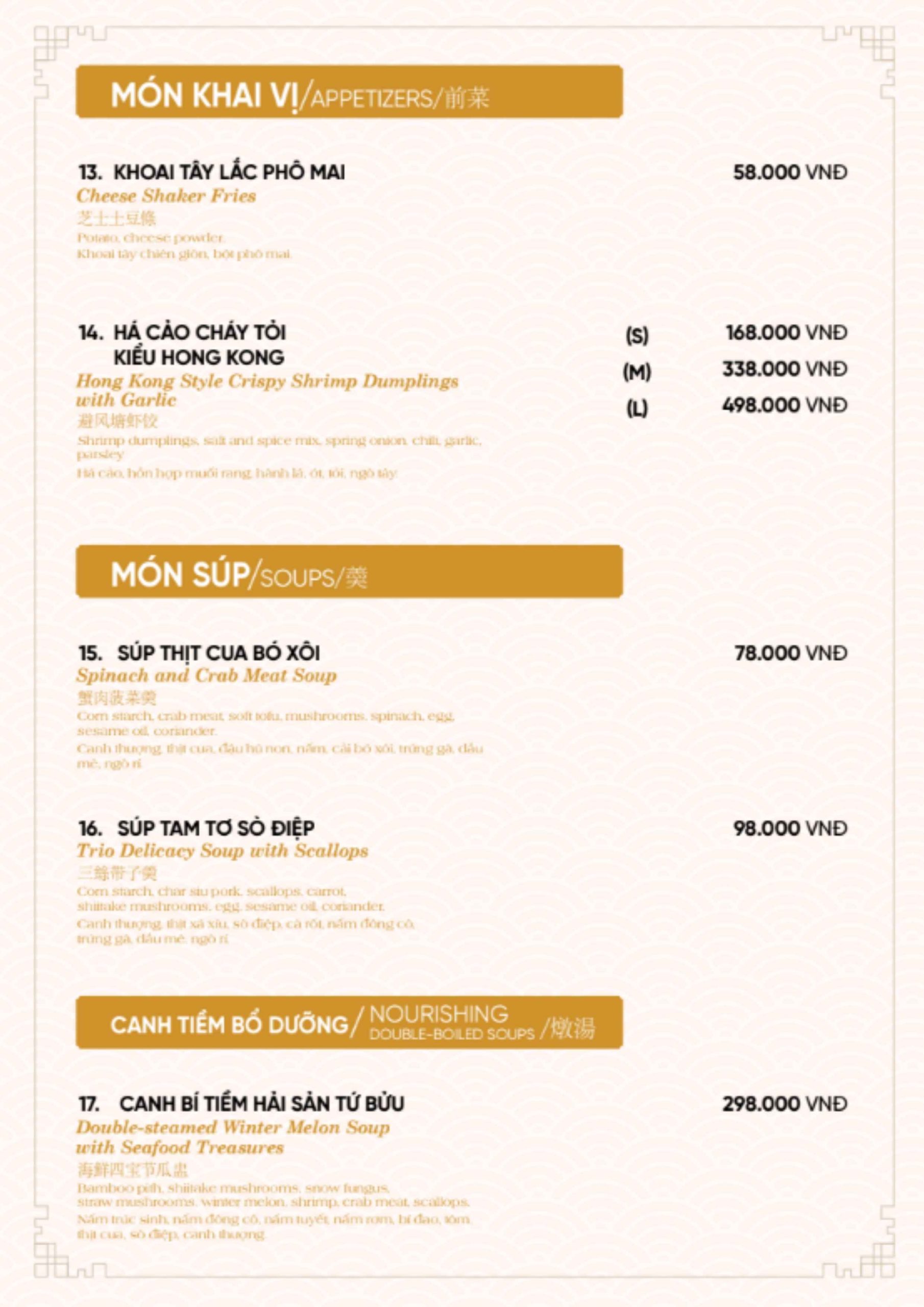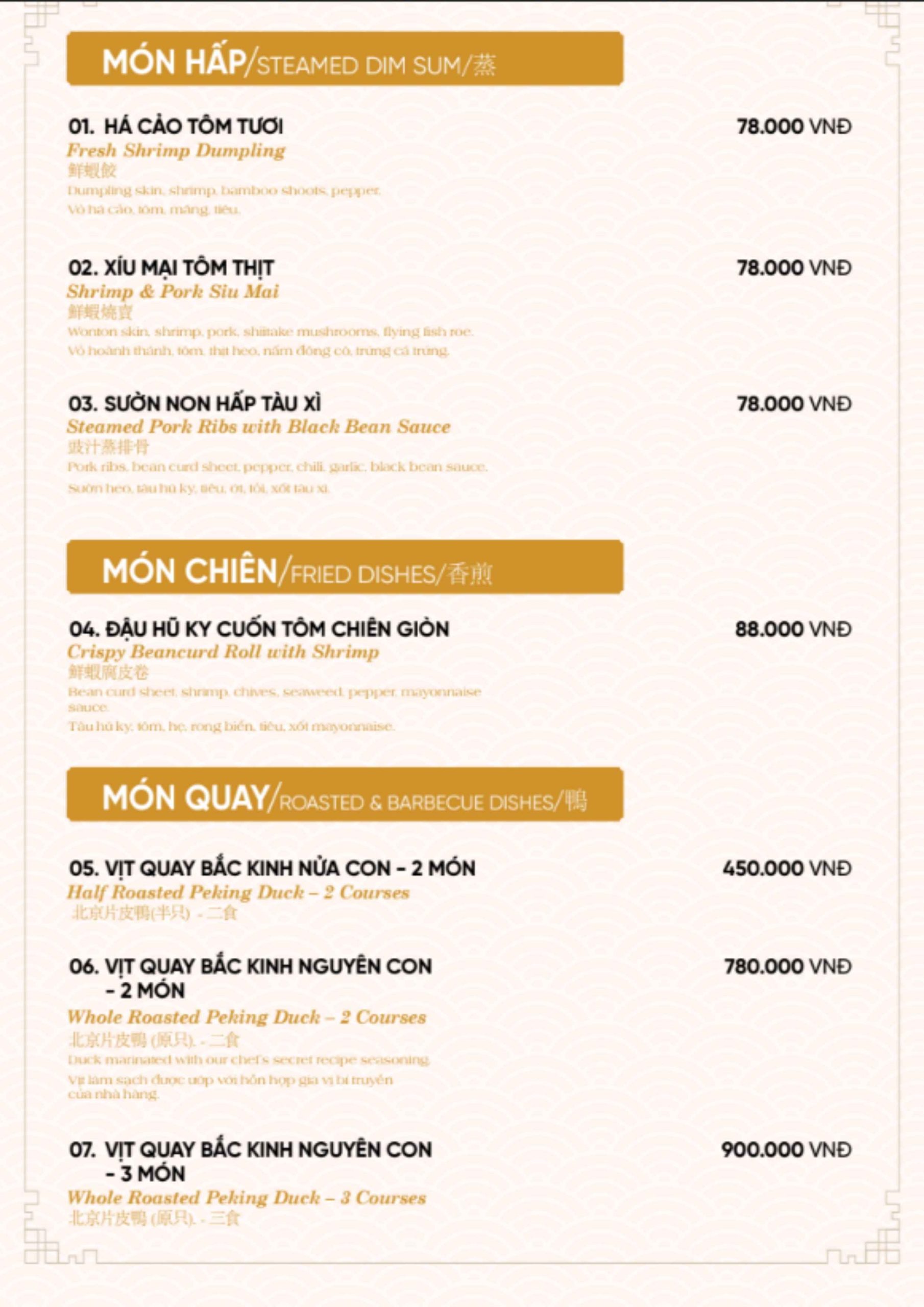 Thực đơn nổi bật với các món đặc trưng như vịt quay Bắc Kinh và bào ngư cao cấp. Hải sản được lựa chọn kỹ lưỡng, đảm bảo độ tươi và chất lượng. Các món dimsum được chế biến tinh tế, giữ độ mềm và hương vị đặc trưng. Mỗi món ăn đều được trình bày đẹp mắt và chỉn chu. Ẩm thực tại đây mang đậm tinh thần Quảng Đông truyền thống.