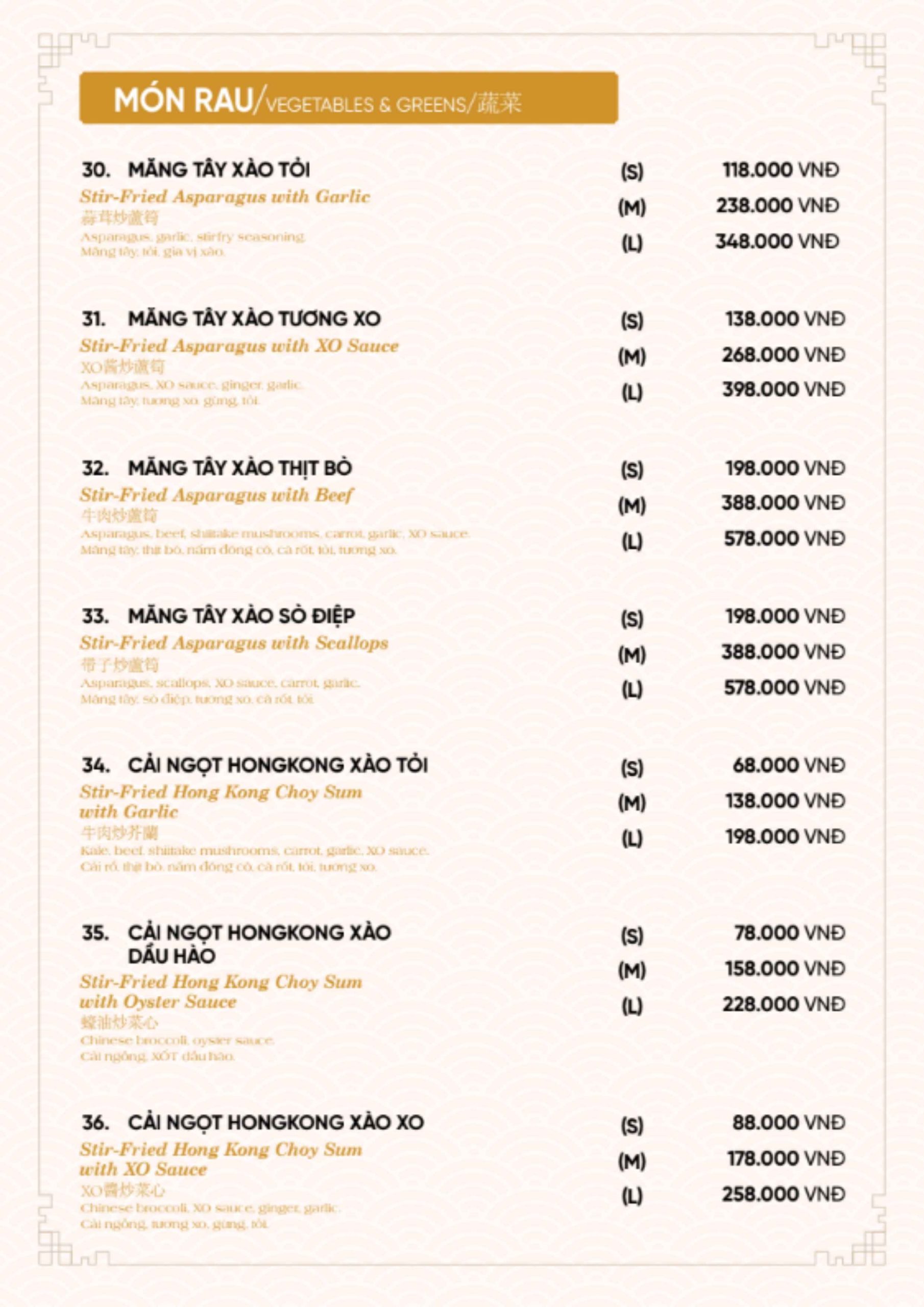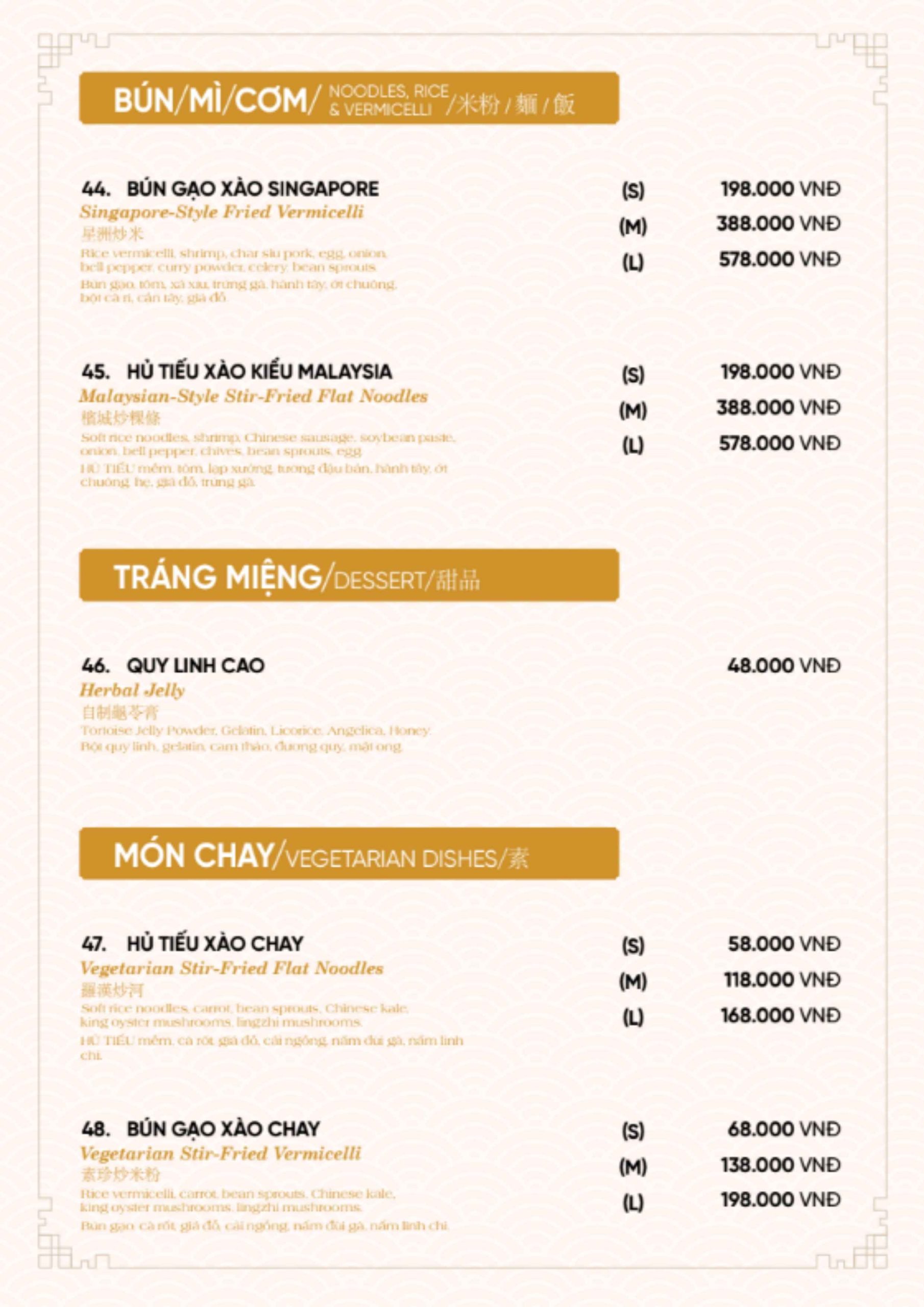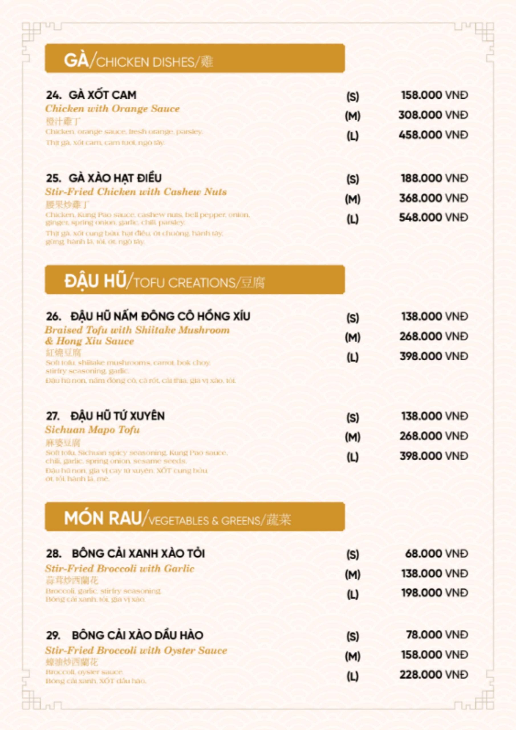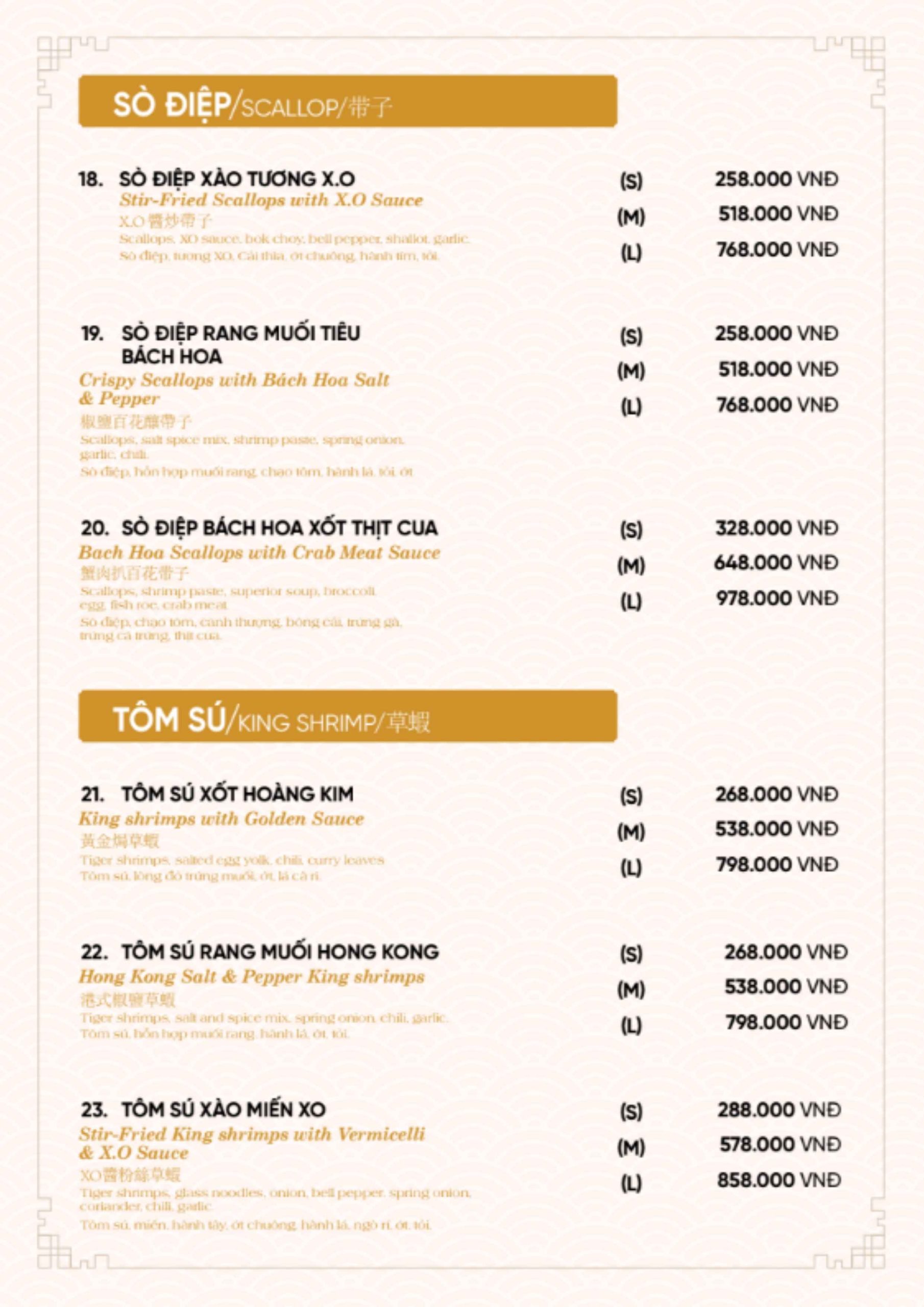 Thực đơn nổi bật với các món đặc trưng như vịt quay Bắc Kinh và bào ngư cao cấp. Hải sản được lựa chọn kỹ lưỡng, đảm bảo độ tươi và chất lượng. Các món dimsum được chế biến tinh tế, giữ độ mềm và hương vị đặc trưng. Mỗi món ăn đều được trình bày đẹp mắt và chỉn chu. Ẩm thực tại đây mang đậm tinh thần Quảng Đông truyền thống.