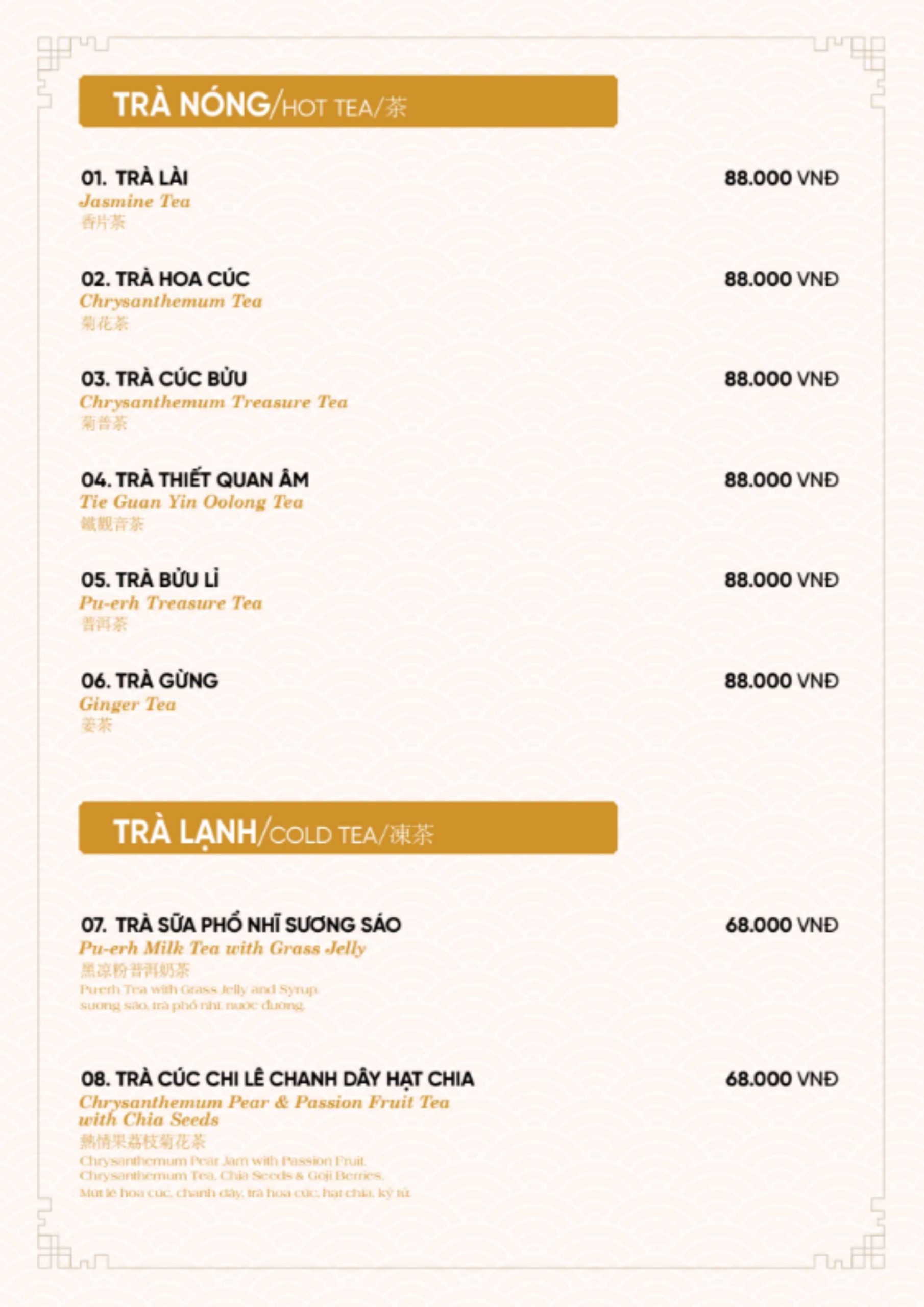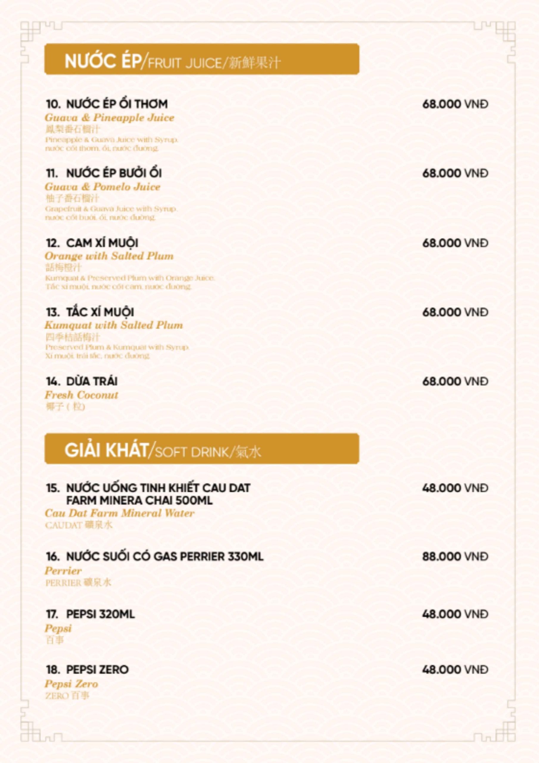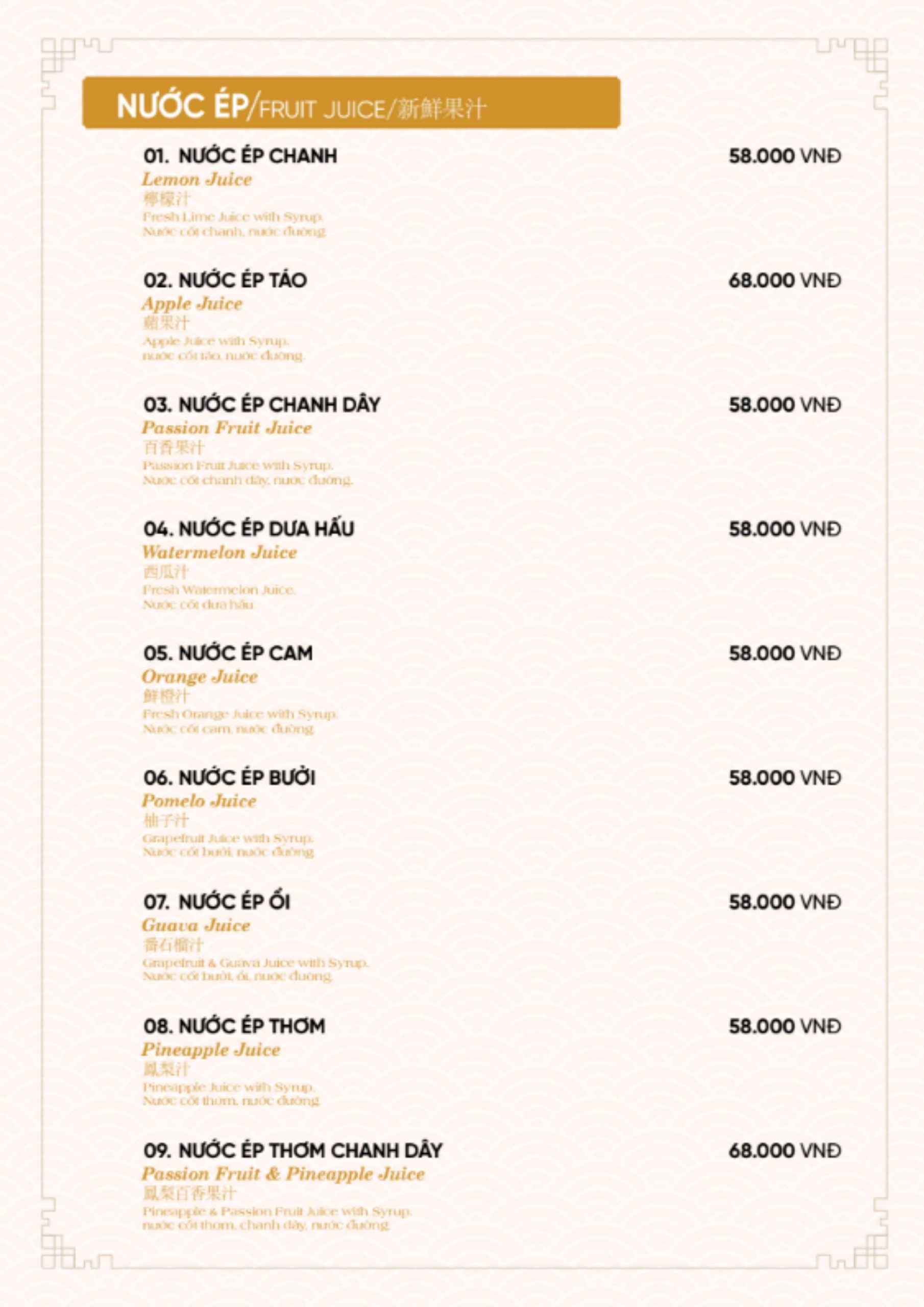 Thực đơn đồ uống cũng được chú trọng để hoàn thiện trải nghiệm dùng bữa. Nhà hàng phục vụ nhiều loại nước uống phù hợp với từng món ăn. Sự kết hợp hài hòa giữa món ăn và đồ uống tạo cảm giác trọn vẹn. Dragon Palace không ngừng cải tiến thực đơn để phù hợp thị hiếu. Đây là yếu tố giúp nhà hàng giữ được sức hút lâu dài.