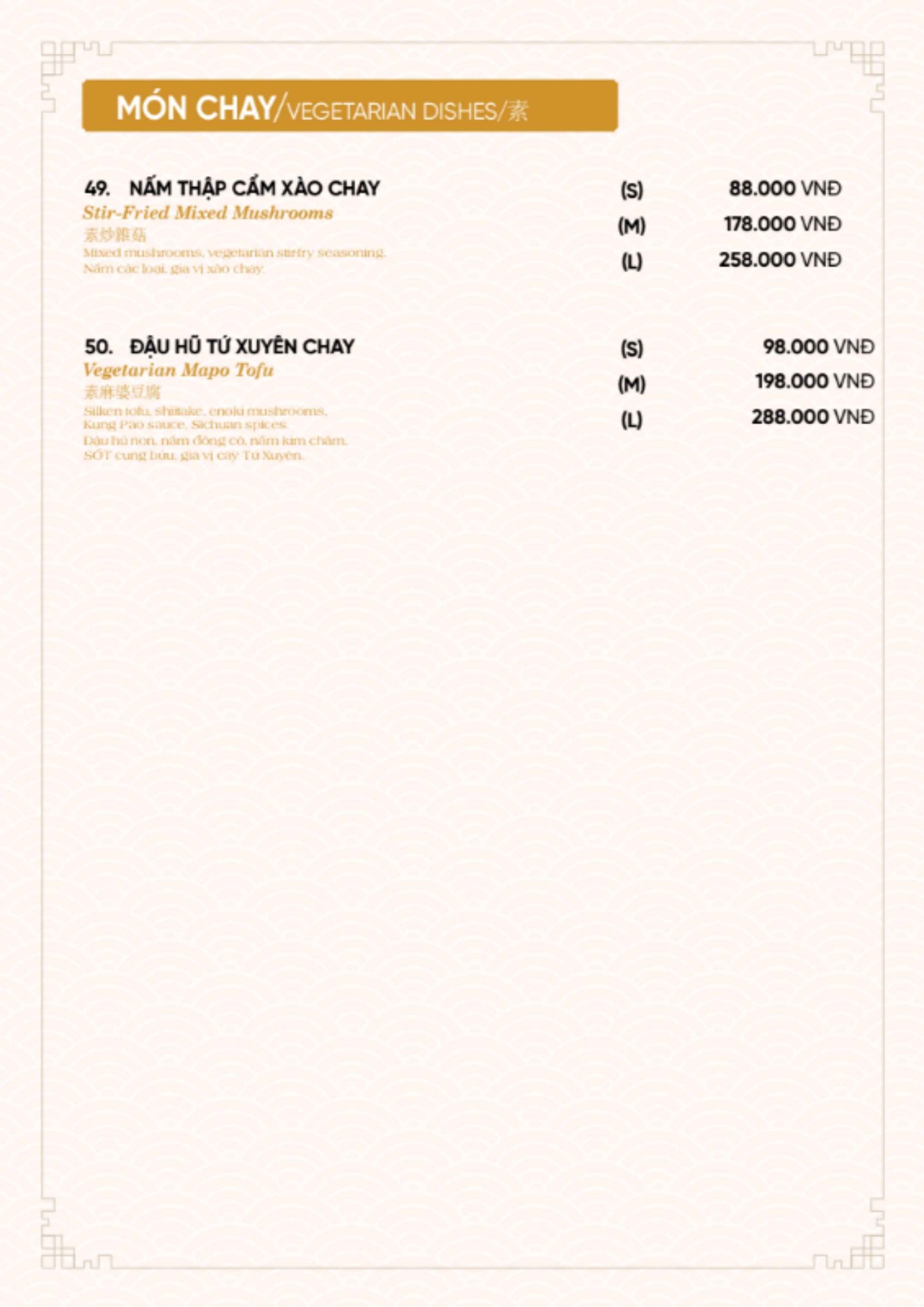 Dragon Palace sở hữu thực đơn phong phú, đáp ứng nhiều nhu cầu ẩm thực khác nhau. Từ món khai vị nhẹ nhàng đến món chính cầu kỳ đều được chuẩn bị cẩn thận. Các món dimsum được làm mới mỗi ngày để đảm bảo chất lượng. Hải sản, thịt quay và món tiềm luôn được nhiều thực khách lựa chọn. Sự đa dạng giúp khách hàng dễ dàng chọn món theo sở thích.
