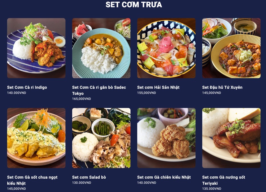 Indigo cung cấp các set menu được sắp xếp hợp lý. Set menu giúp tiết kiệm thời gian lựa chọn món. Các món ăn trong set có sự cân đối. Đây là lựa chọn phù hợp cho bữa ăn công việc.