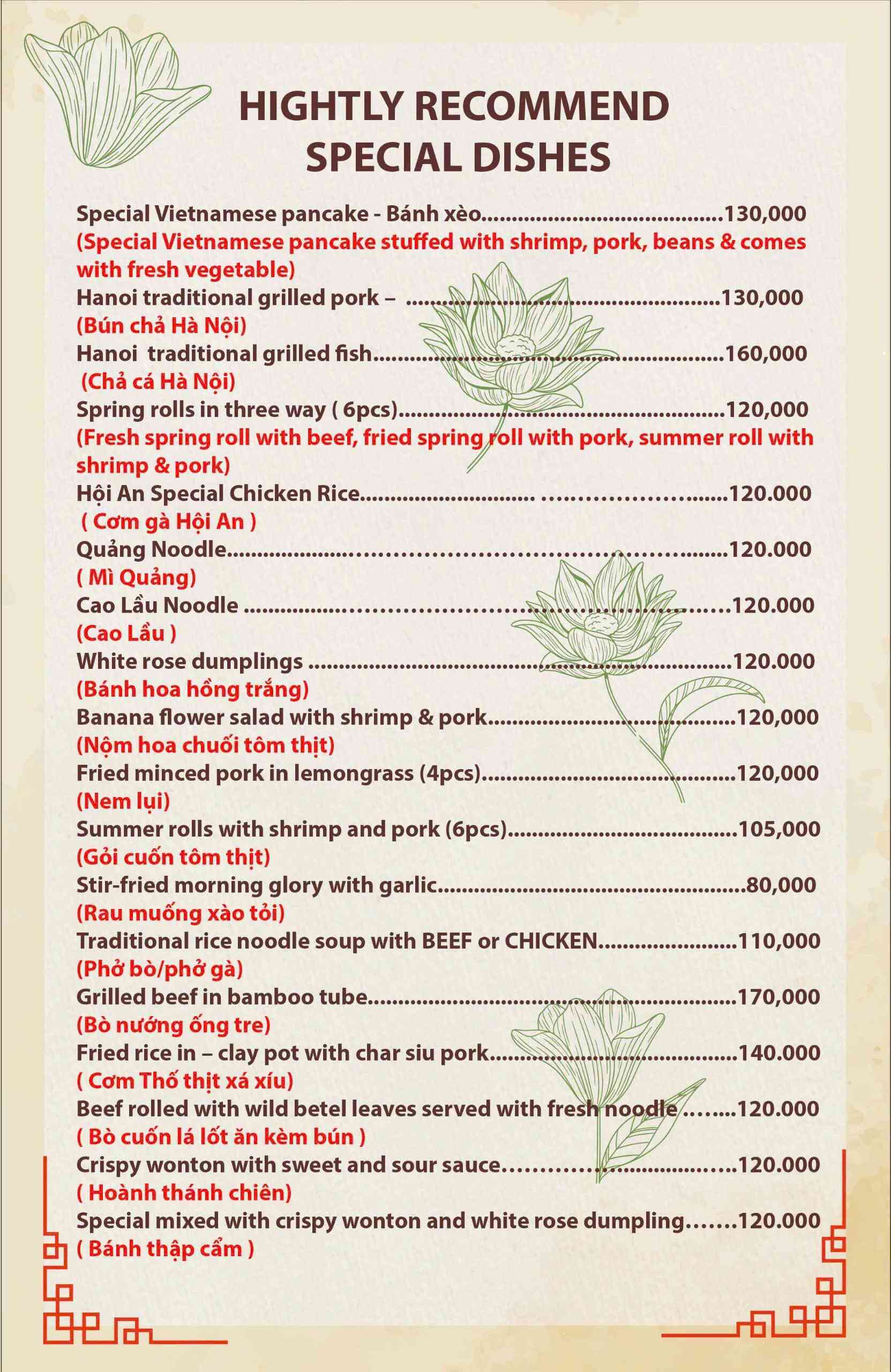 Khi gọi món, nên chọn đặc sản của Hội An. Cao lầu và mỳ Quảng là lựa chọn tốt. Bạn có thể gọi thêm món chay để cân bằng vị. Hãy ăn chậm để tận hưởng không gian.