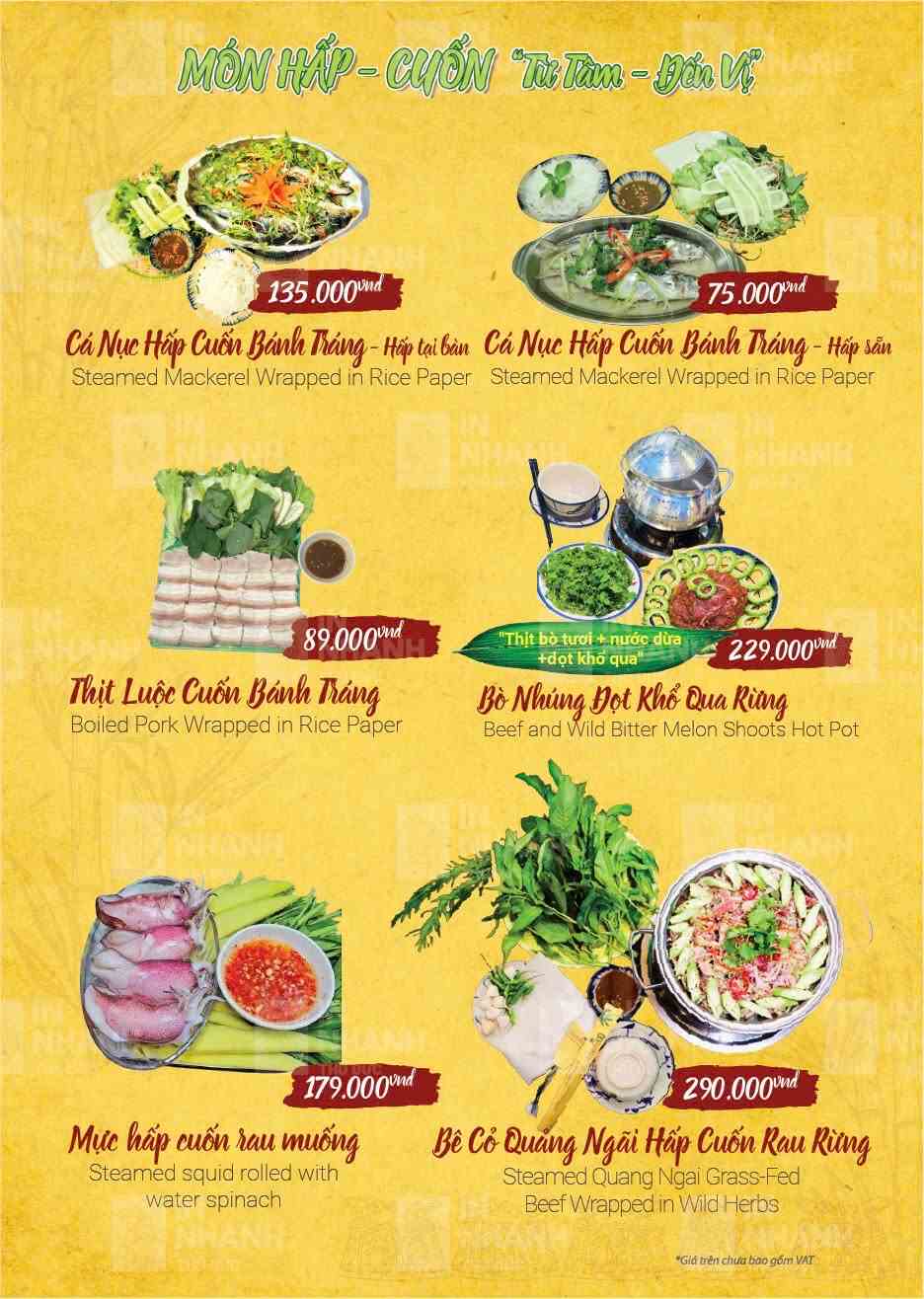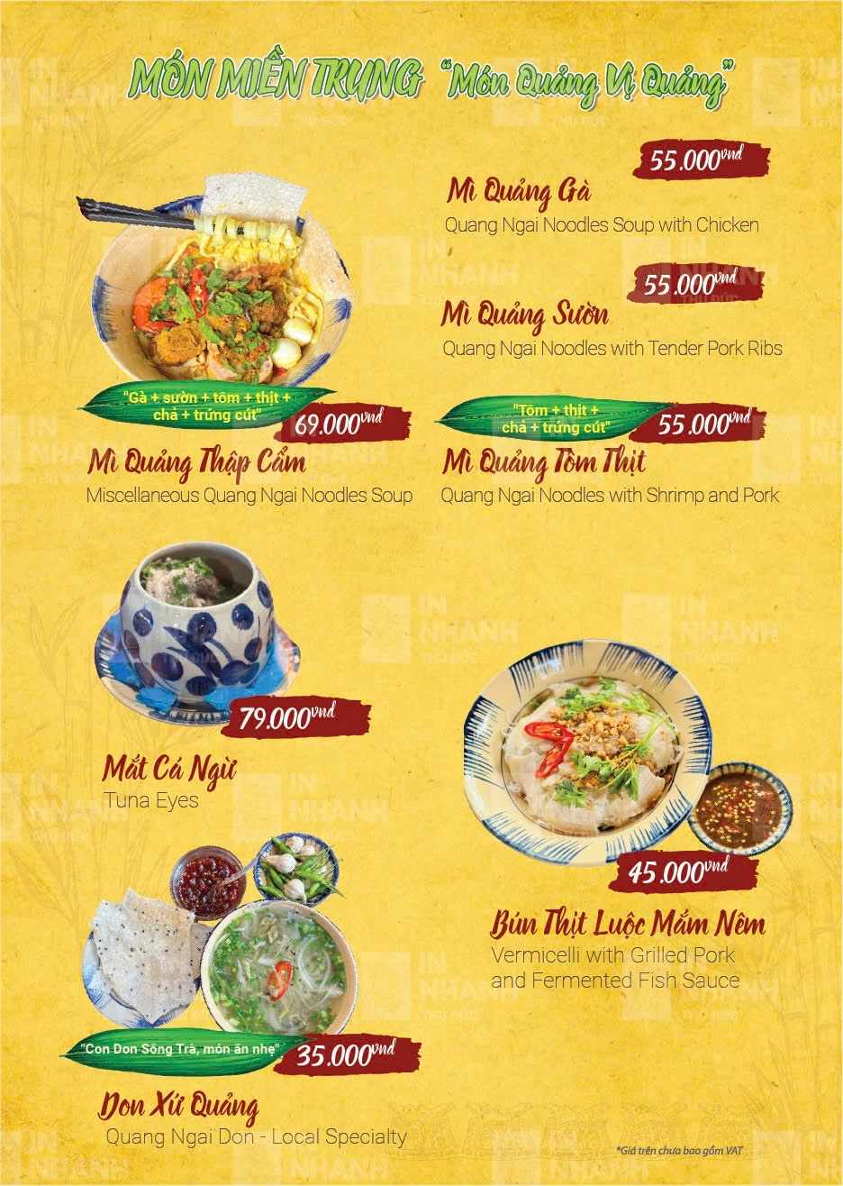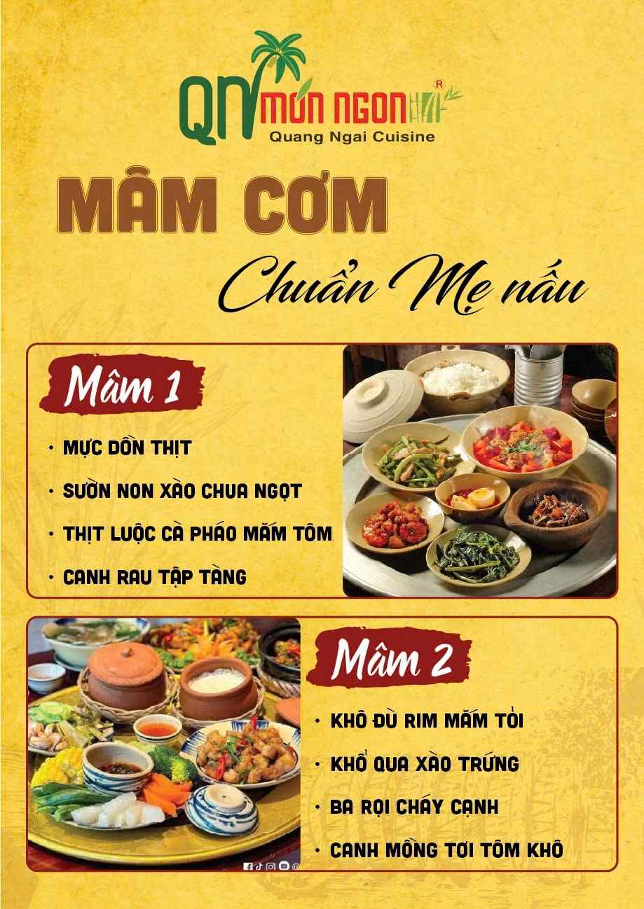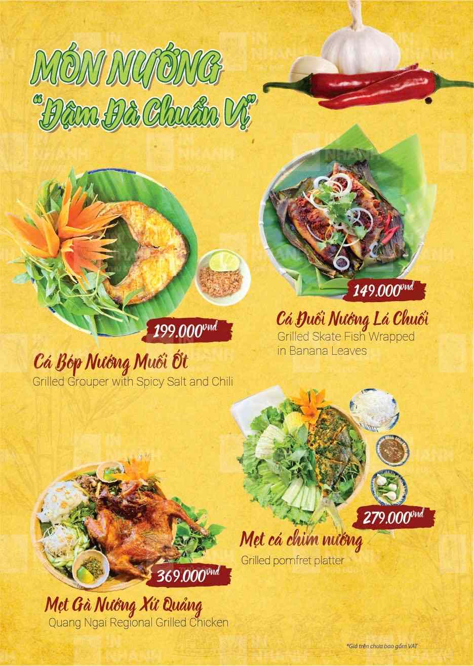 Nhà hàng phục vụ thực đơn phong phú với hơn 100 món ăn miền Trung đặc trưng. Các món ăn gắn liền với đời sống sinh hoạt thường ngày của người Quảng Ngãi. Hương vị được nêm nếm đậm đà nhưng không quá cầu kỳ. Mỗi món đều giữ đúng phong vị truyền thống quen thuộc. Cách chế biến chú trọng sự hài hòa và dễ ăn. Nguyên liệu được chọn lọc kỹ lưỡng mỗi ngày. Món ăn luôn đảm bảo độ tươi và chất lượng ổn định.