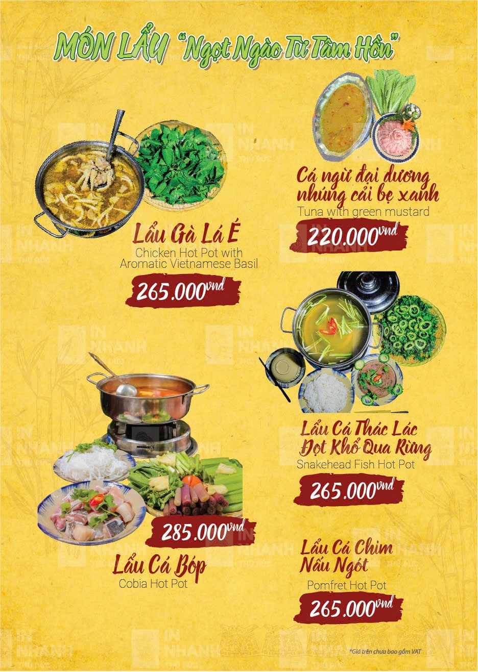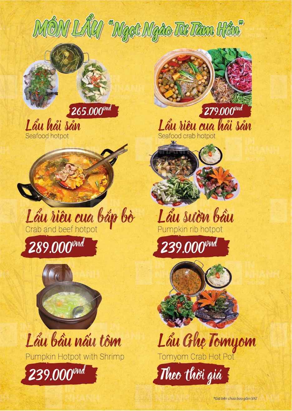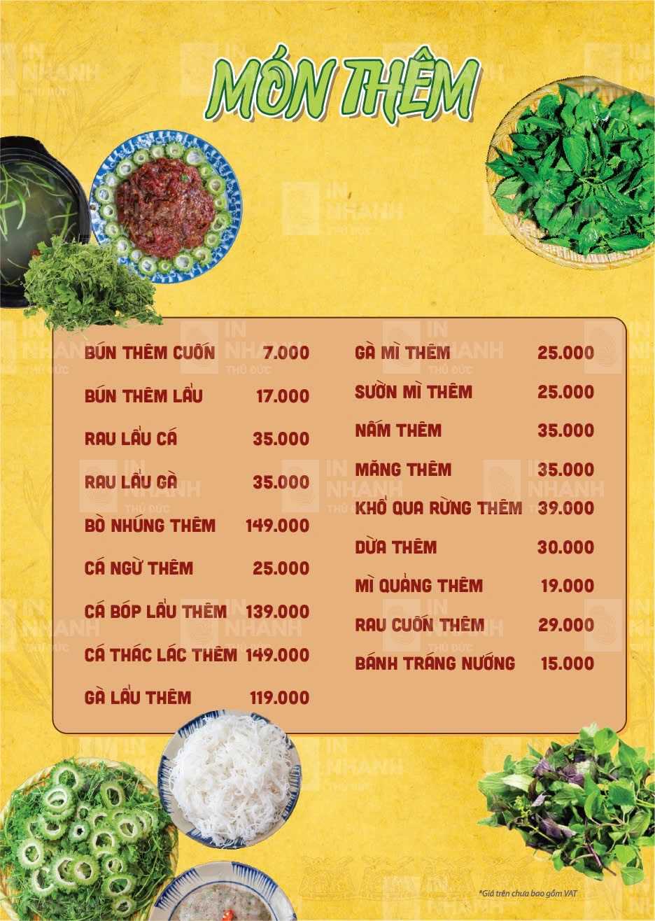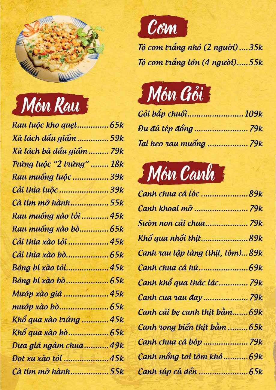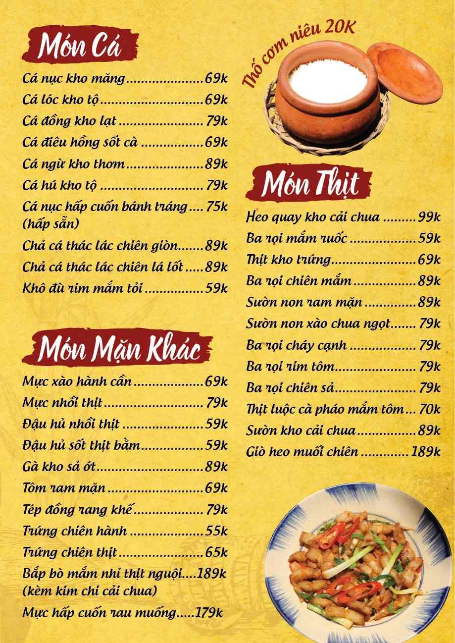 Nhà hàng phục vụ thực đơn phong phú với hơn 100 món ăn miền Trung đặc trưng. Các món ăn gắn liền với đời sống sinh hoạt thường ngày của người Quảng Ngãi. Hương vị được nêm nếm đậm đà nhưng không quá cầu kỳ. Mỗi món đều giữ đúng phong vị truyền thống quen thuộc. Cách chế biến chú trọng sự hài hòa và dễ ăn. Nguyên liệu được chọn lọc kỹ lưỡng mỗi ngày. Món ăn luôn đảm bảo độ tươi và chất lượng ổn định.