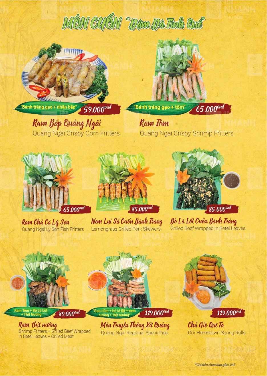 Don Quảng Ngãi là món ăn tiêu biểu làm nên dấu ấn của nhà hàng. Nước don có vị ngọt thanh và dễ thưởng thức. Hương thơm hành hòa quyện cùng vị biển nhẹ. Ram bắp giòn rụm với nhân bắp ngọt tự nhiên. Món ăn tạo cảm giác nhẹ bụng và dễ ăn. Bánh xèo miền Trung có vỏ giòn và nhân đầy đặn. Mì Quảng được chế biến đúng phong cách truyền thống. Cá bống kho mang đậm hương vị bữa cơm quê. Canh rau tập tàng giúp bữa ăn thêm cân bằng.