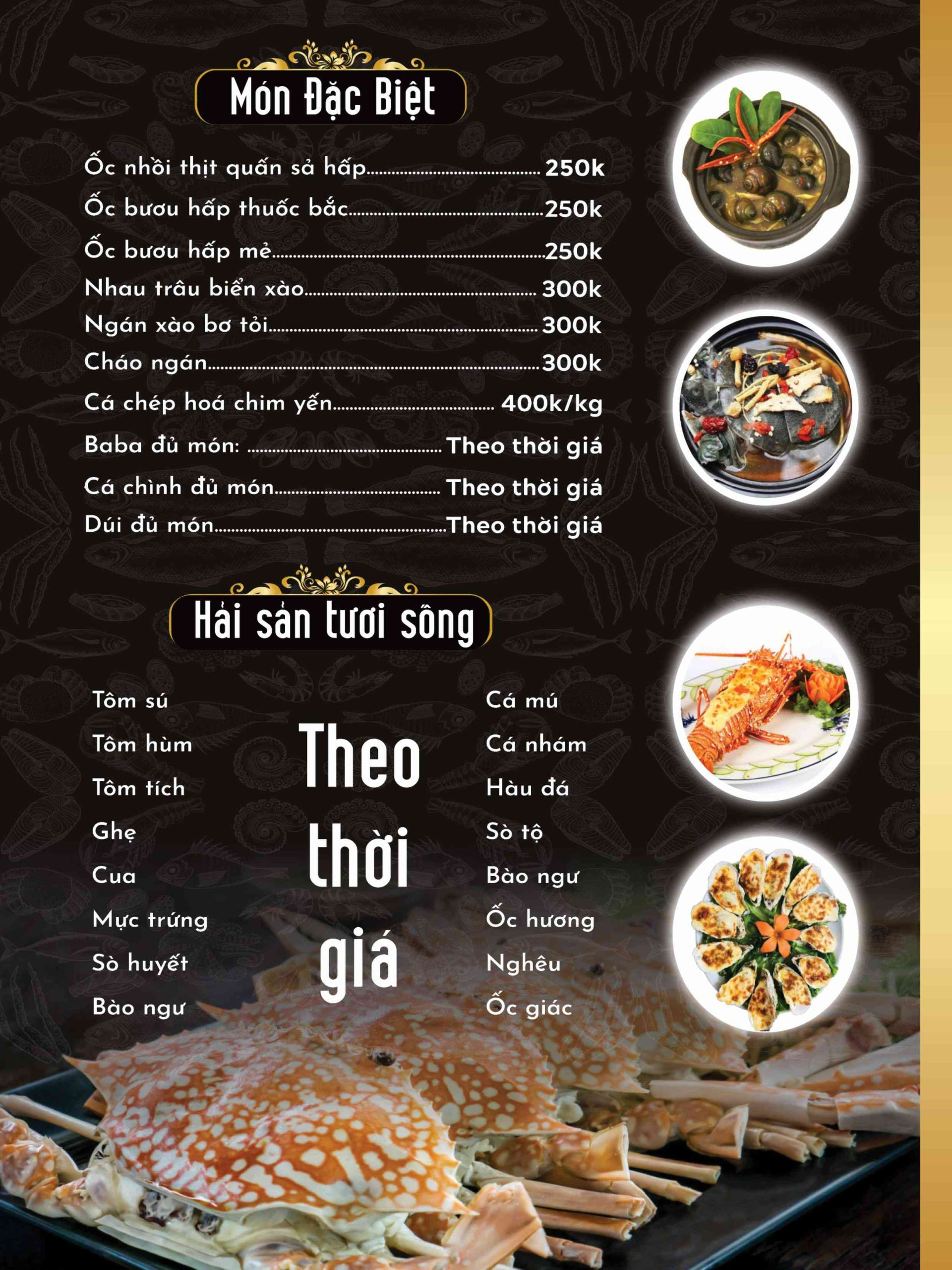 Nhà hàng phục vụ nhiều loại hải sản được chọn lọc kỹ, chế biến theo yêu cầu. Các cách làm phổ biến như hấp, nướng, xào giúp giữ trọn độ tươi và vị ngọt tự nhiên.