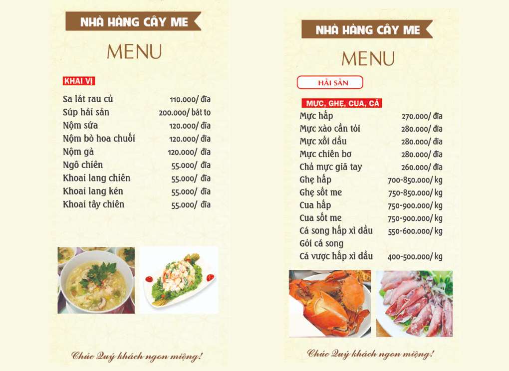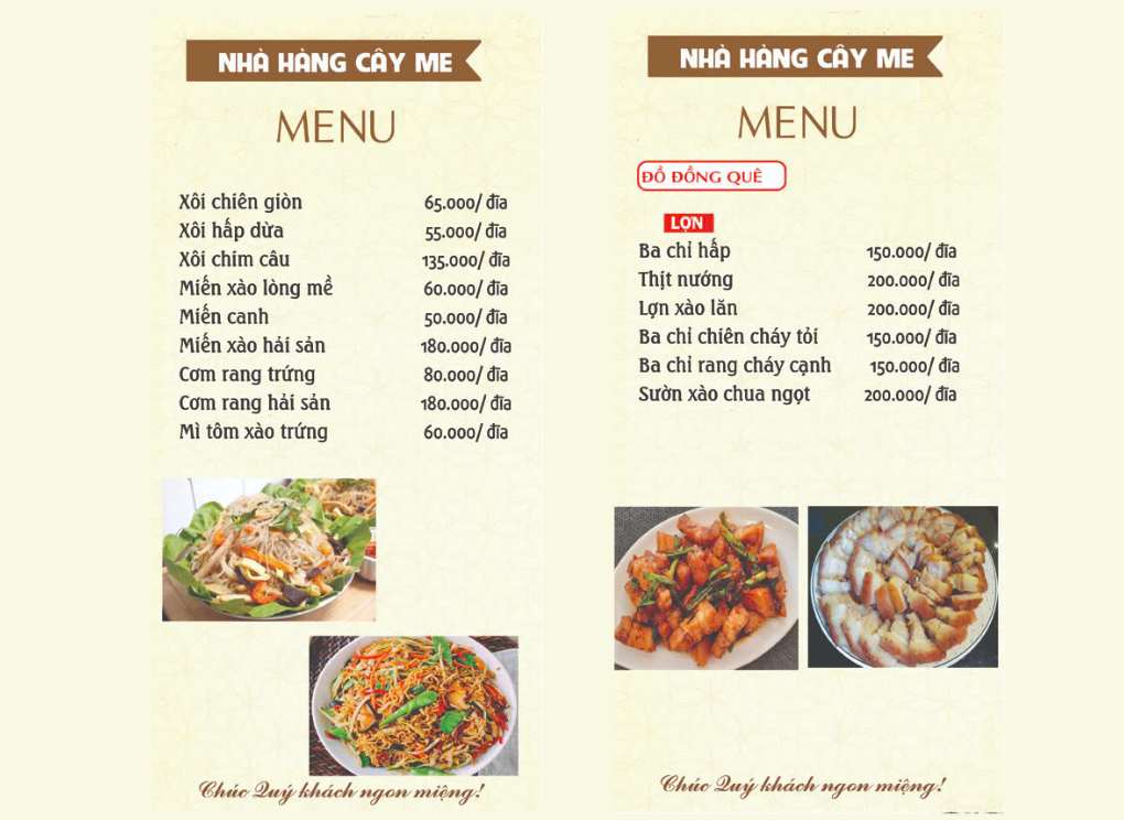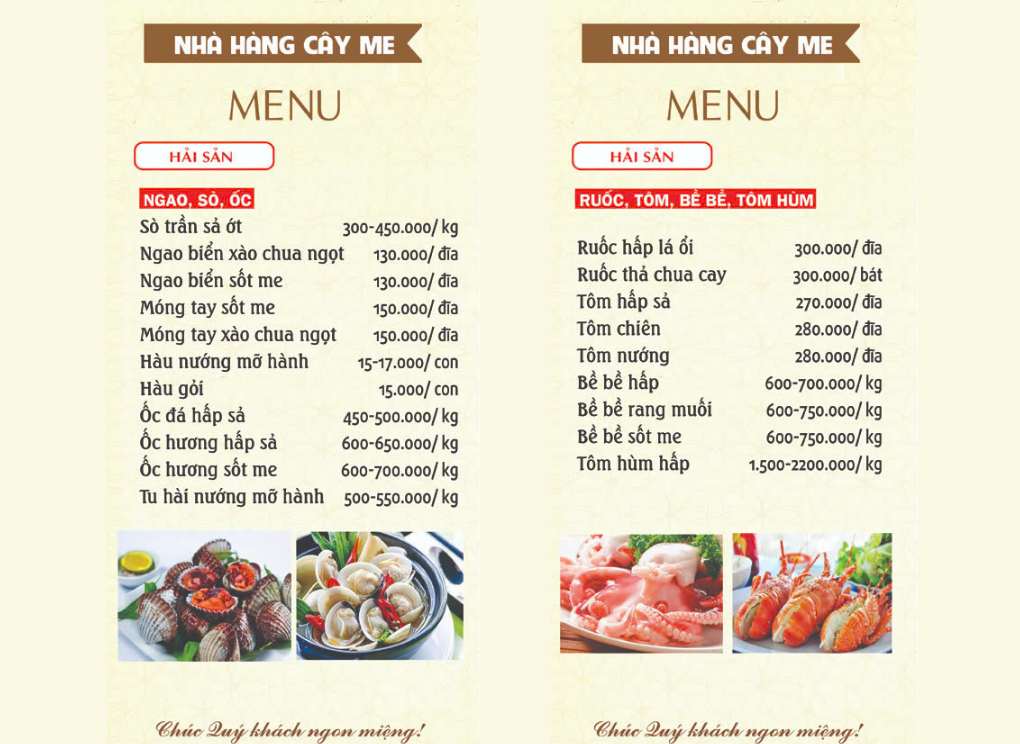 Điểm nổi bật nhất của Nhà hàng Cây Me nằm ở phong cách ẩm thực Việt truyền thống. Sự kết hợp giữa hải sản tươi sống và các món đồng quê quen thuộc. Thực đơn không chạy theo xu hướng biến tấu phức tạp mà tập trung vào hương vị nguyên bản, dễ ăn và phù hợp với nhiều độ tuổi.