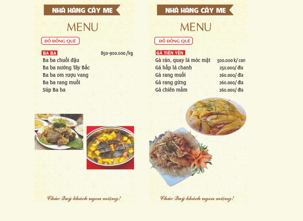 Bên cạnh hải sản, Nhà hàng Cây Me còn phục vụ nhiều món đồng quê như gà, ba ba, ếch, ốc hay trạch. Đây là những món ăn quen thuộc với thực khách Việt, thường xuất hiện trong các bữa tiệc gia đình hoặc buổi tụ họp thân mật. Nhà hàng lưu ý khách nên đặt trước các món này để đảm bảo nguyên liệu được chuẩn bị kỹ càng và đúng yêu cầu.