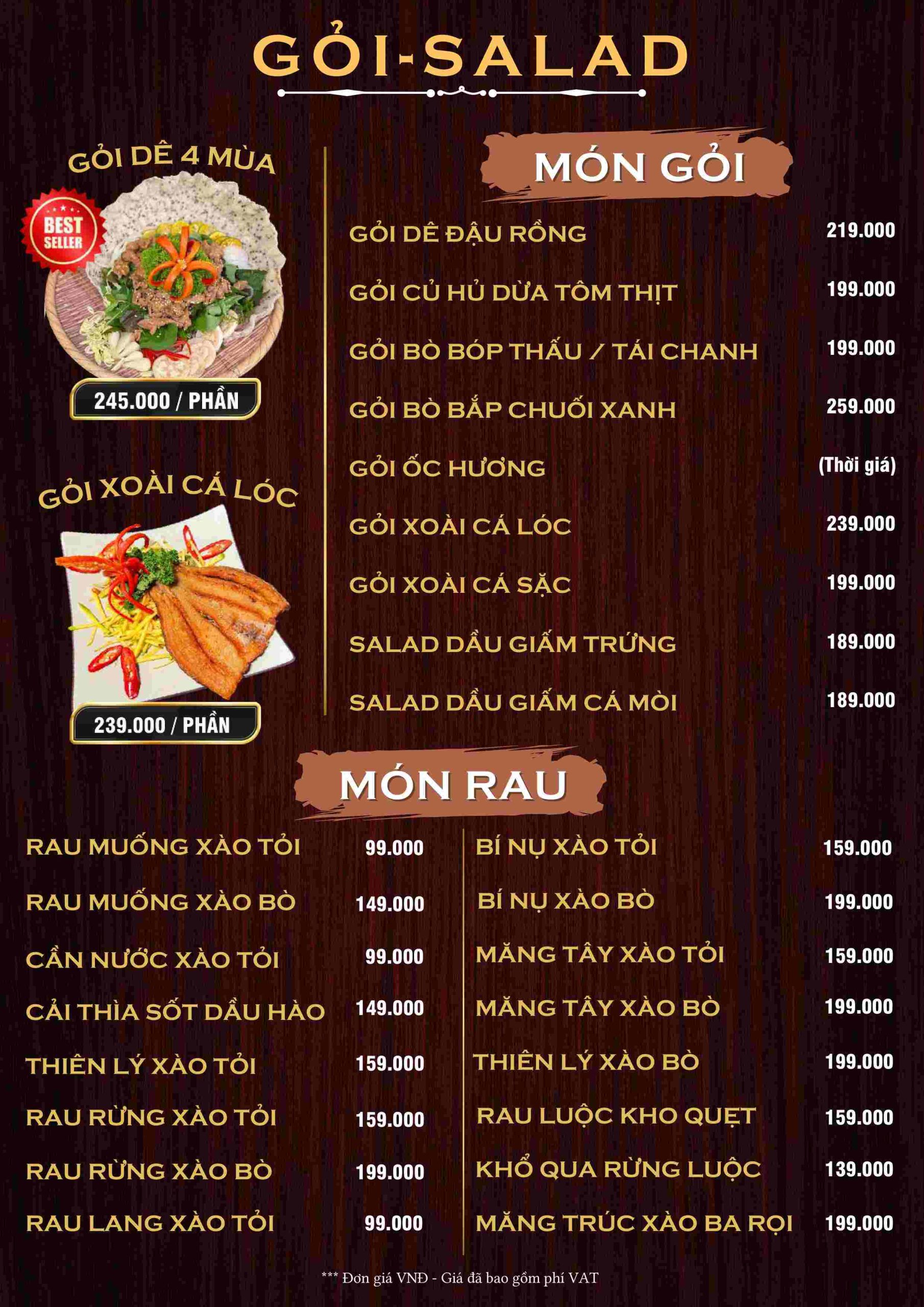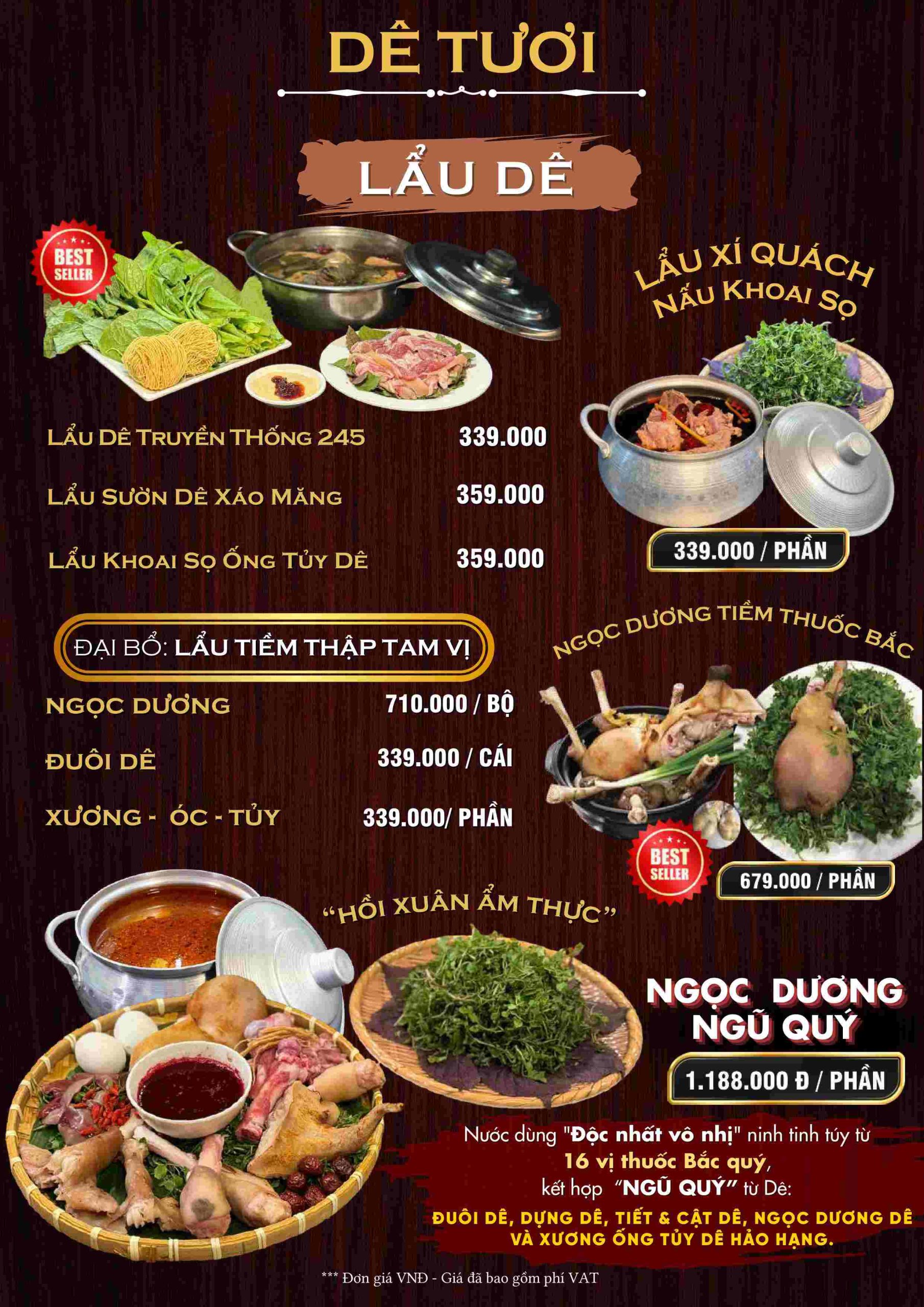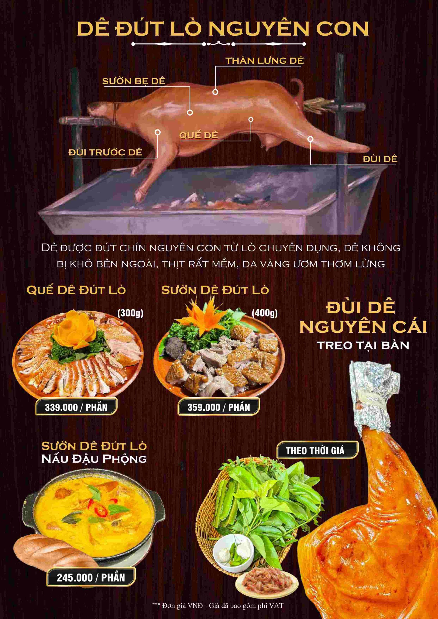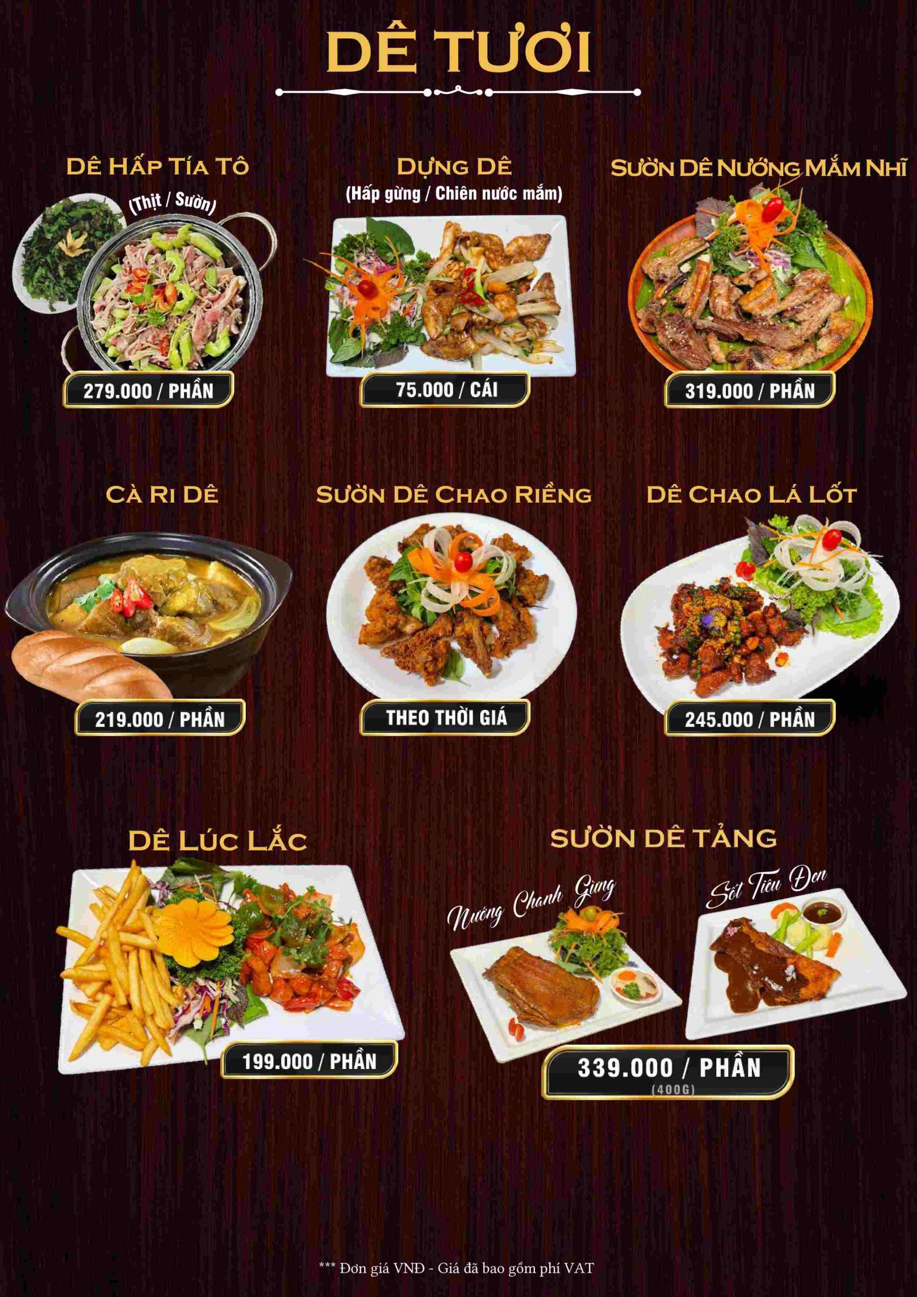 - Tóm tắt 10 món chính: Dê Tái Chanh, Dê Hấp Tía Tô, Lẩu Dê, Dê Nướng Tảng, Cua Rang Me, Ghẹ Hấp Bia, Tôm Sú Nướng Phô Mai, Hàu Nướng Mỡ Hành, Gà Hấp Lá Chanh, Bò Nướng Đá Nóng.