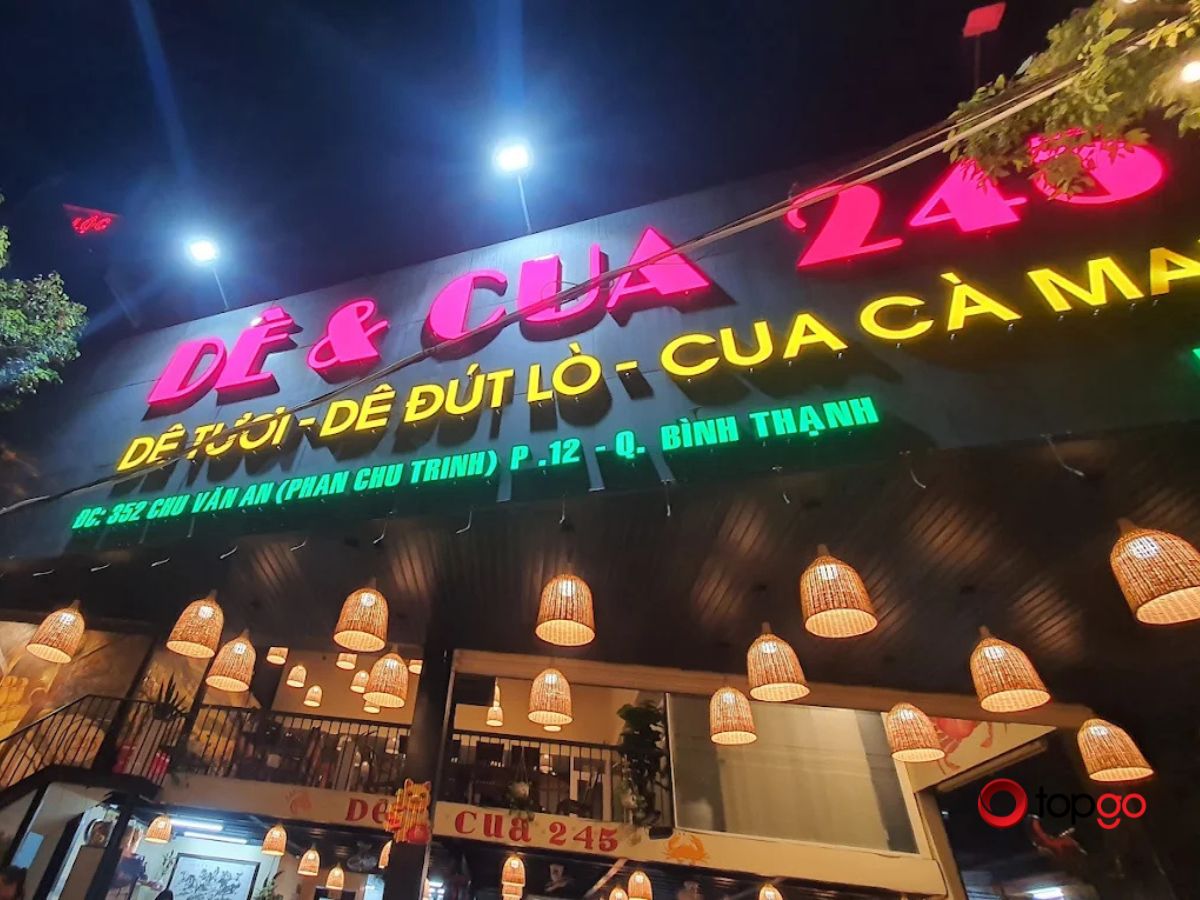 Nhà hàng Dê Cua 245 mang đến trải nghiệm ẩm thực đêm chuẩn Sài Gòn với không gian rộng rãi và phục vụ chỉn chu. Món dê, cua và hải sản tươi sống được chế biến đậm vị, phù hợp khẩu vị miền Nam quen thuộc. Buổi tối, nhà hàng phục vụ thêm Ốc Cồ giúp mọi buổi gặp gỡ trở nên vui và đậm chất Sài Gòn đêm. Không gian phù hợp cho gia đình, nhóm bạn và công ty muốn thưởng thức món ngon trong không khí rôm rả. Dê Cua 245 luôn tạo nên khoảnh khắc ngon và vui trong từng bữa ăn đêm tại Sài thành.Cùng TopGo khám phá ngay nhé!