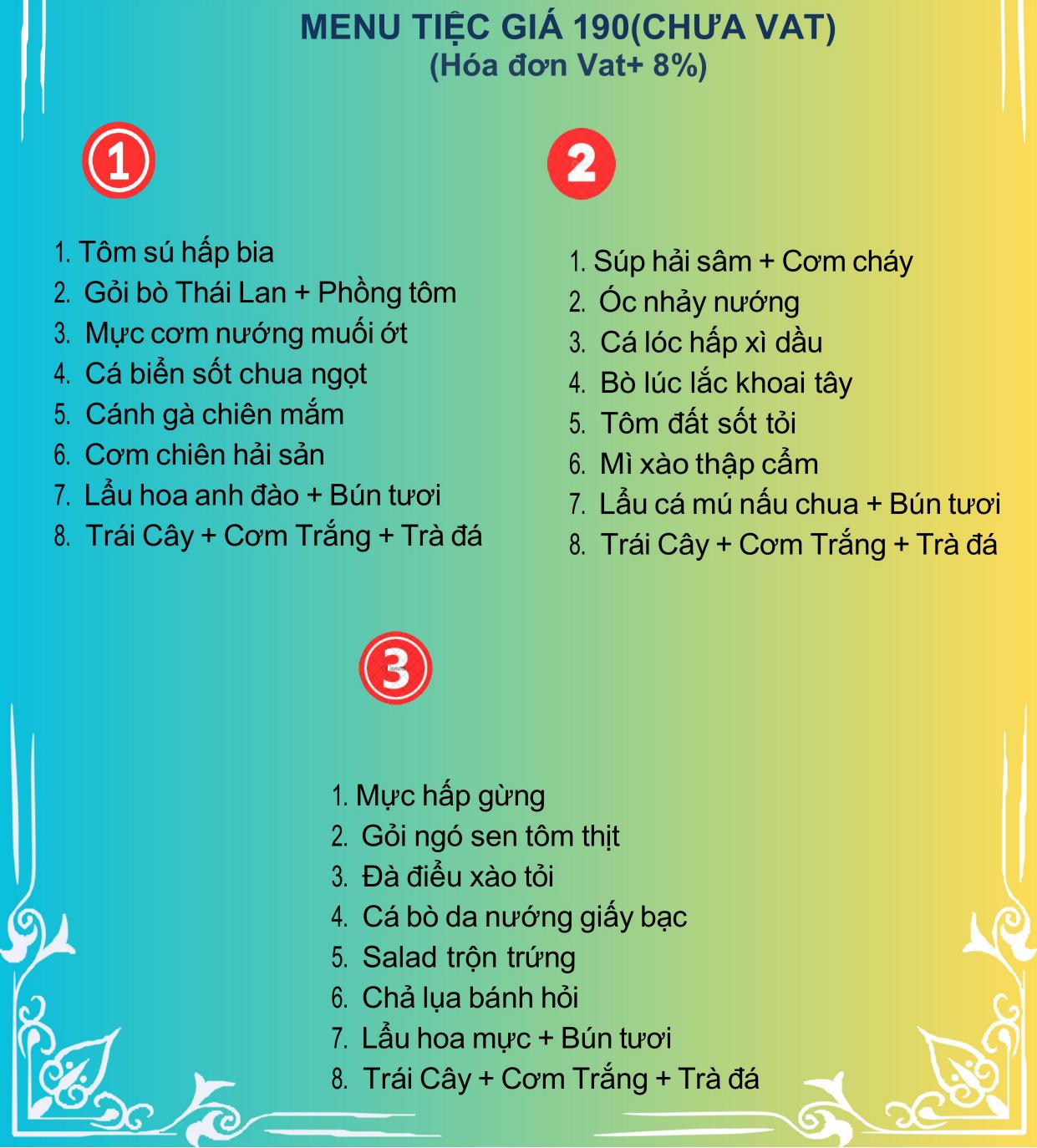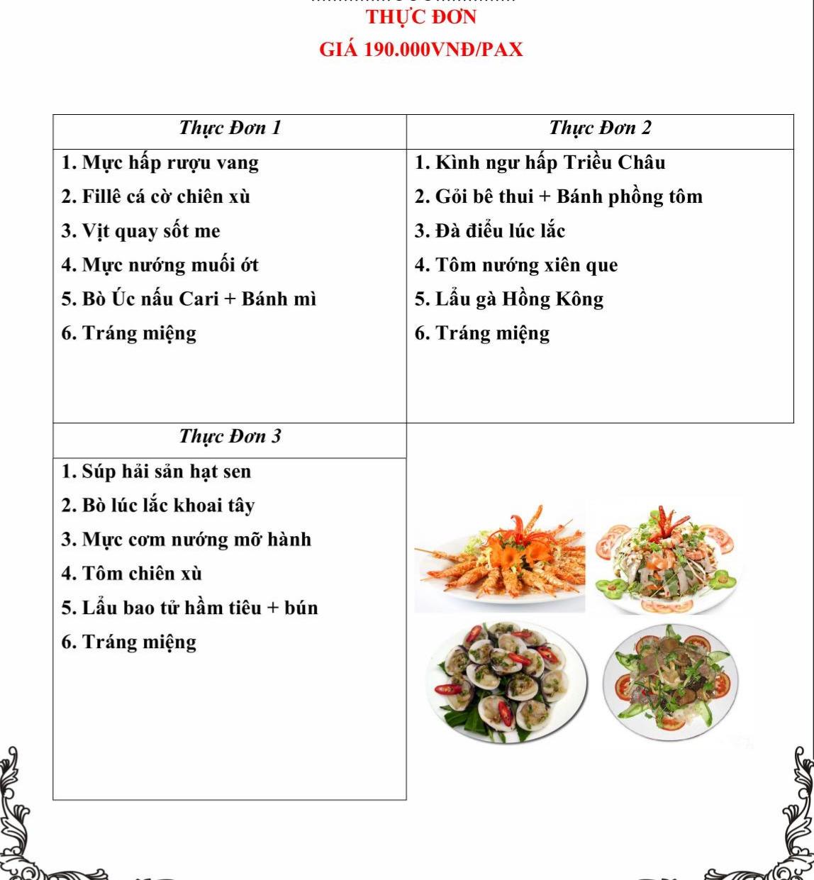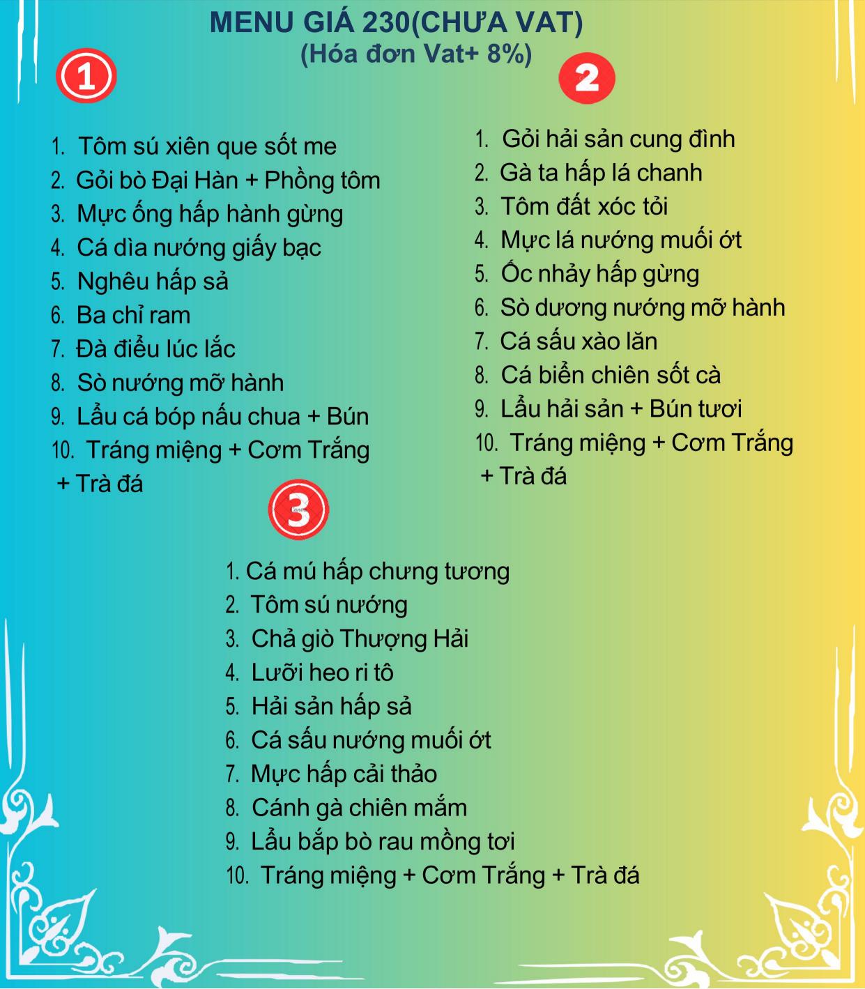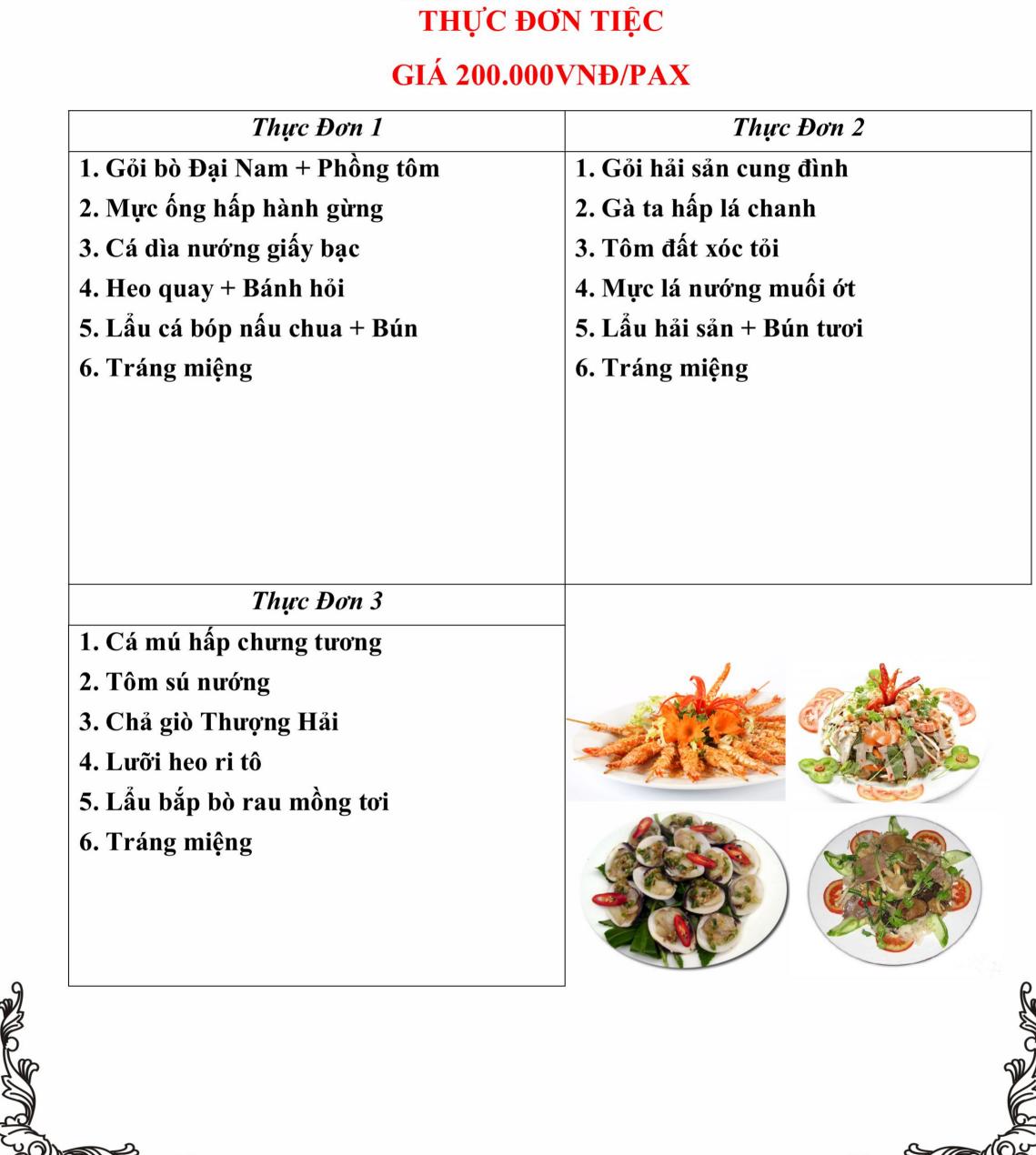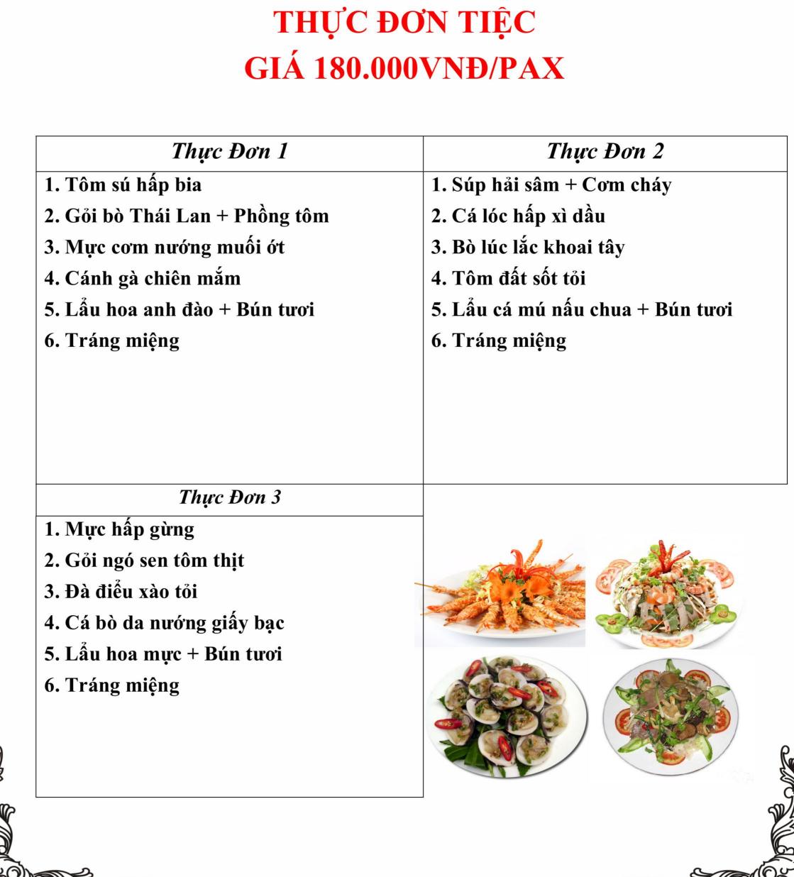 • Món nổi bật: Hải sản tươi sống, món Việt truyền thống, set menu tiệc đa dạng