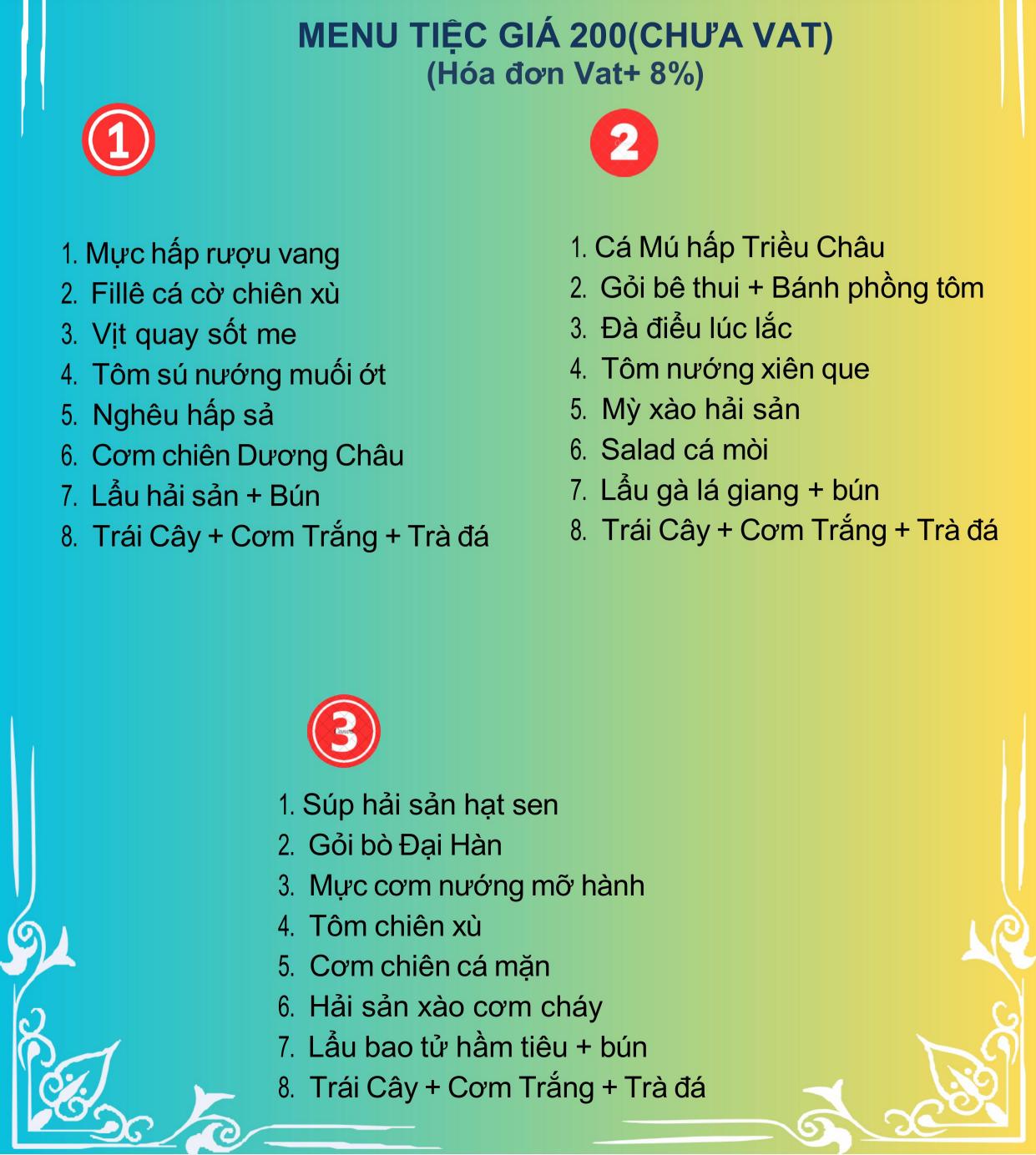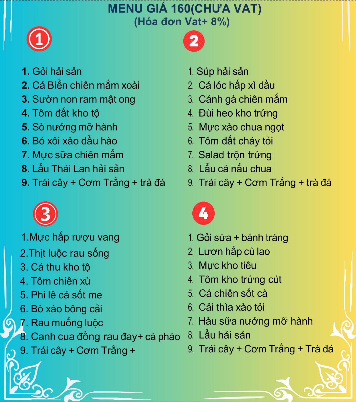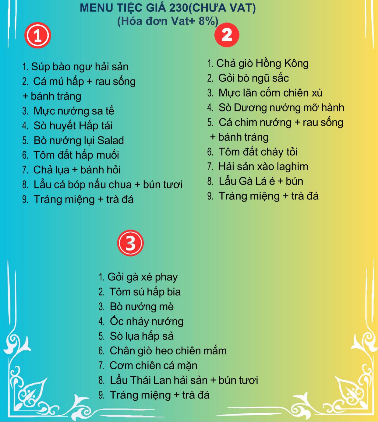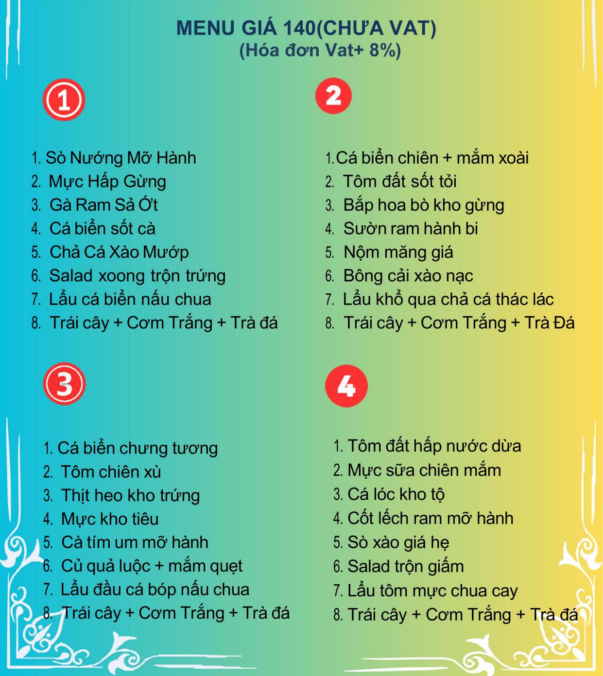 • Món nổi bật: Hải sản tươi sống, món Việt truyền thống, set menu tiệc đa dạng