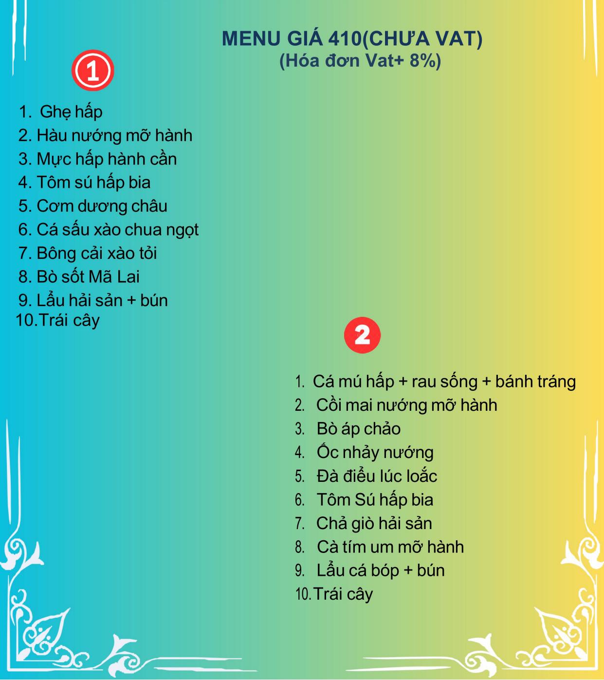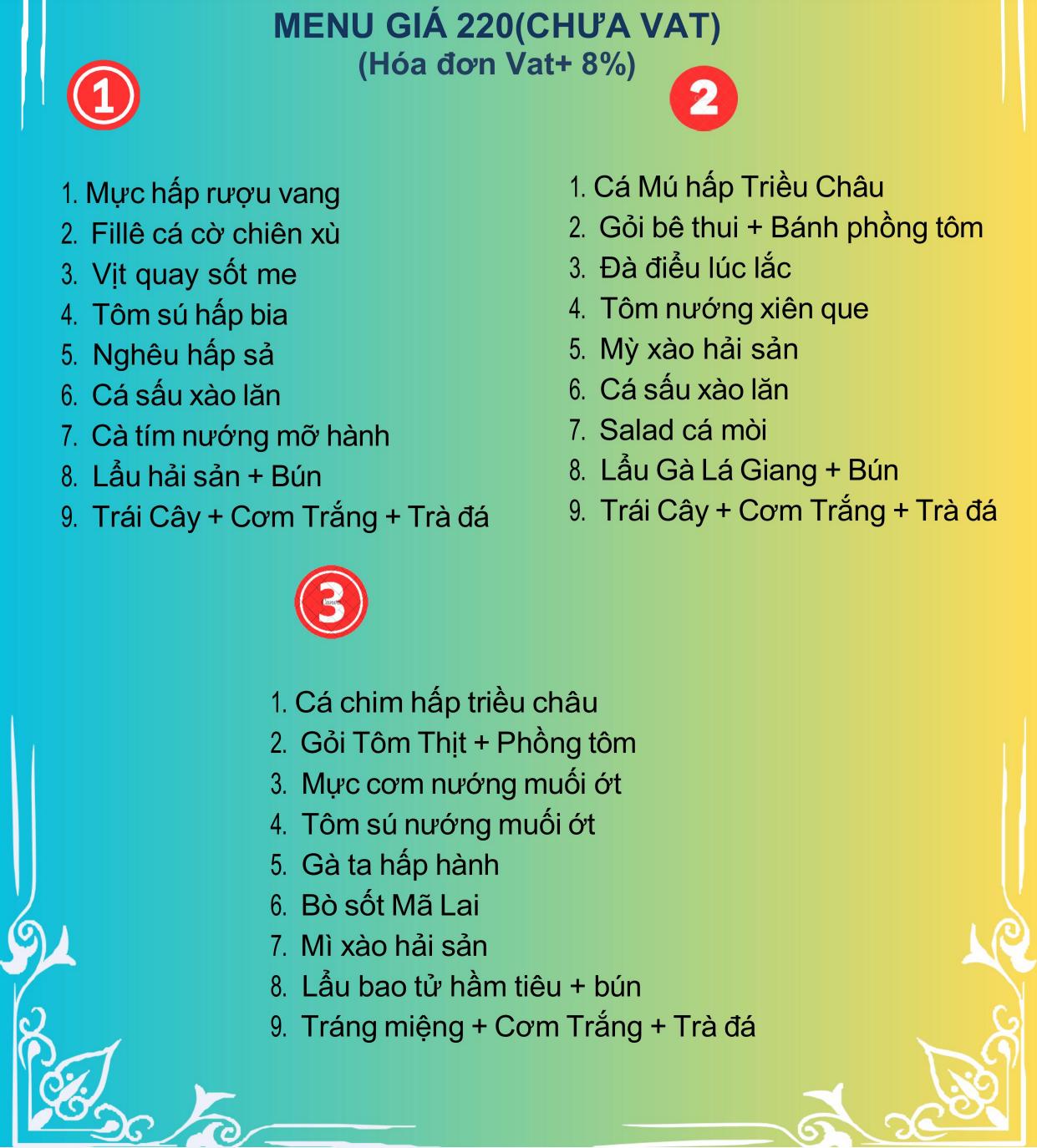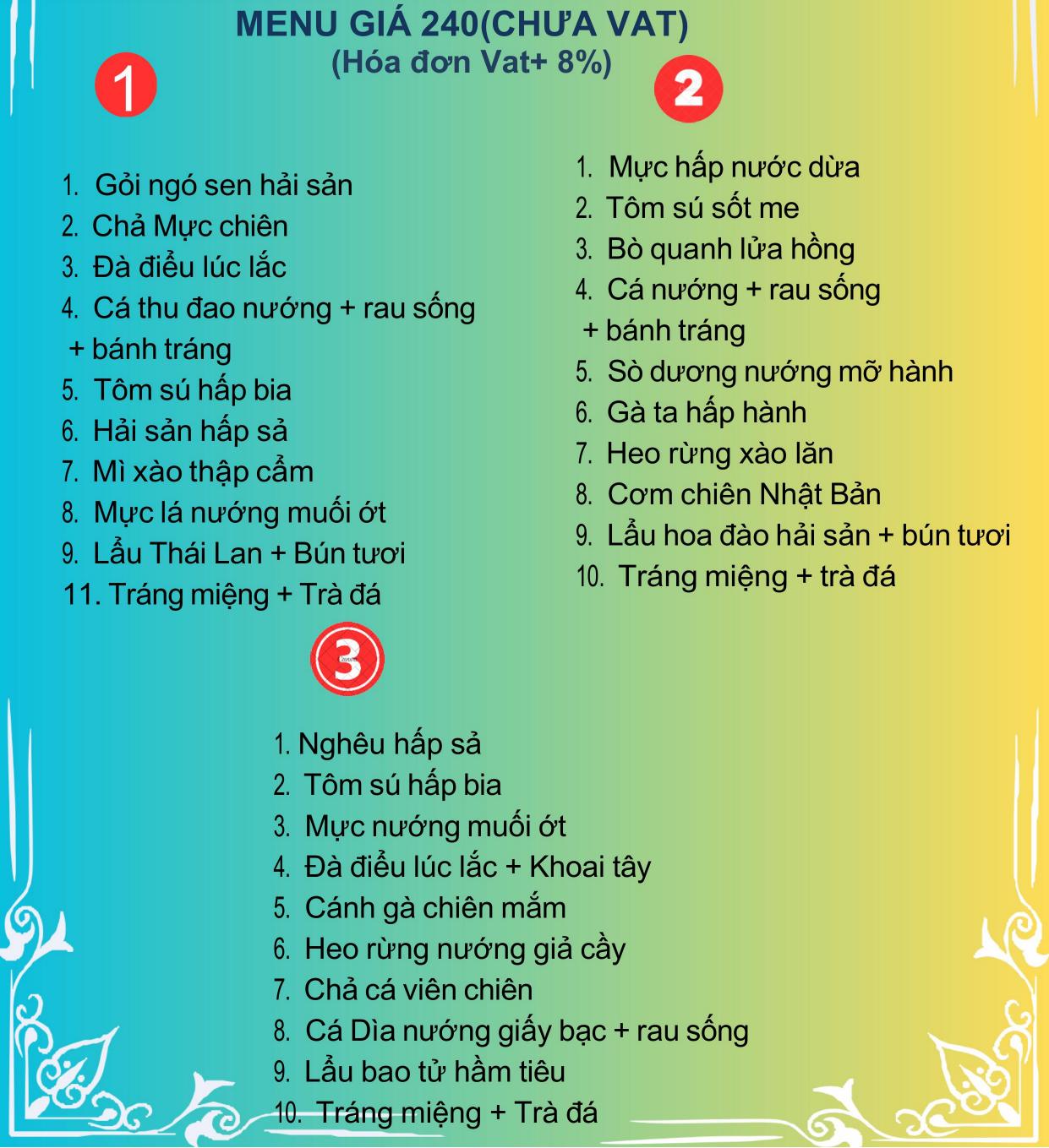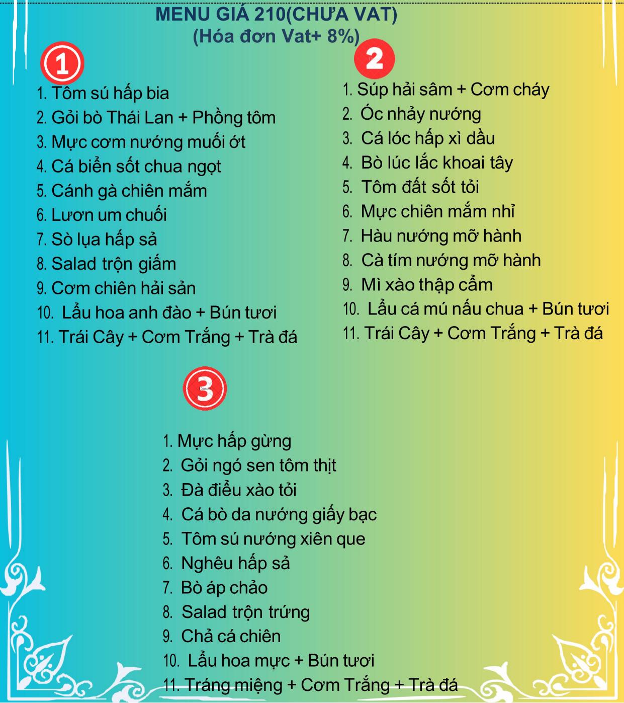 • Món nổi bật: Hải sản tươi sống, món Việt truyền thống, set menu tiệc đa dạng