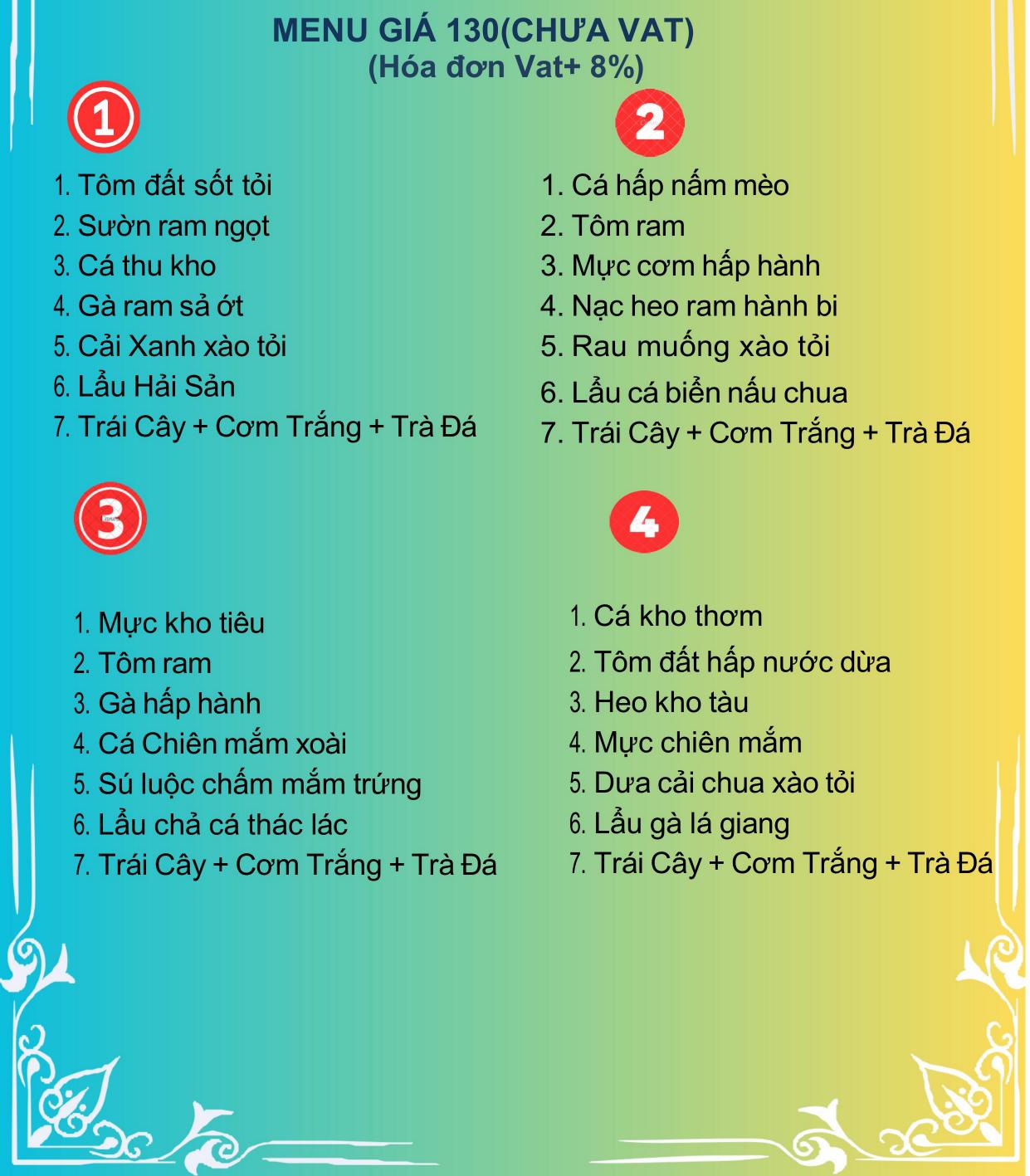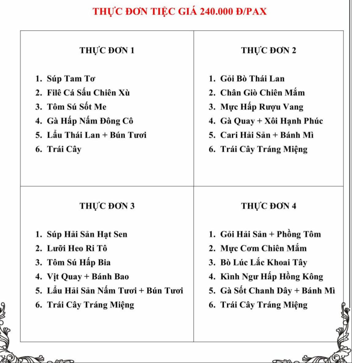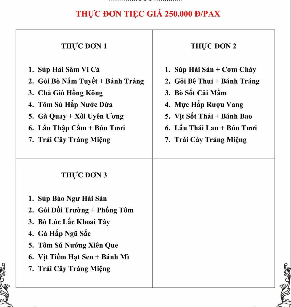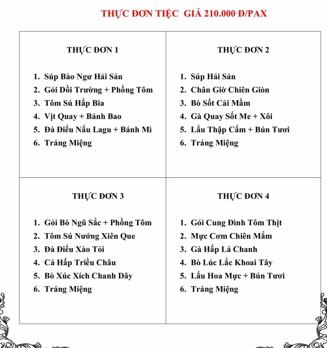 Bên cạnh thực đơn gọi món, Nhà hàng Đồng Tiến còn nổi tiếng với các set menu tiệc linh hoạt. Những set menu này được thiết kế phù hợp với nhiều mức ngân sách khác nhau. Điều này giúp các đoàn khách dễ dàng lựa chọn. Từ những bữa tiệc thân mật đến buổi liên hoan đông người. Thực đơn tiệc thường kết hợp giữa món khai vị, món chính và món tráng miệng. Sự cân bằng trong khẩu vị giúp bữa ăn trở nên trọn vẹn hơn. Đây cũng là lý do nhiều công ty và đoàn du lịch thường chọn Nhà hàng Đồng Tiến làm nơi tổ chức tiệc.
