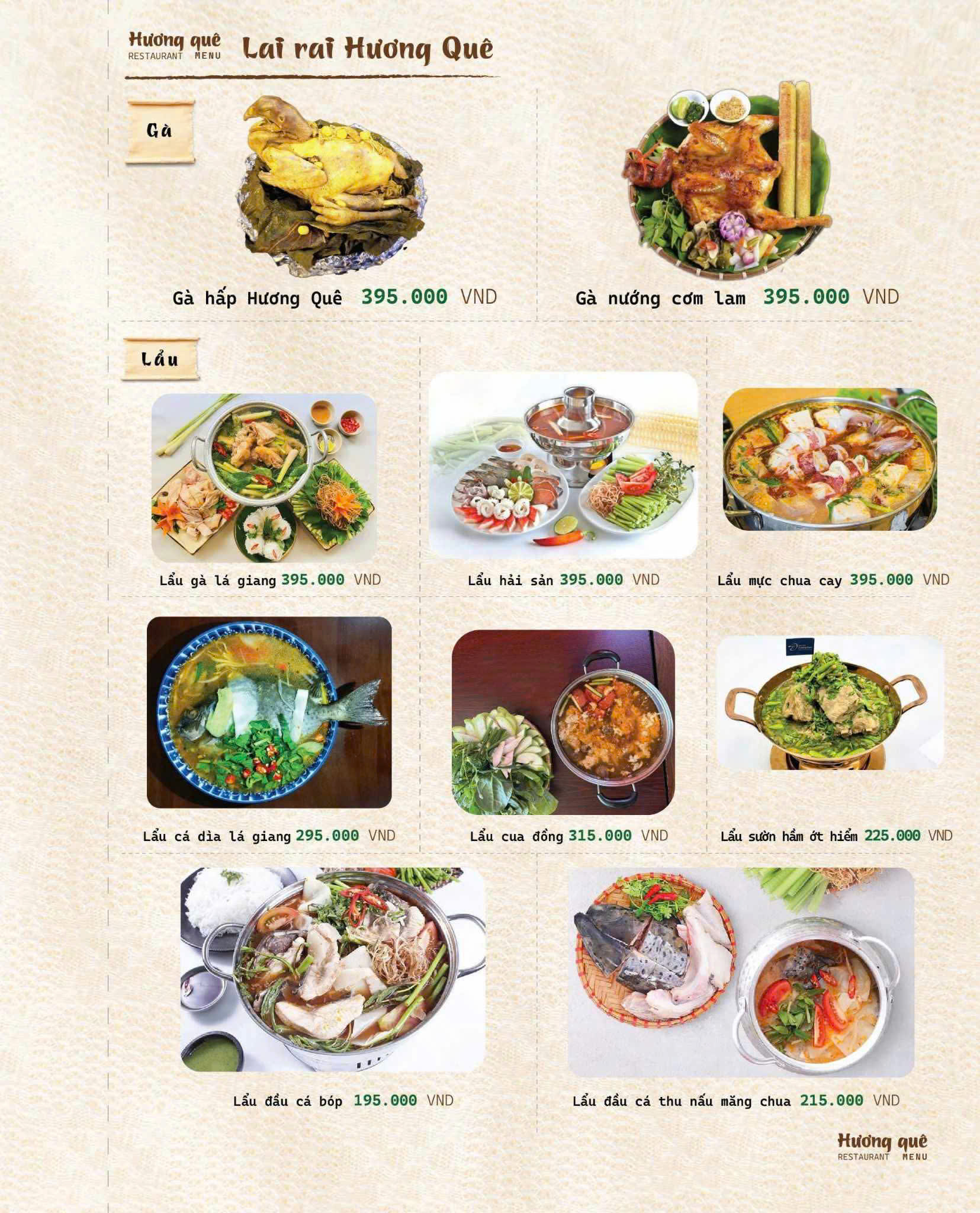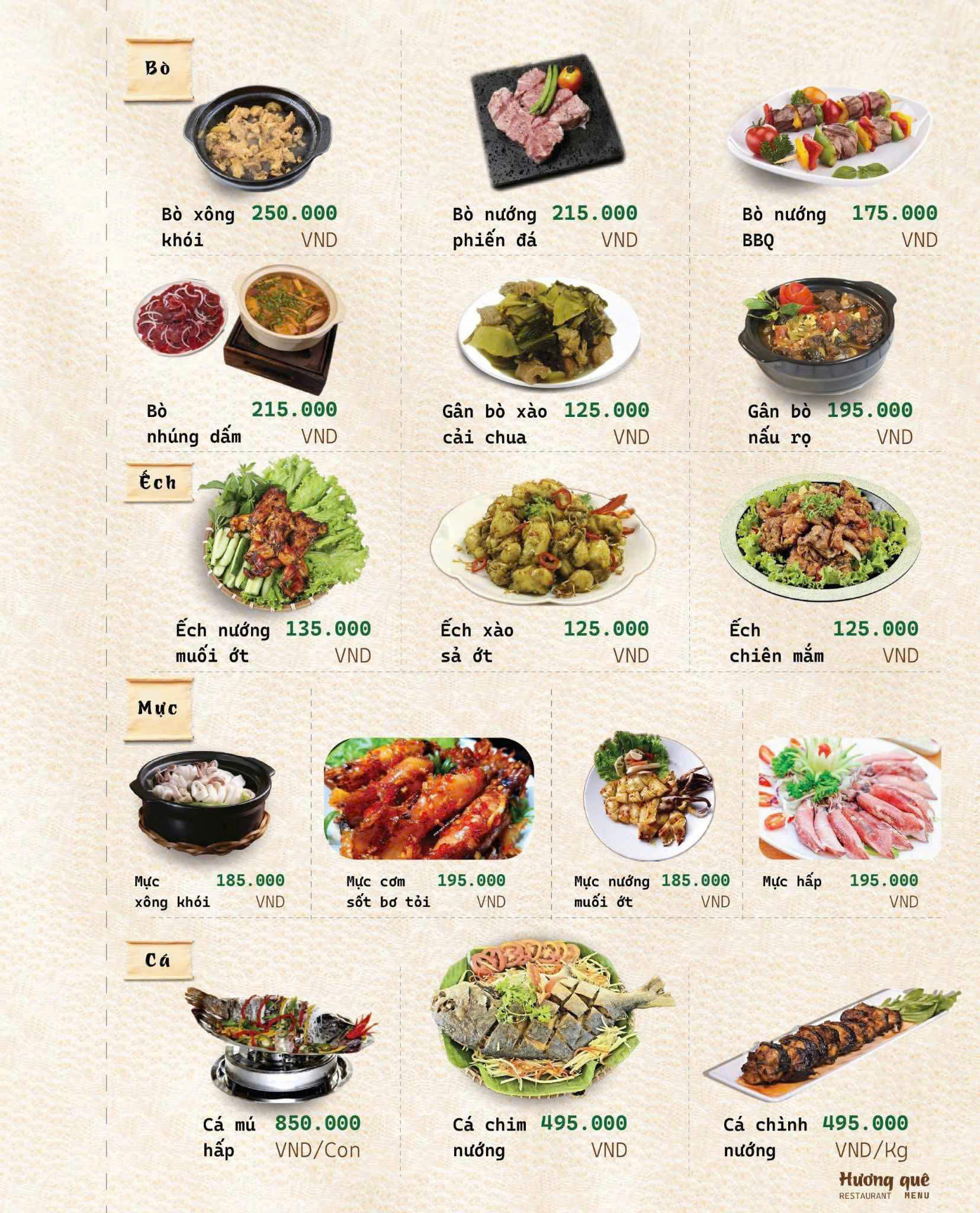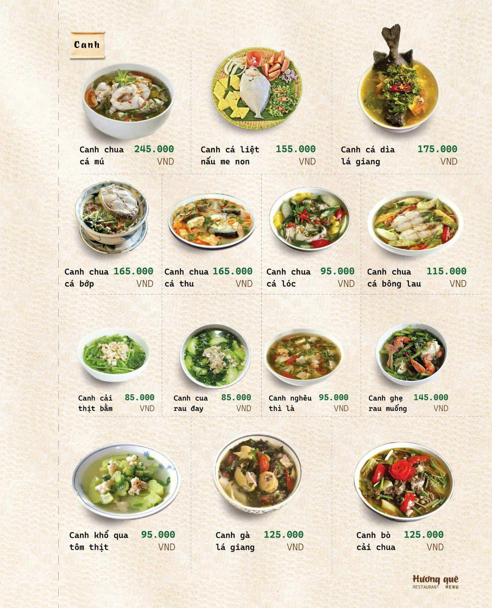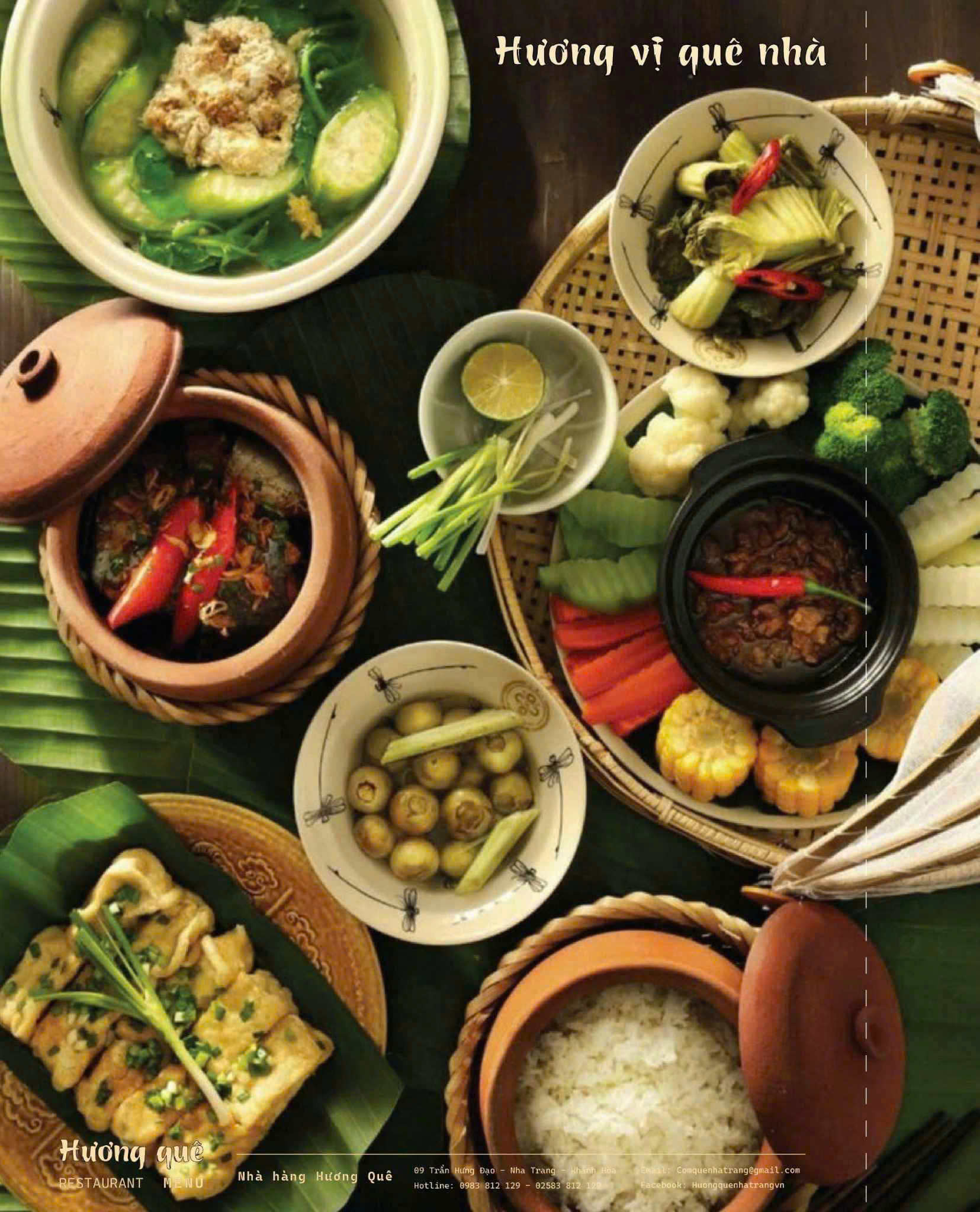 Đúng như tên gọi Hương Quê, thực đơn của nhà hàng là sự chắt lọc tinh túy từ những món ăn thuần Việt, đặc biệt là hương vị đặc trưng của miền Bắc – Trung – Nam.