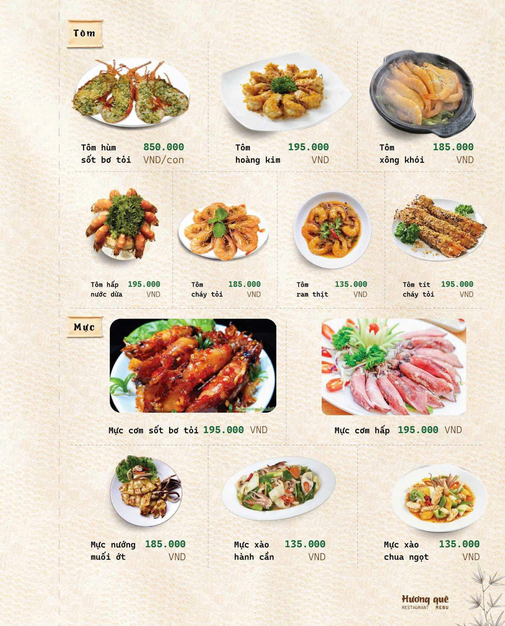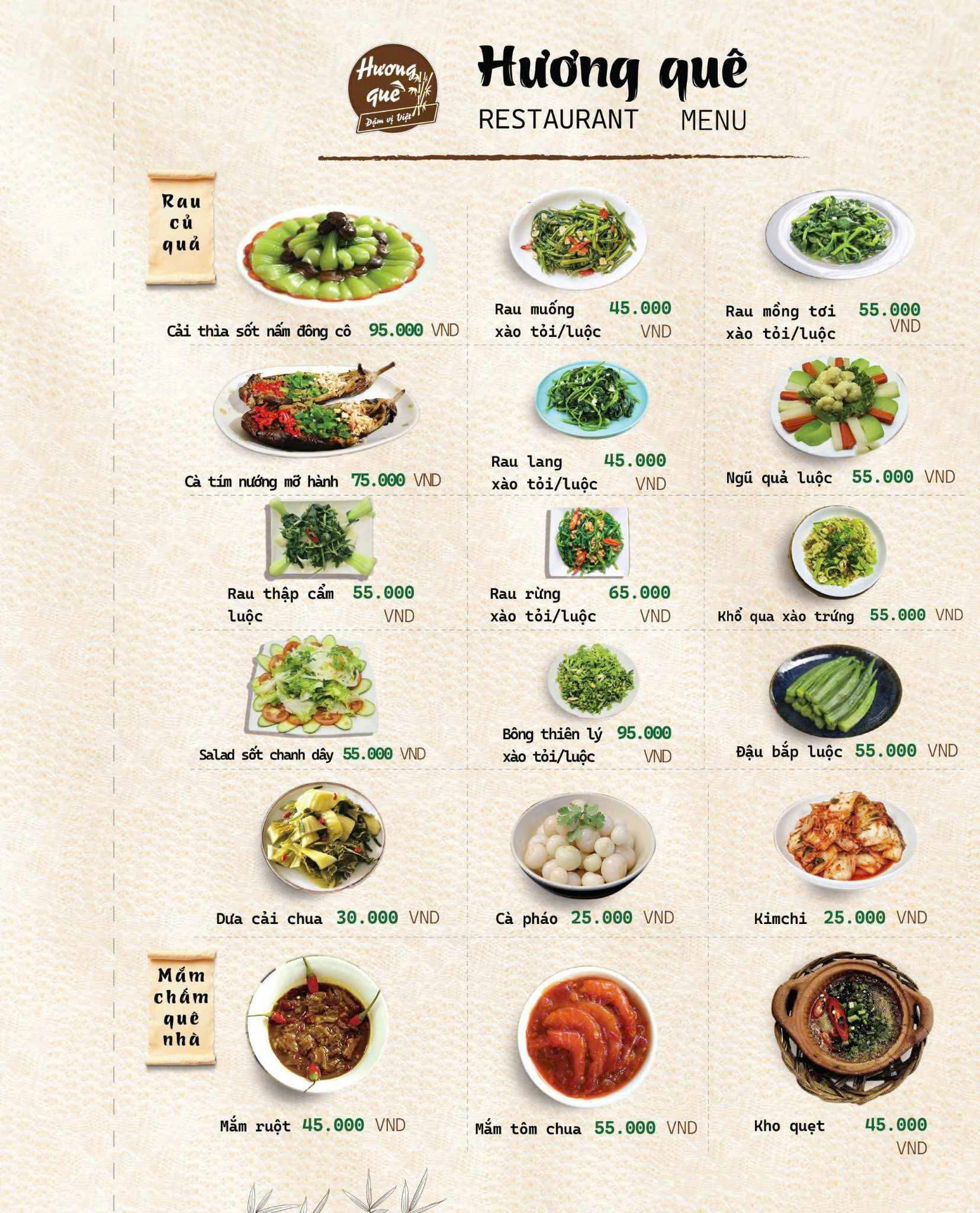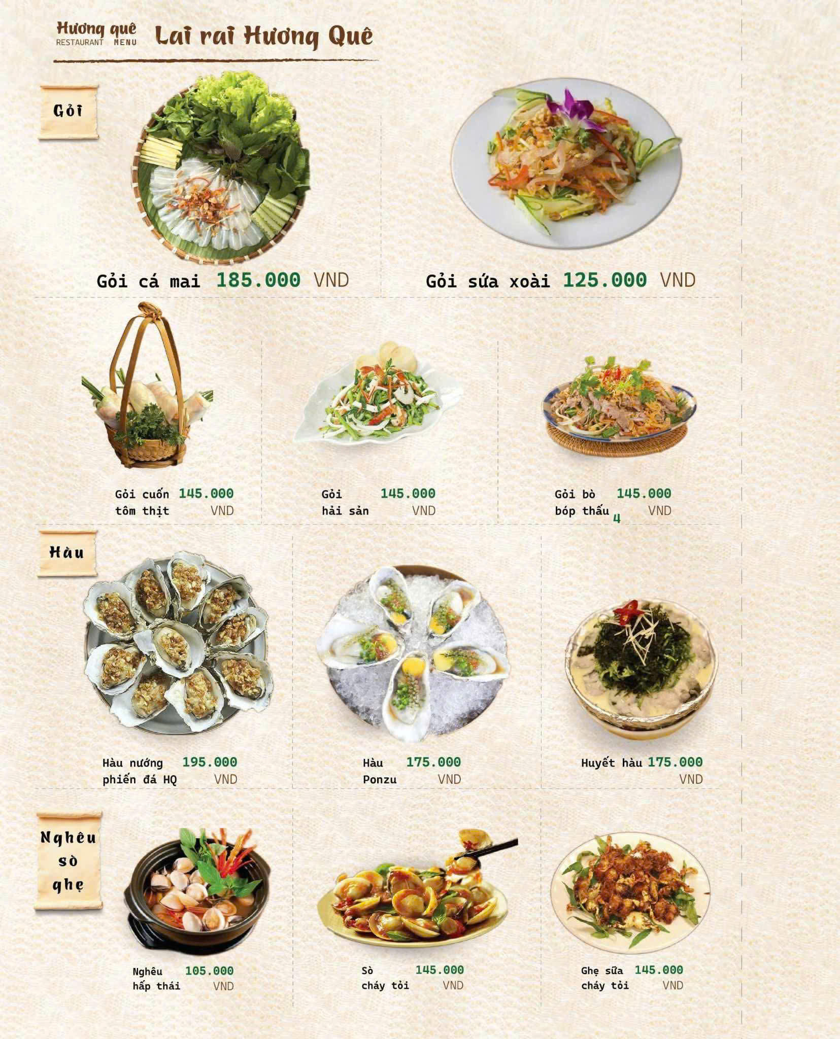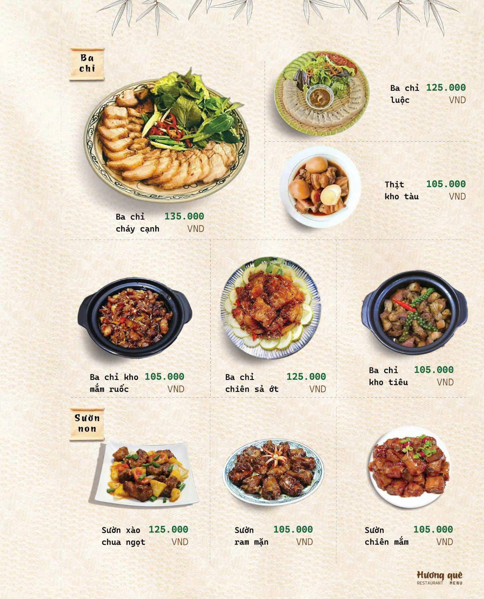 Đúng như tên gọi Hương Quê, thực đơn của nhà hàng là sự chắt lọc tinh túy từ những món ăn thuần Việt, đặc biệt là hương vị đặc trưng của miền Bắc – Trung – Nam.