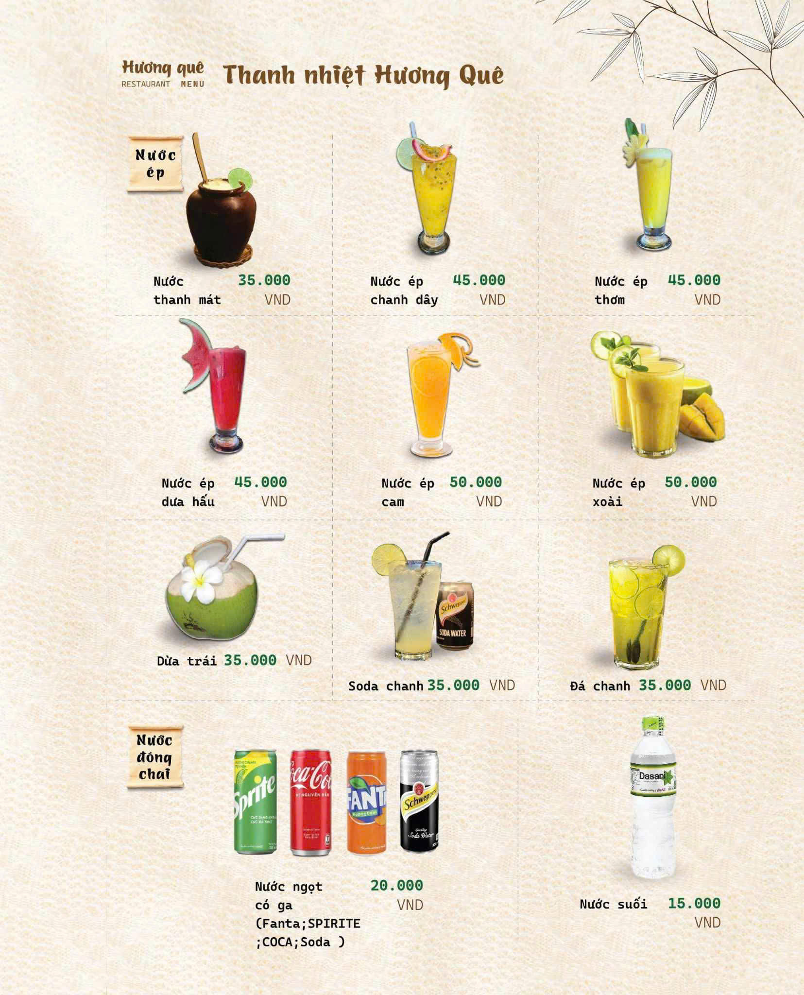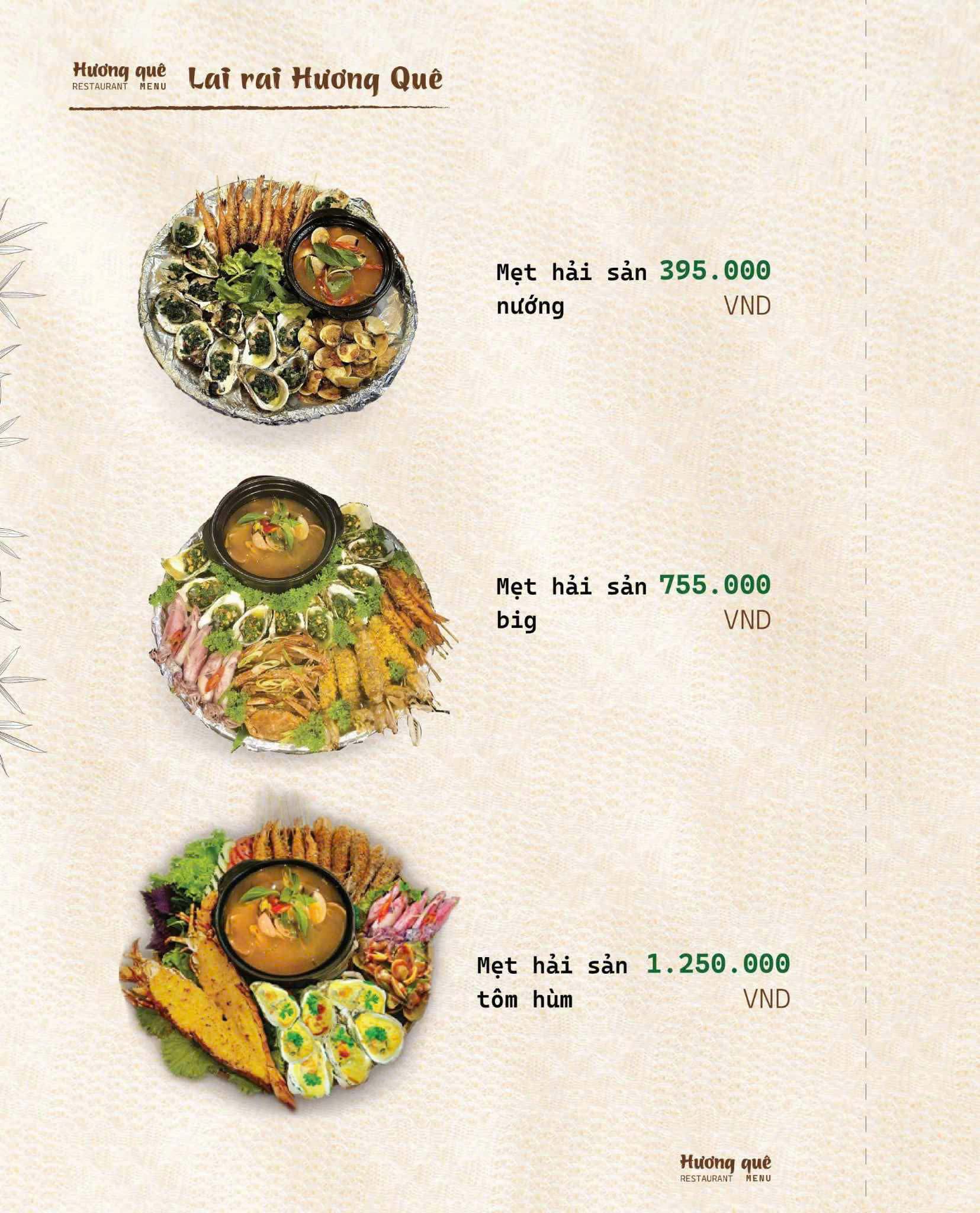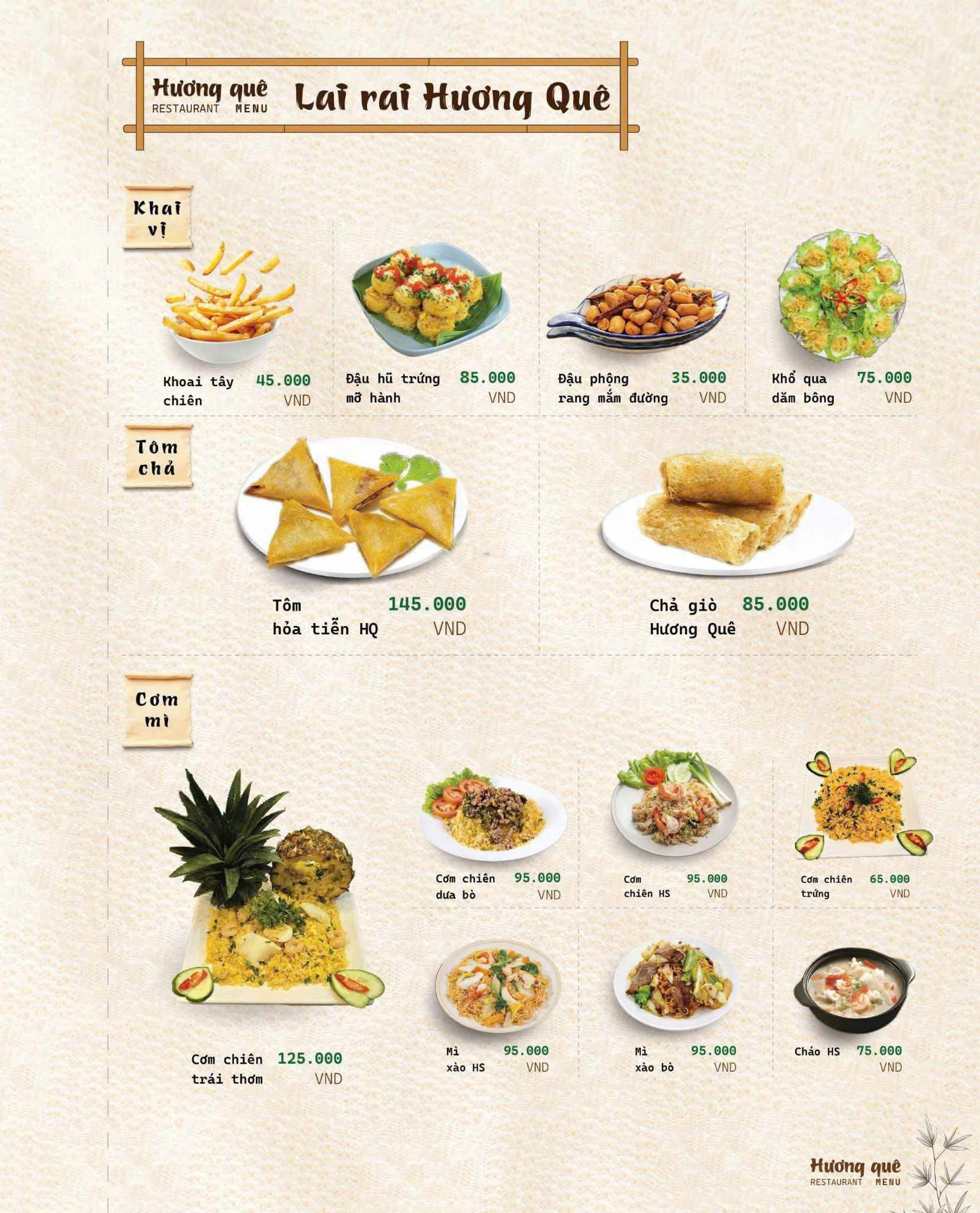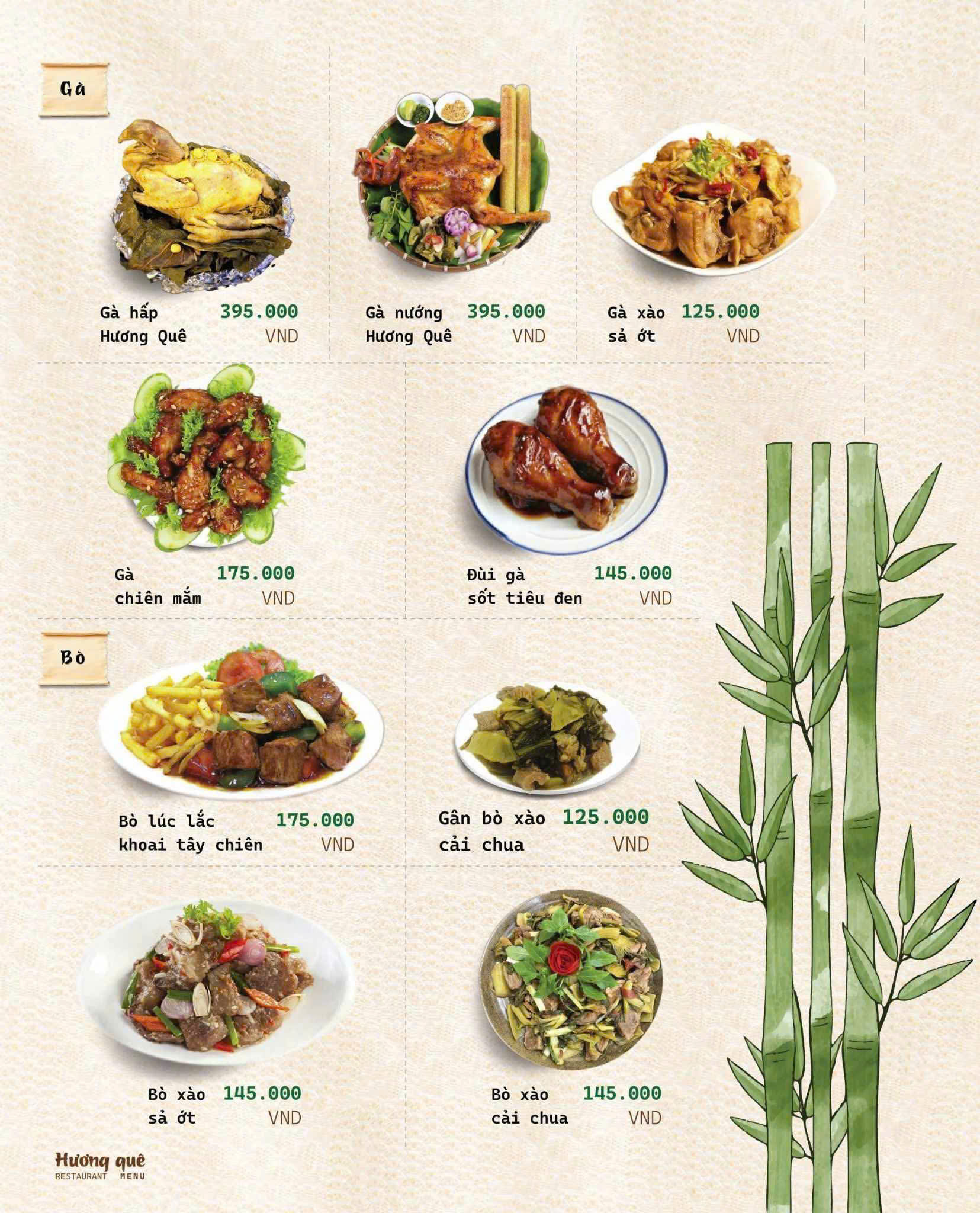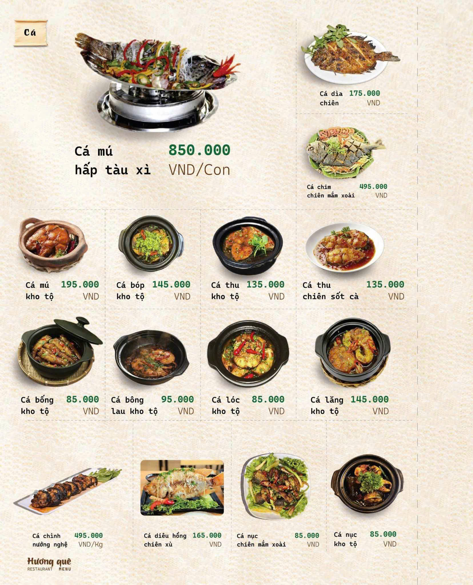 Đúng như tên gọi Hương Quê, thực đơn của nhà hàng là sự chắt lọc tinh túy từ những món ăn thuần Việt, đặc biệt là hương vị đặc trưng của miền Bắc – Trung – Nam.