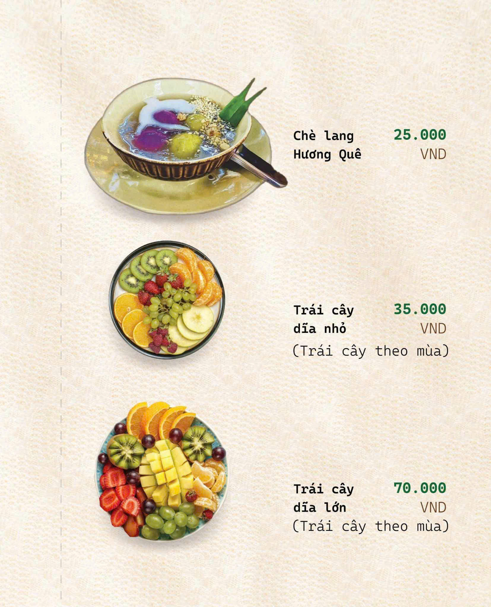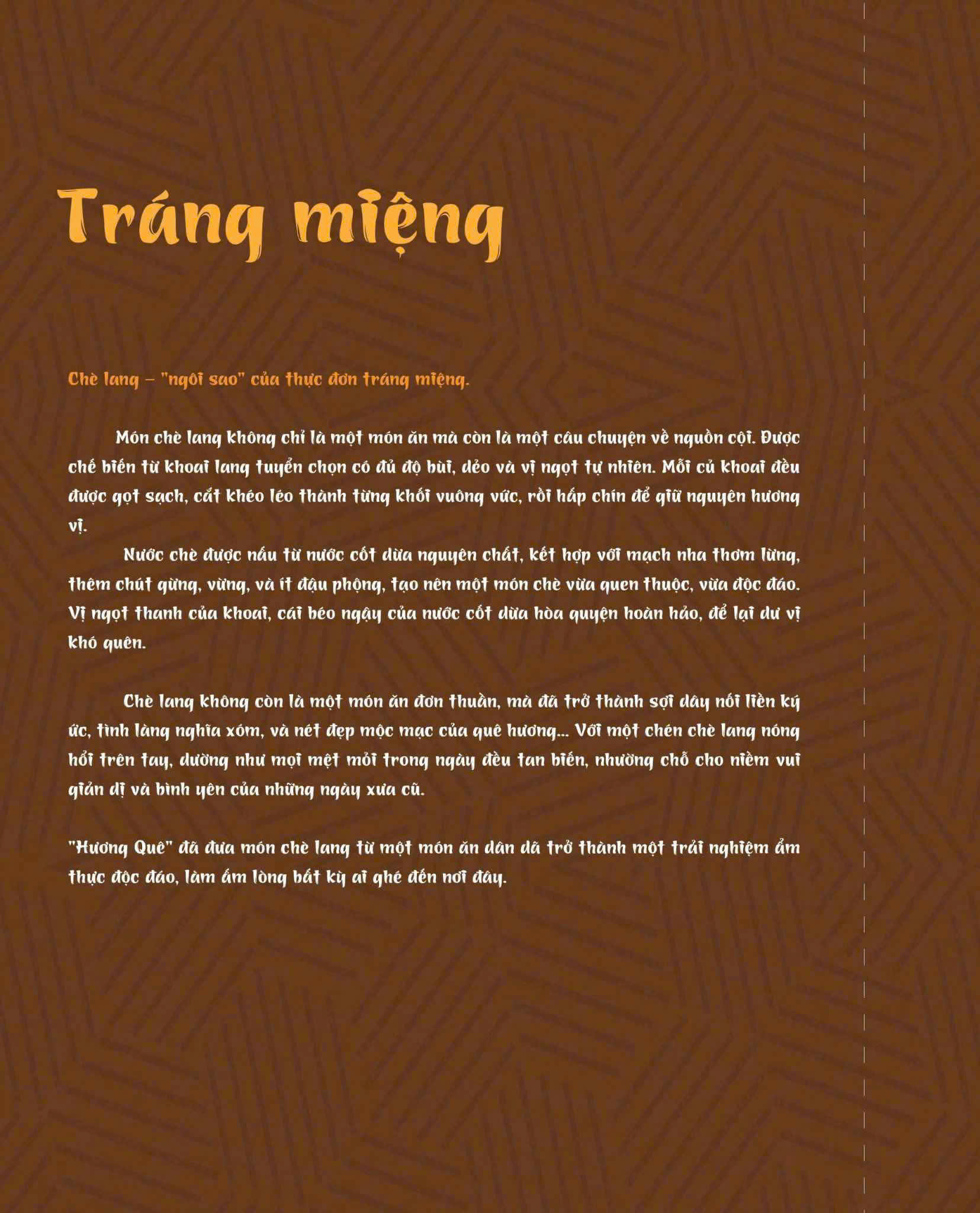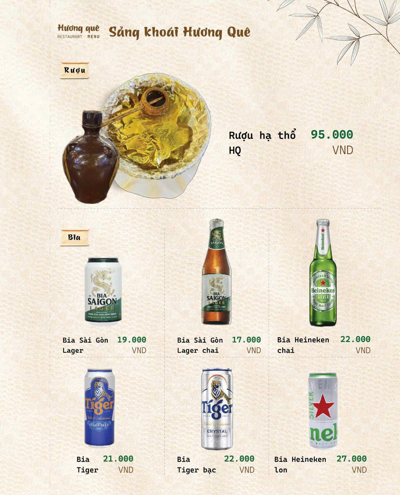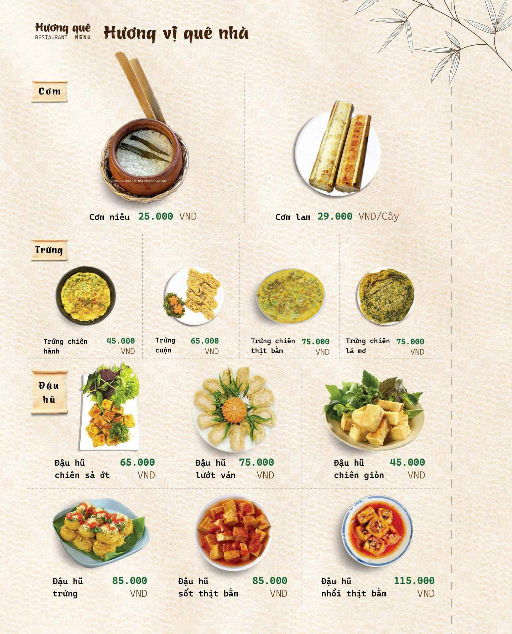 Đúng như tên gọi Hương Quê, thực đơn của nhà hàng là sự chắt lọc tinh túy từ những món ăn thuần Việt, đặc biệt là hương vị đặc trưng của miền Bắc – Trung – Nam.