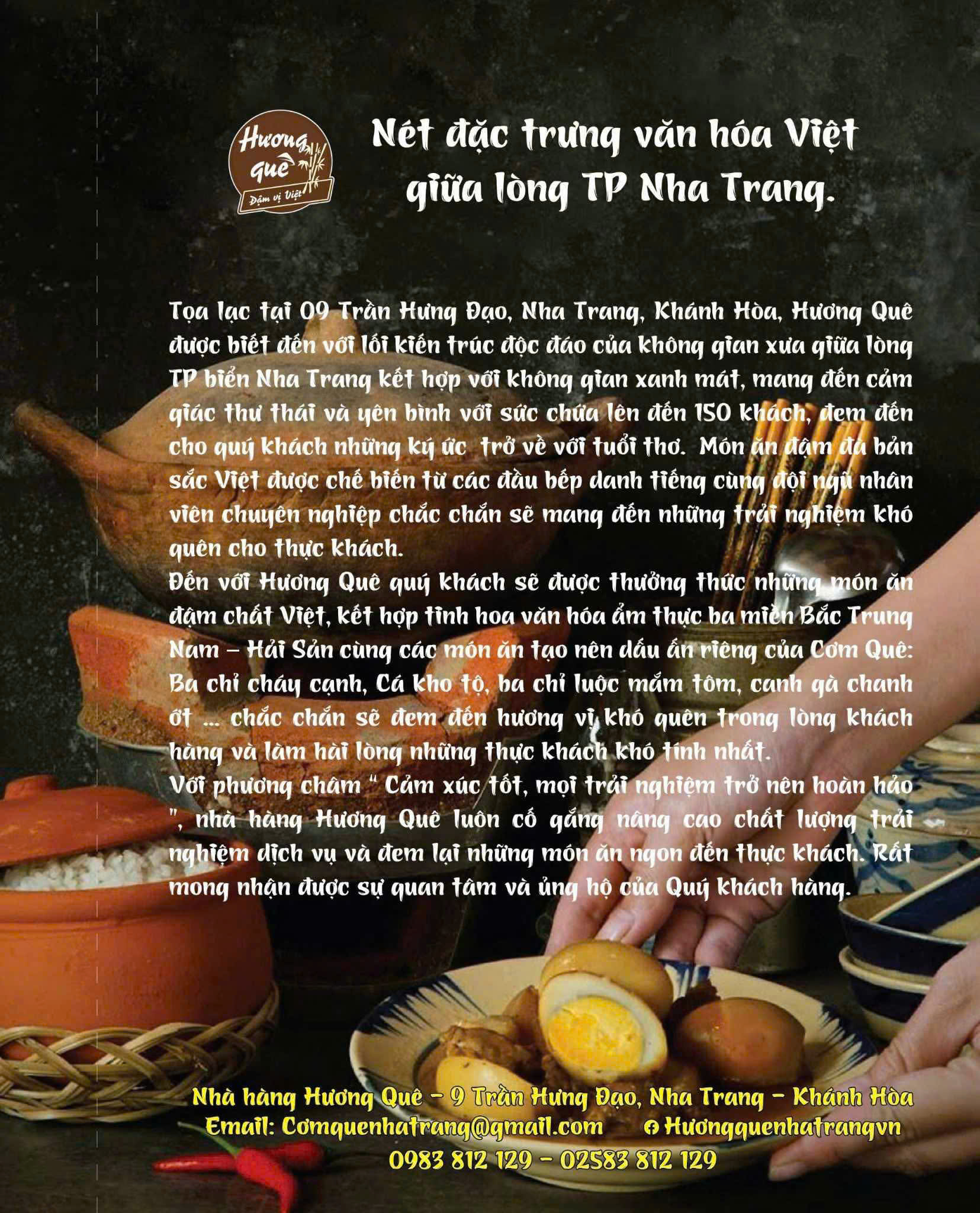 Mỗi bữa ăn là một chút quê hương, một chút bình yên giữa thành phố du lịch náo nhiệt. Về nhà với cơm quê giữa lòng phố biển – Mời bạn đến với Nhà hàng Hương Quê Nha Trang, nơi bữa ăn không chỉ ngon mà còn đầy yêu thương. Đừng quên gọi ngay 0913515351 để được tư vấn miễn phí và đặt bàn nhanh chóng nhé!