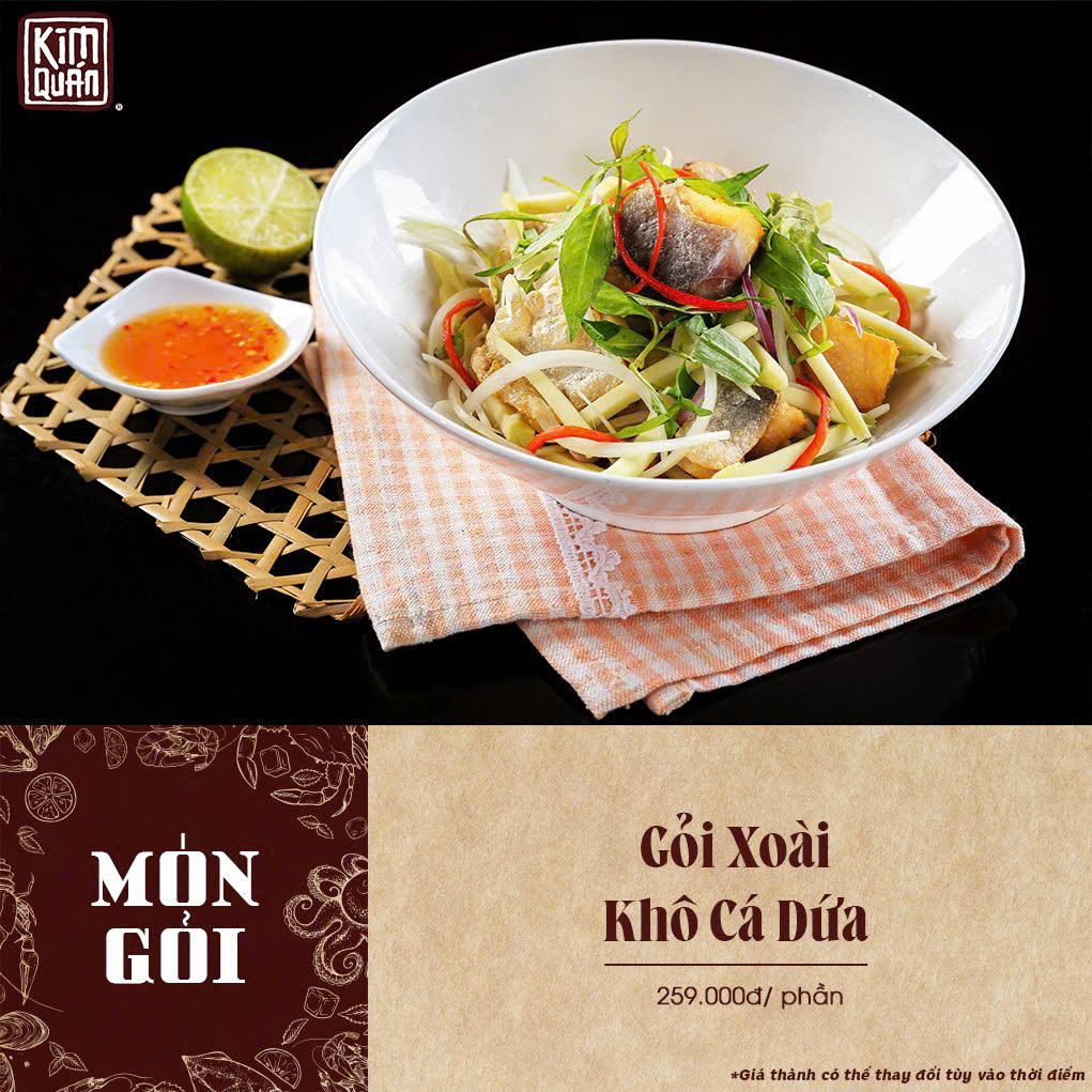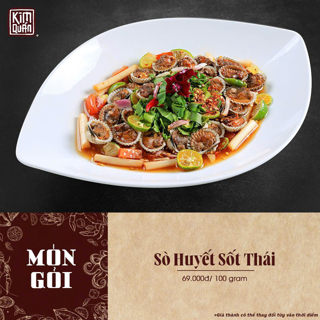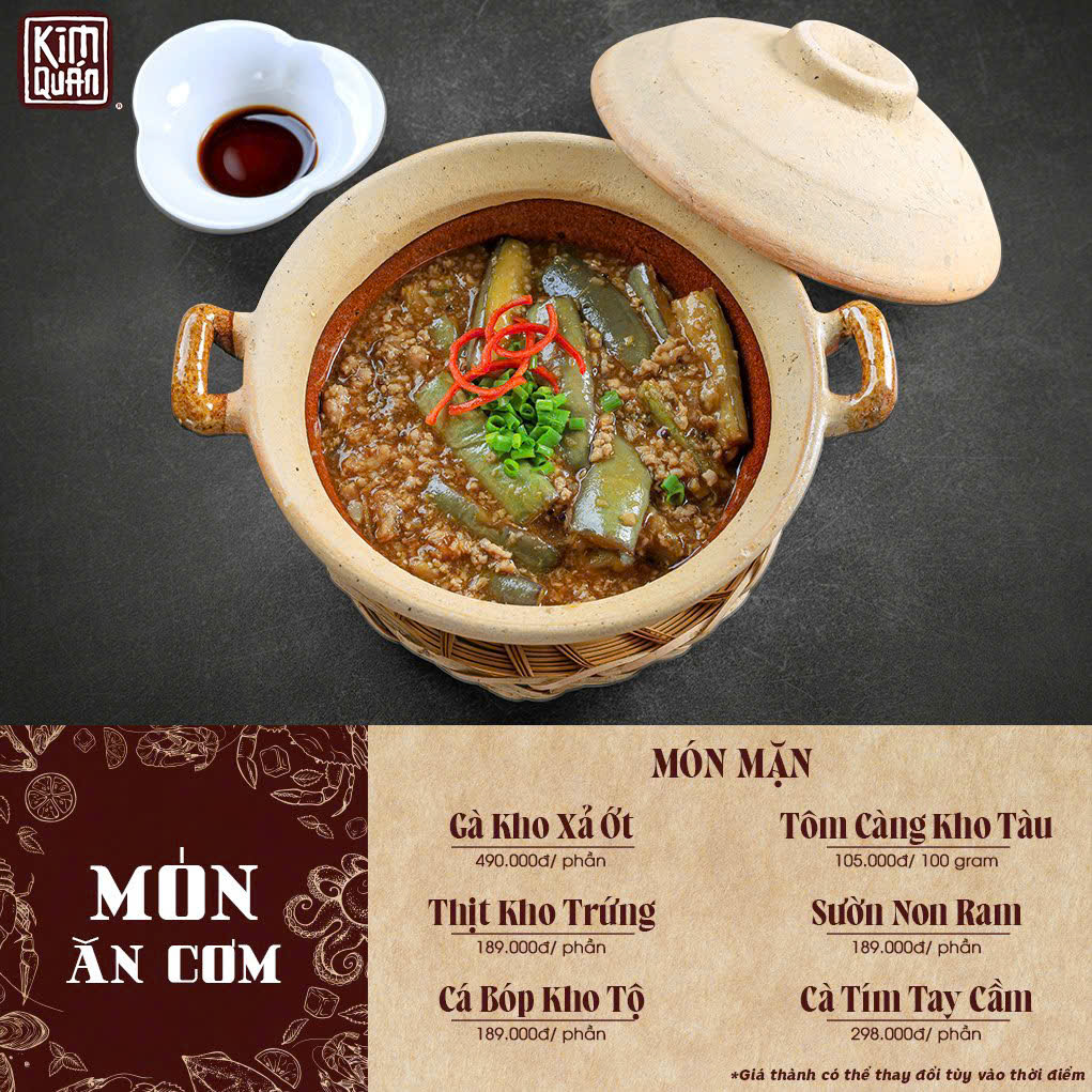 Thục đơn của Kim Quán vô cùng phong phú, đa dạng với hàng chục món ăn khác nhau. Tuy nhiên, khác với nhiều nhà hàng khi sử dụng nhiều nguyên liệu khác nhau. Thì nhà hàng Kim Quán đi chuyên sâu về các món hải sản.